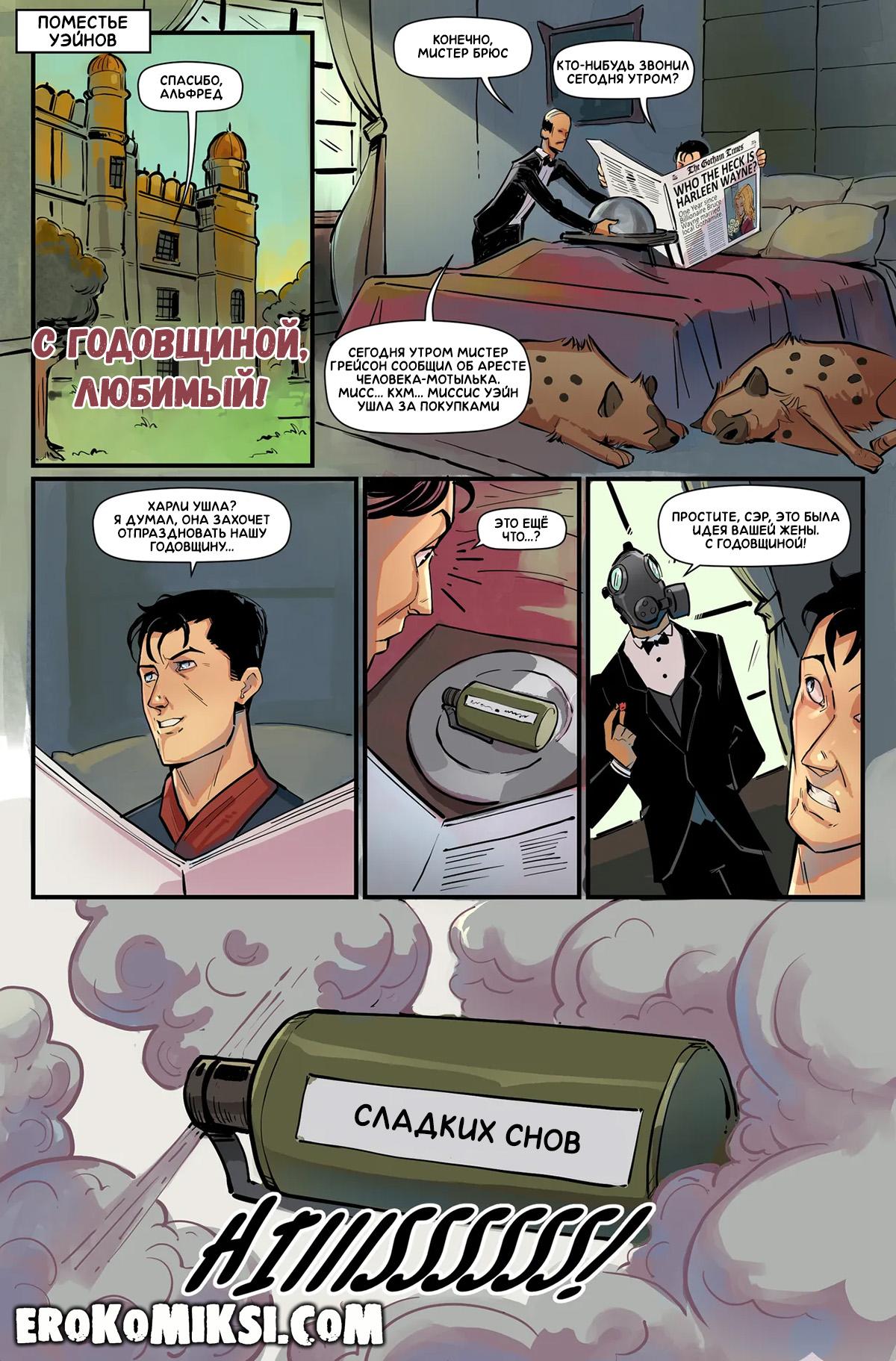 Порно комикс Бэтмен. С годовщиной, любимый! Бэтмен и Харли Квин женаты уже целый год, и Харли решила поздравить любимого мужа в своём стиле. Она привязала Брюса к кровати и оседлала его, однако, она забыла, что её муж супергерой, который с лёгкостью избавился от верёвок и взял инициативу в свои руки, и начал трахать свою любимую Харли…