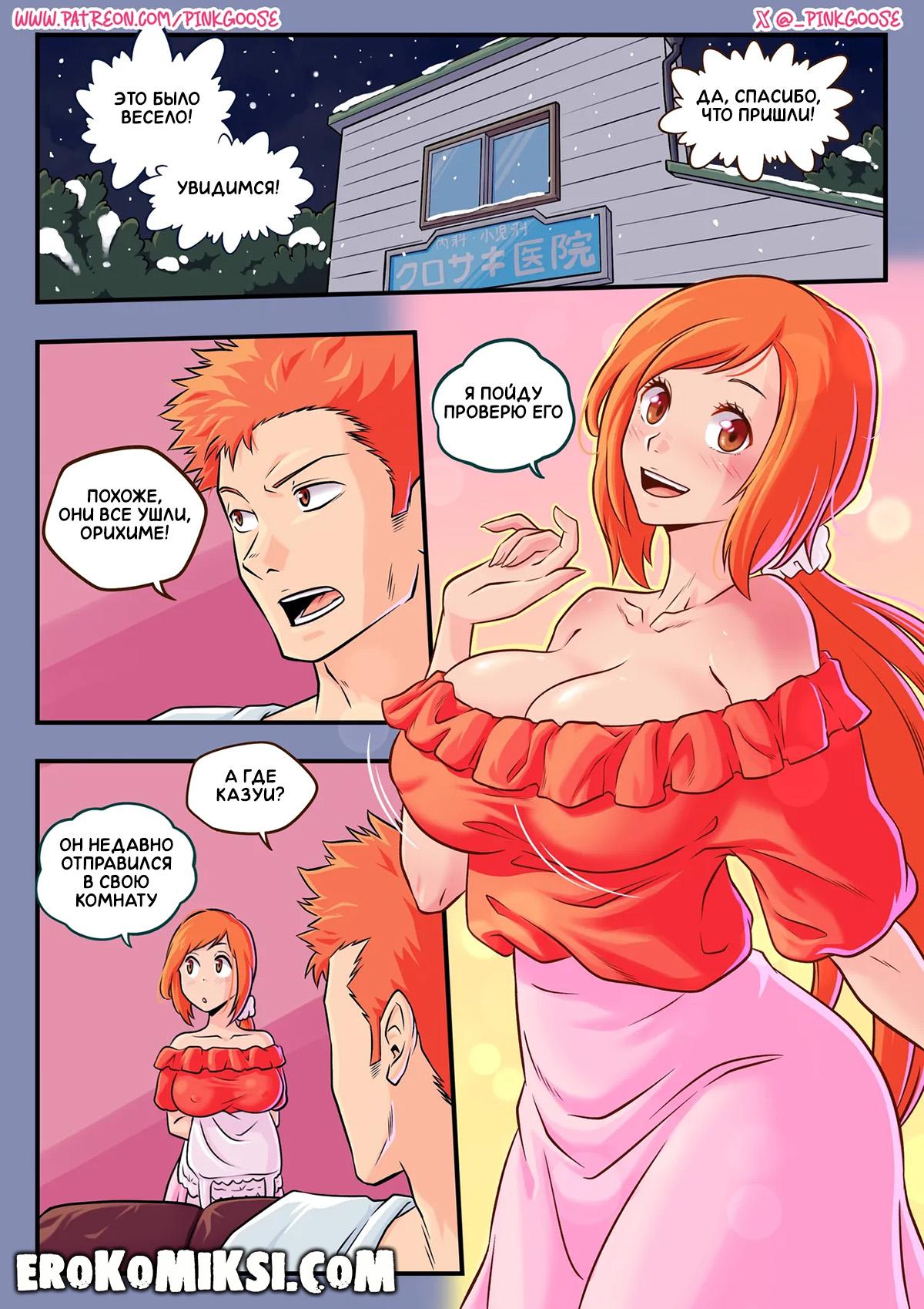 Порно комикс Bleach. Ночное шоу. У Орихиме и Ичиго были гости, и когда они ушли, Ичиго начал приставать к жене, которая весь вечер была без лифчика и трясла своими огромными сиськами, тем более, он знал, что их сосед следит за ними и решил устроить ему незабываемое шоу, и как следует оттрахал красавицу Орихиме…