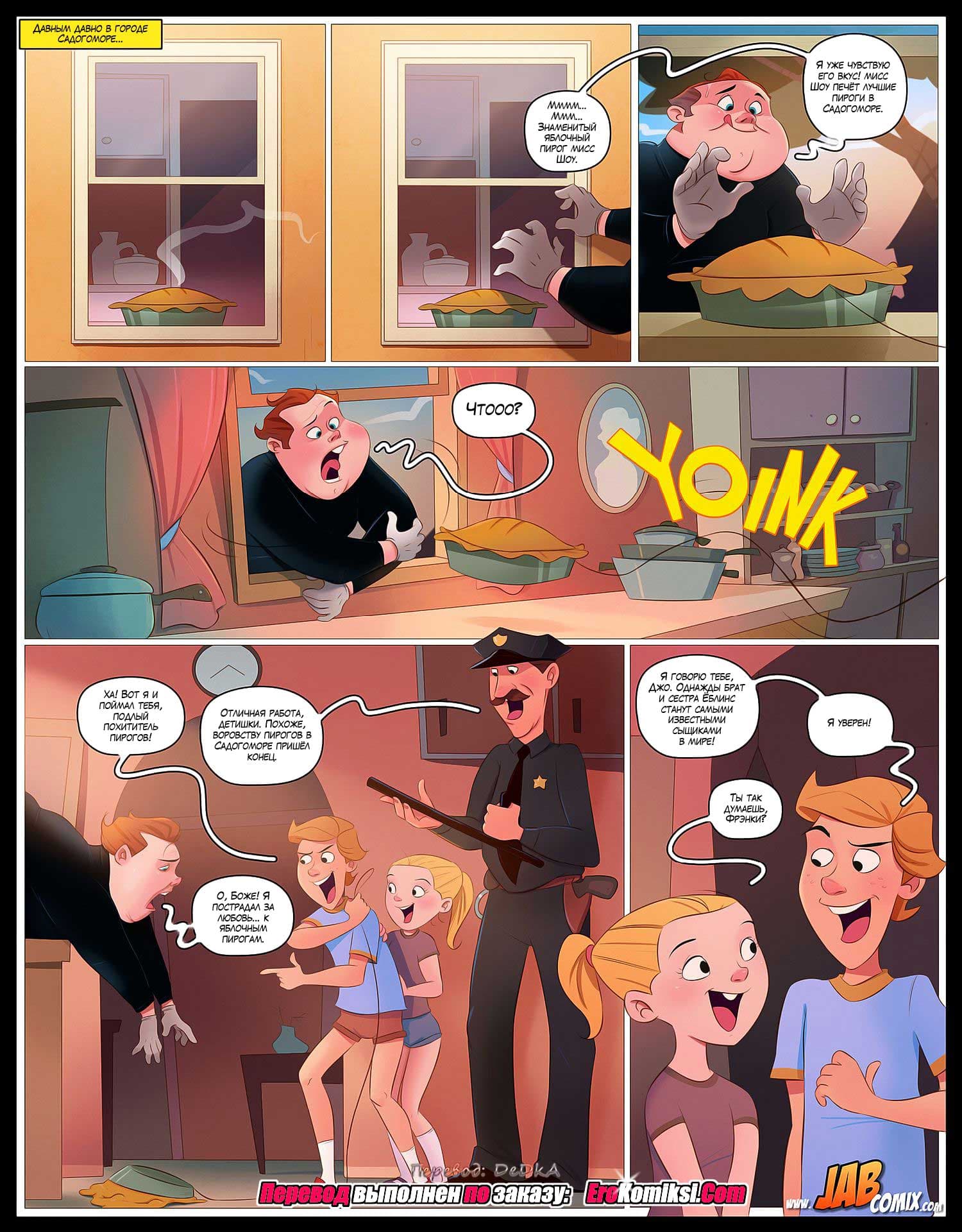 В тихом городе со скромным названием Садогомора завёлся неуловимый похититель яблочных пирогов. Город так бы и страдал от проделок вора, если бы брат и сестра Ёблинс не поймали его на живца. Они выставили на столе у открытого окна свежий, ароматный яблочный пирог и засели в засаду. В эту ловушку и попался вор. Им оказался местный священник. После такого успеха, брат и сестра Ёблинс решили, что когда они вырастут, то станут лучшими сыщиками Садогоморы…