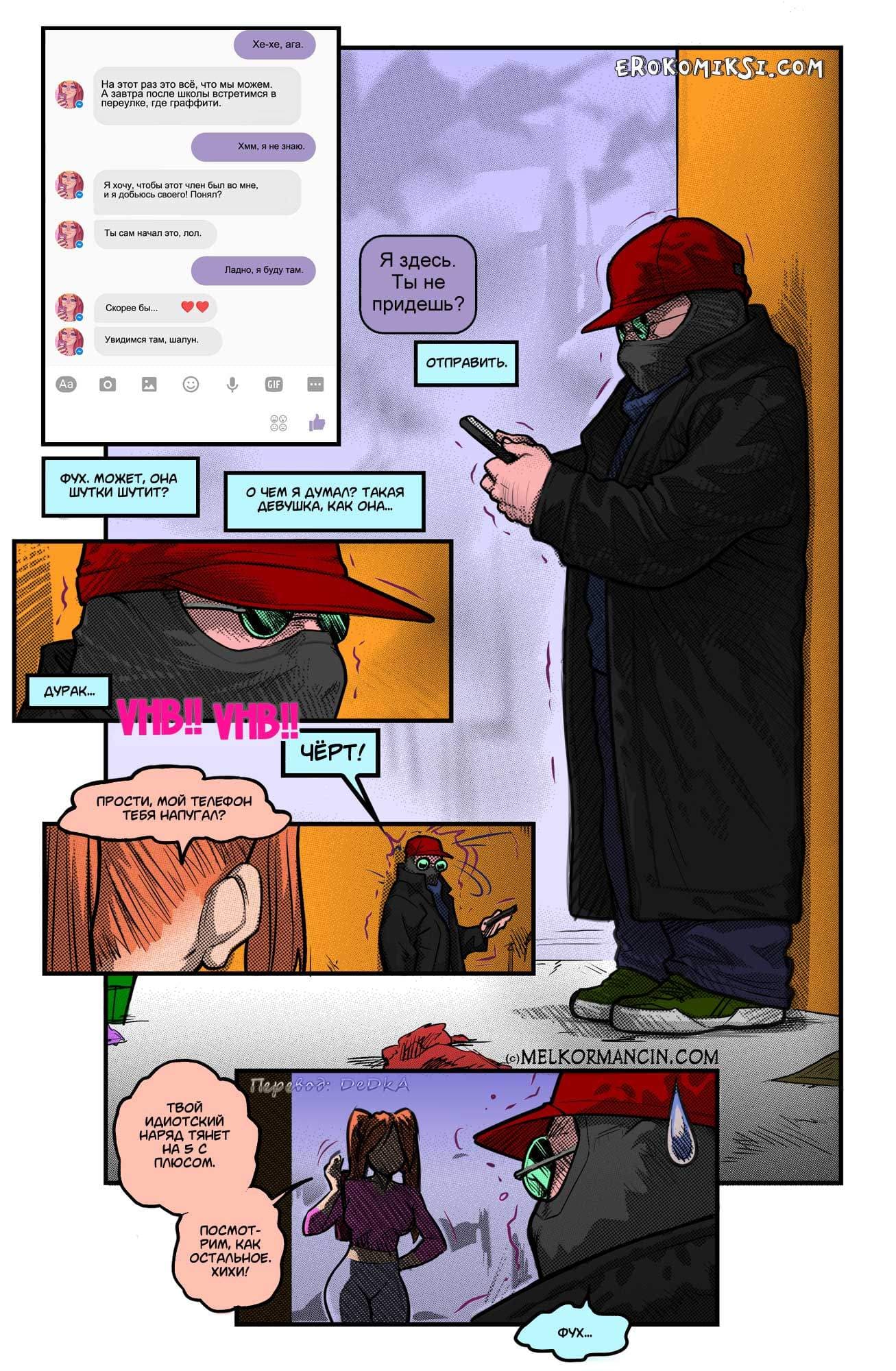 Порно комикс Чат с Хлоей 2 начинается с того, что в прошлой части Хлоя договорилась в чате о встрече с незнакомцем, который показал ей свой огромный член, но не показал лицо. «Незнакомец», который прекрасно знал Хлою, не хотел, чтобы она при встрече узнала его. Поэтому в этой части комикса он отправился на встречу с Хлоей, замаскировавшись, как только можно. Но… Хлоя не из тех, кого может обмануть любой простак!