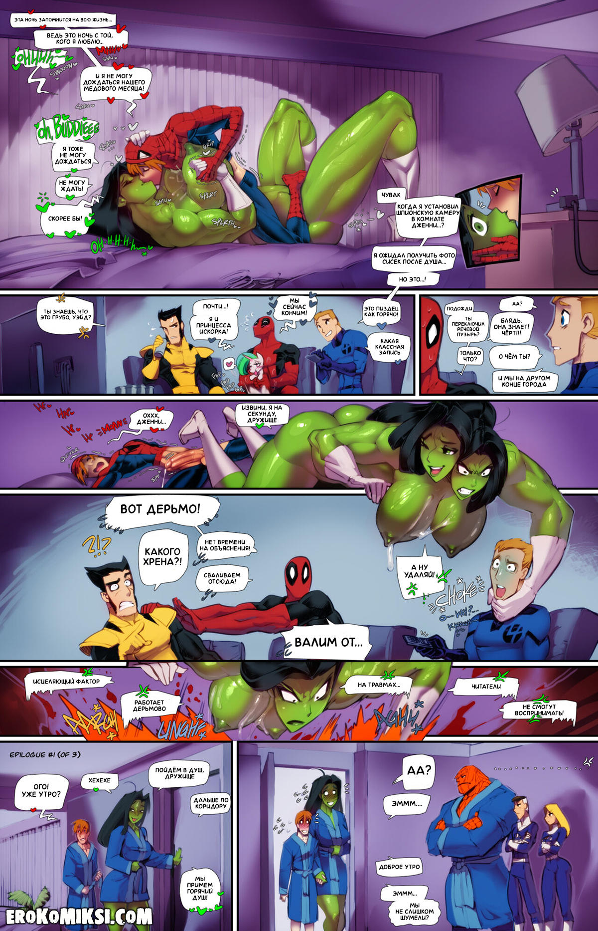Порно комикс Человек-Паук и Женщина-Халк. Шумные соседи. Женщина-Халк очень переживает из-за того, что она отличается от других женщин и все мужчины над ней смеются, и уж тем более, совсем не смотрят на неё как на женщину. Лишь один Человек-Паук обратил на неё внимание и теперь, она точно не упустит возможности, как следует с ним позабавиться…