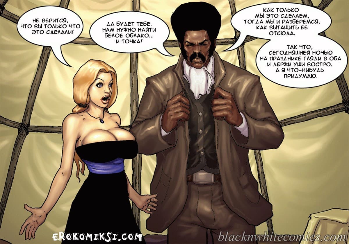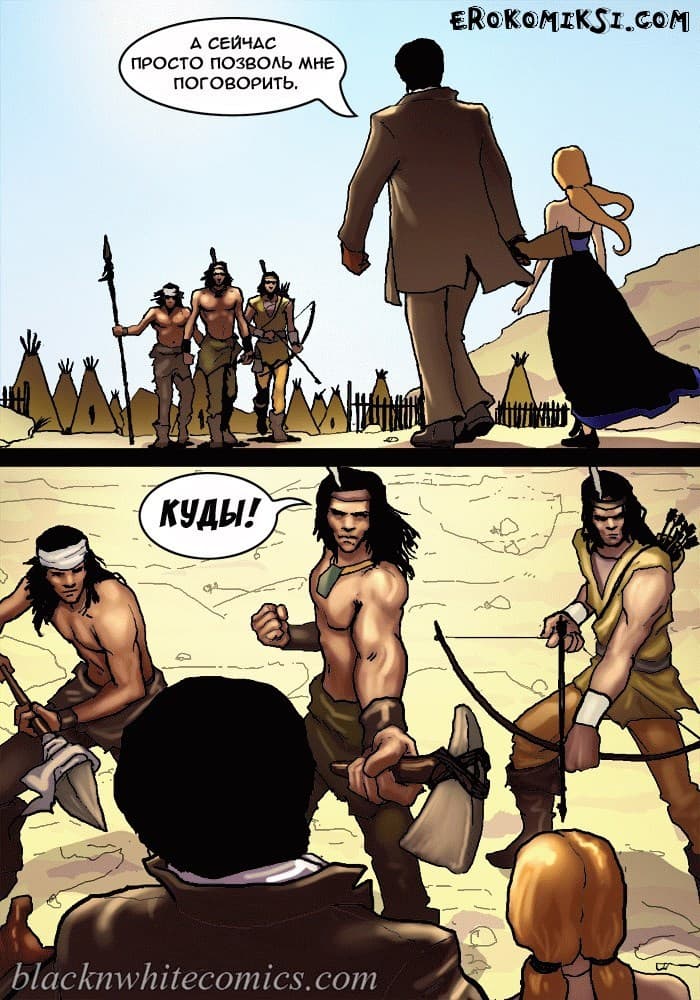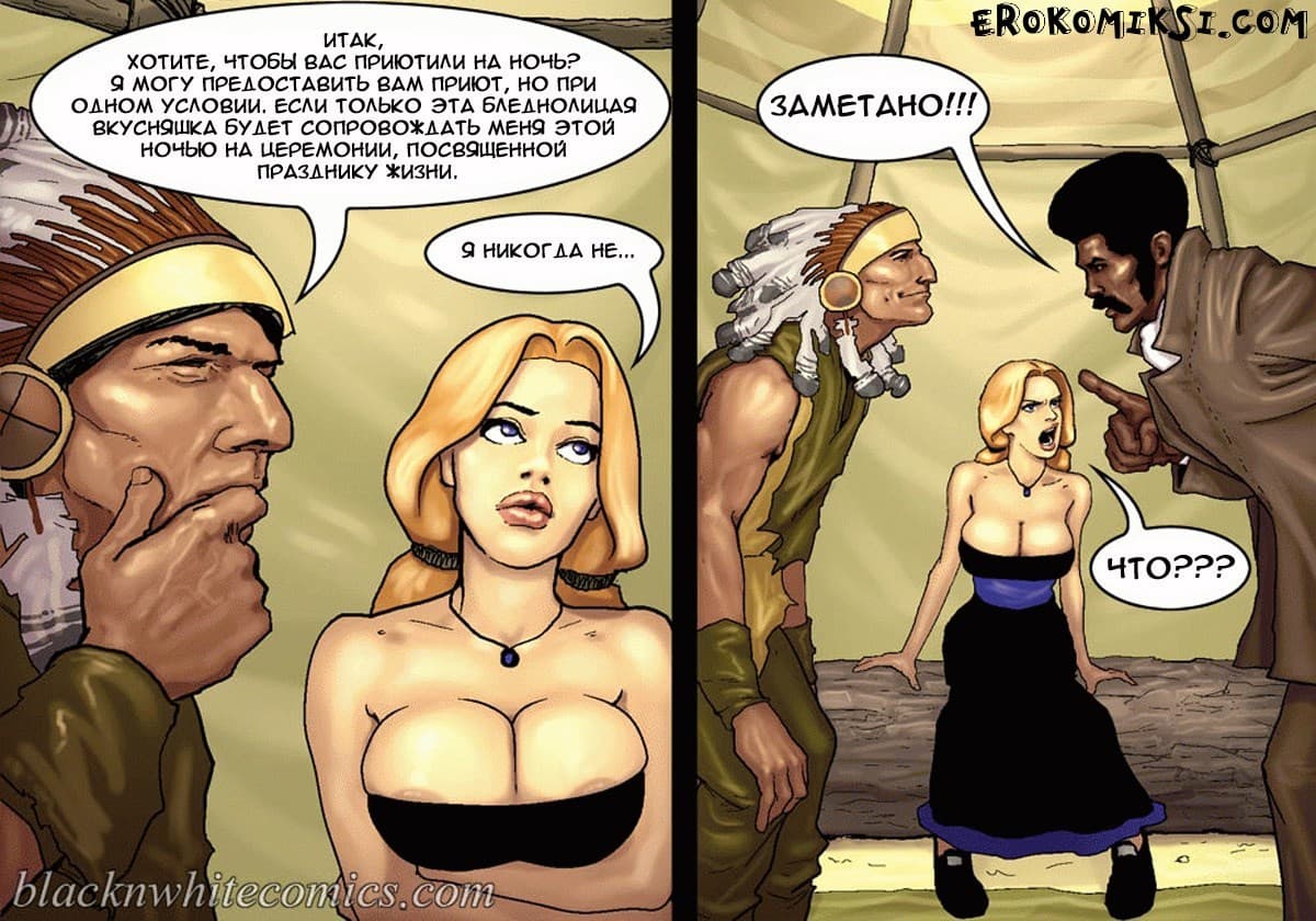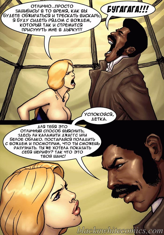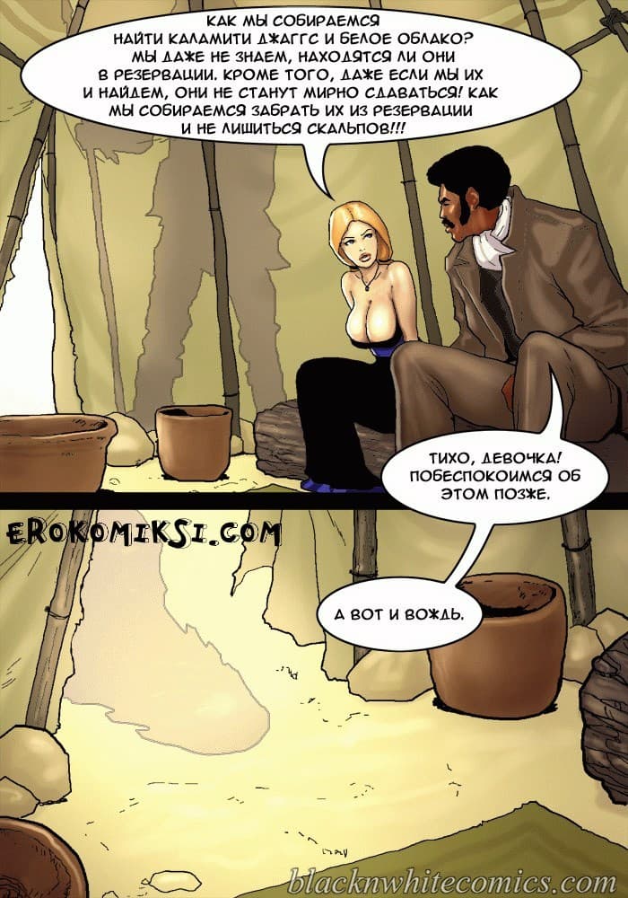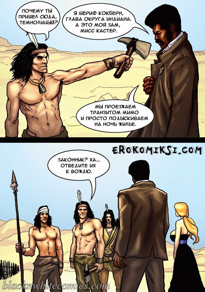 Порно комикс честный коп продолжается, и 2 часть данного произведения начинается с того, что, охотясь за предполагаемой соучастницей банды Каламити Джаггс под кличкой «Белое облако» шериф Рустер Кокберн и его сопровождающая девушка, ищущая возмездия Сенека Кастер пребывают в индейскую резервацию. Там чернокожий коп намерен допросить Белое облако, но сделать это будет не просто, потому что у вождя индейцев возникают свои планы на Сенеку. Но шериф умный блюститель закона, и в обиду своих людей не даст, да и вывести на «чистую воду» может любую шлюху, если вгонит в нее свой черный член, который сравним с огромной анакондой…