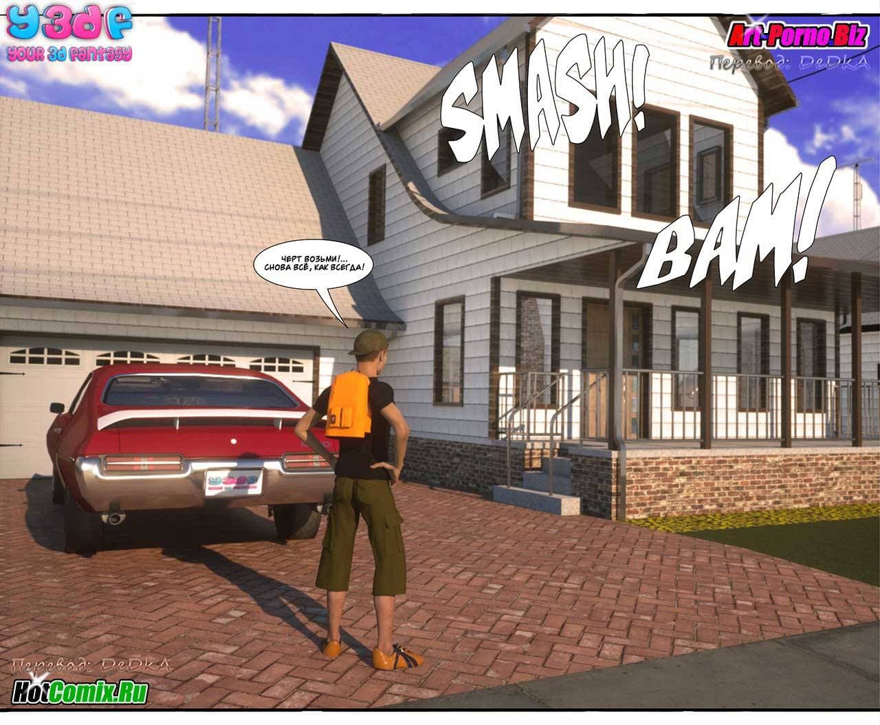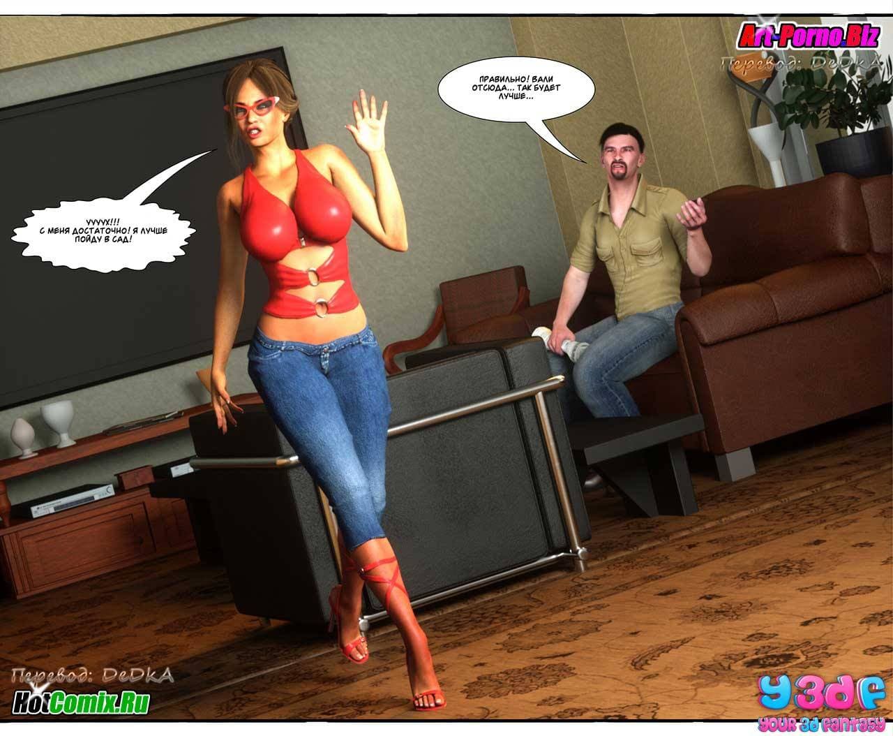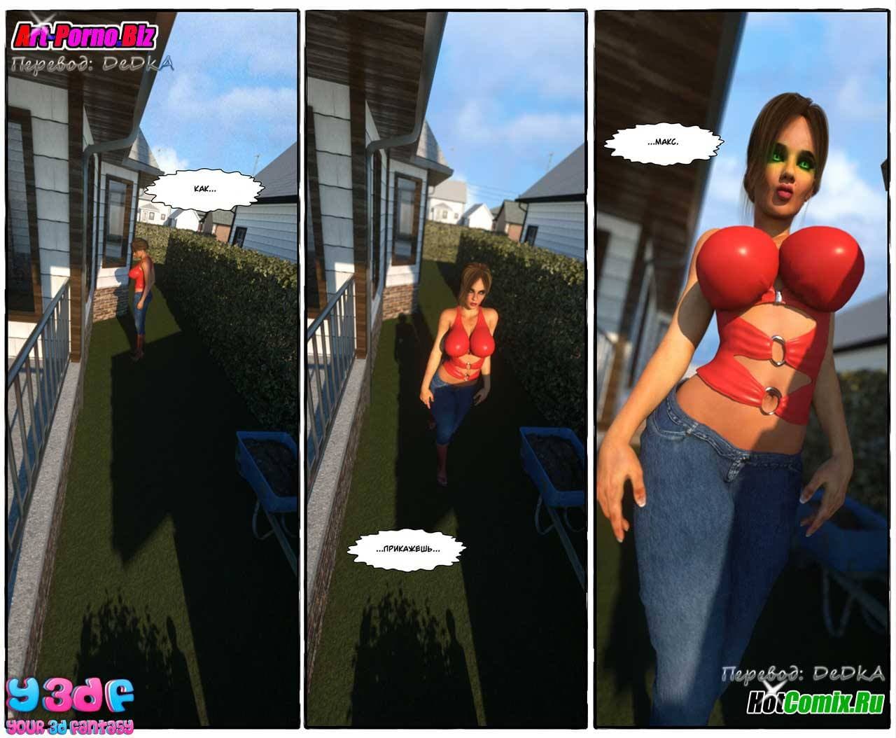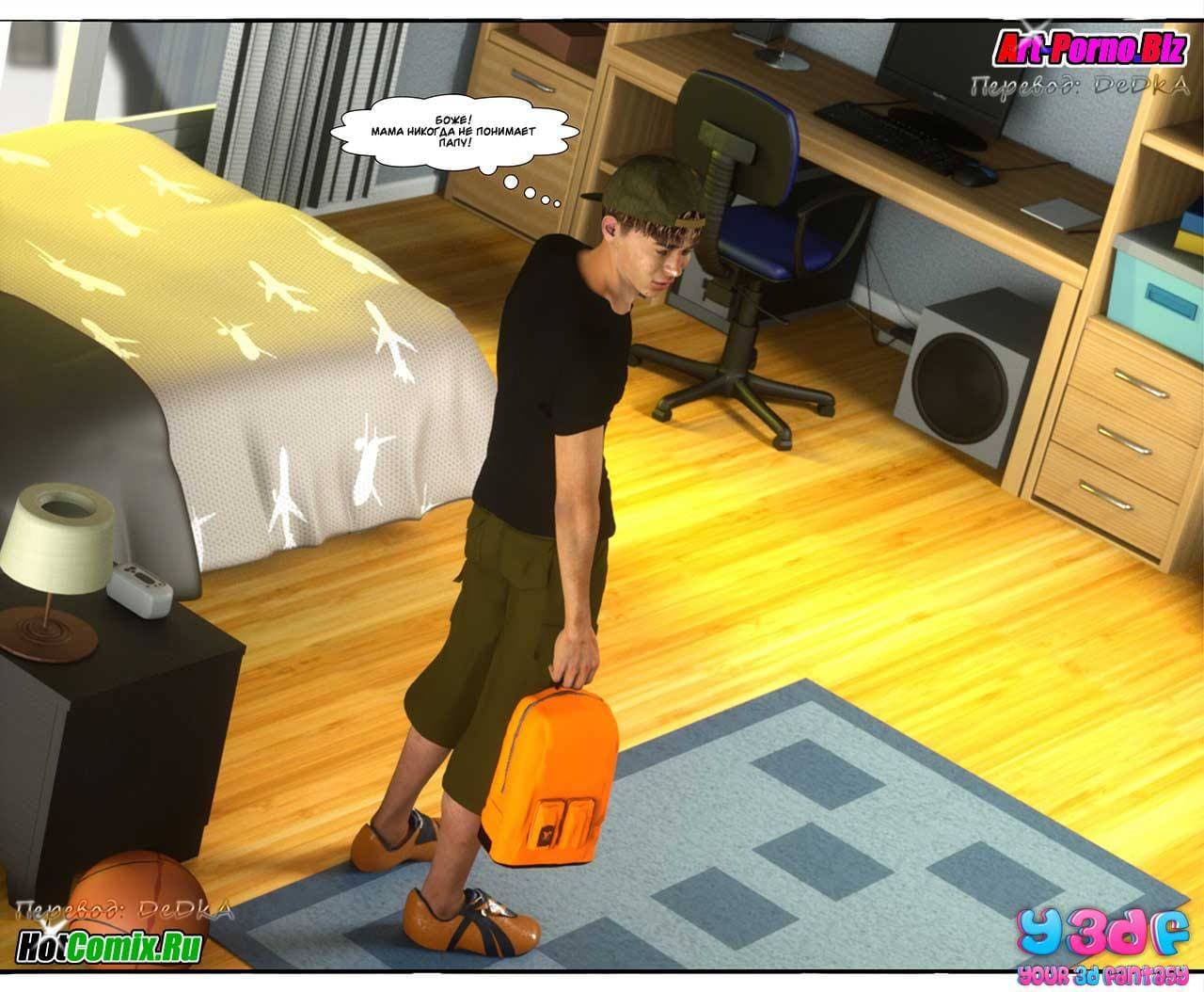 Ценителям, обожающим секс комиксы 3д, предлагаем крайне возбуждающую историю, которая начинается с того, что Макс, подходя к своему дому, уже издали стал слышать ссору между родителями. Что же на этот раз они не поделили между собой. Как оказалось, сексуальная мамаша требовала от мужа полноценного полового акта, от которого, она, наконец, получит долгожданное удовольствие. Отец Макса был не против, но сказал, что в данный момент он не хочет, а вечером все будет. Только вот, возбужденной женщине нужно сейчас, а терпеть не охота…