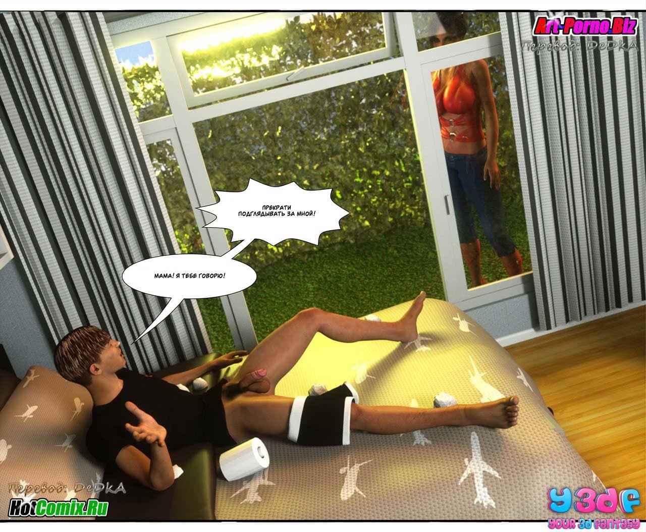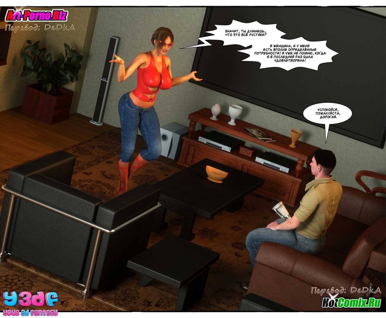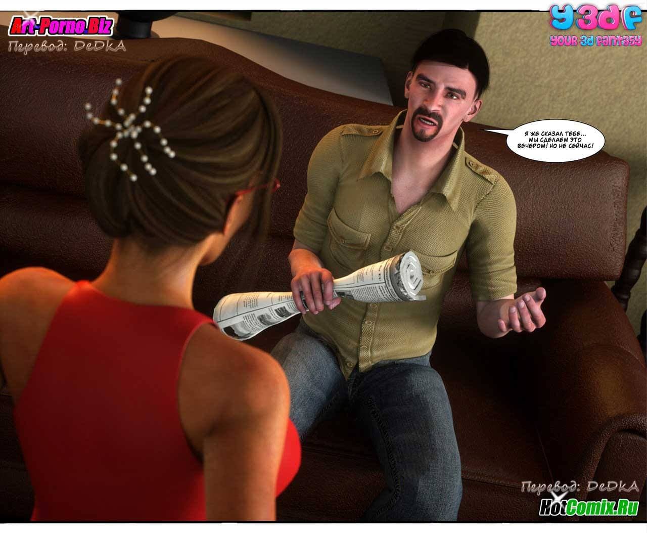 Ценителям, обожающим секс комиксы 3д, предлагаем крайне возбуждающую историю, которая начинается с того, что Макс, подходя к своему дому, уже издали стал слышать ссору между родителями. Что же на этот раз они не поделили между собой. Как оказалось, сексуальная мамаша требовала от мужа полноценного полового акта, от которого, она, наконец, получит долгожданное удовольствие. Отец Макса был не против, но сказал, что в данный момент он не хочет, а вечером все будет. Только вот, возбужденной женщине нужно сейчас, а терпеть не охота…
