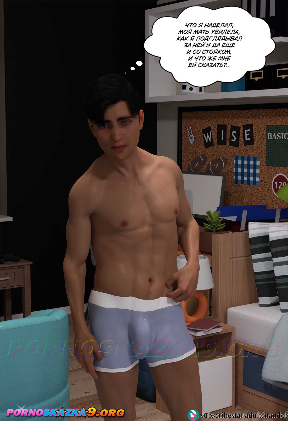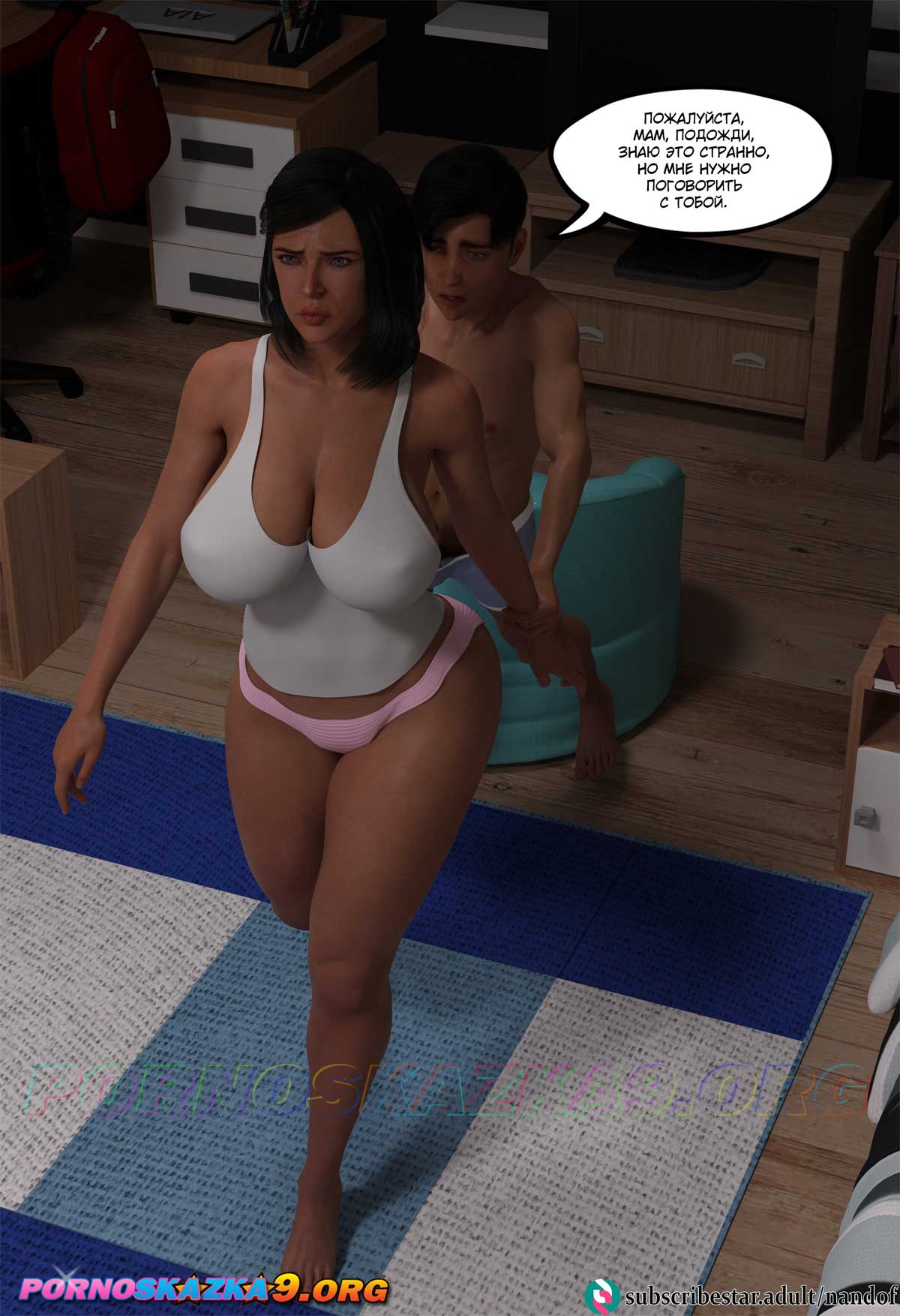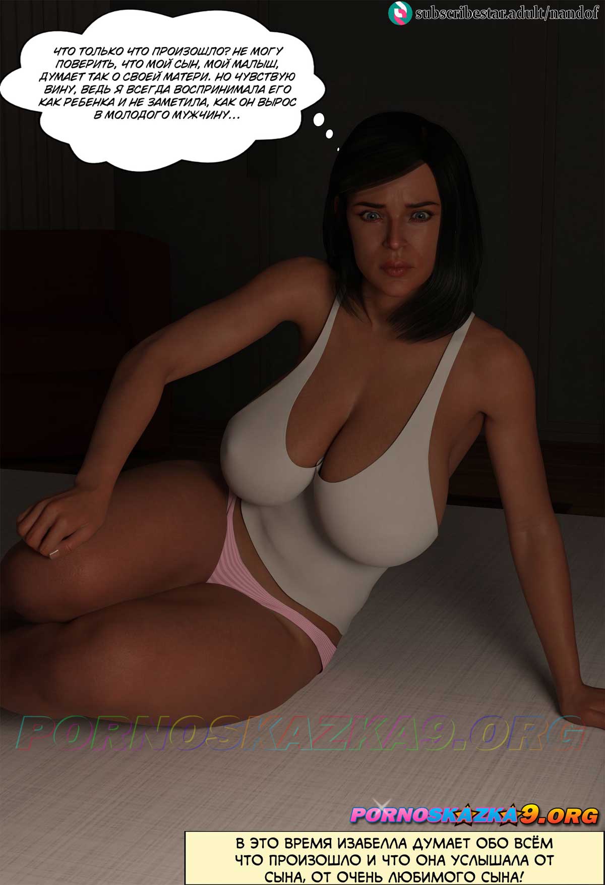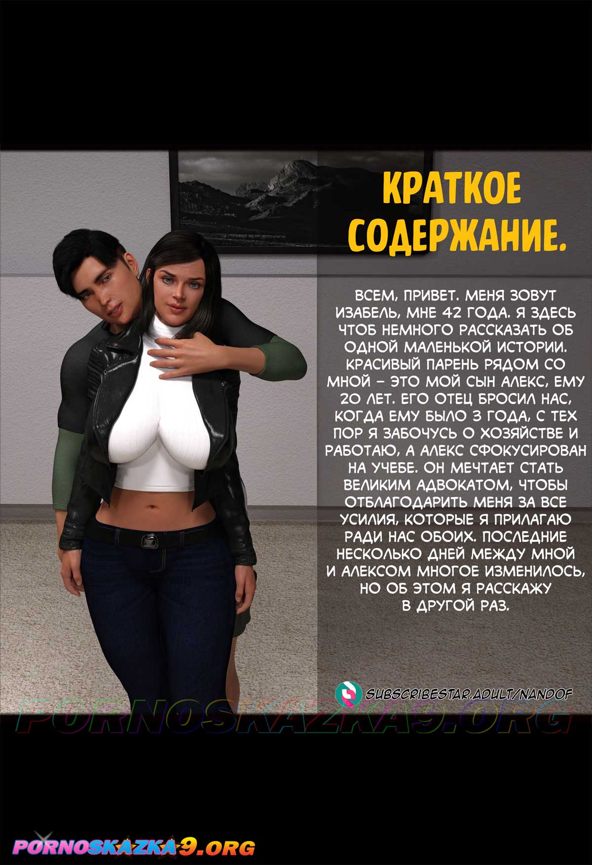 Порно комикс Что я наделала. Часть 1. Здравствуйте, друзья! Меня зовут Изабель, мне 42 года. В семье только я и мой сын Алекс, ему 20 лет. Его отец оставил нас, когда ему было 3 года, и с тех пор все обязанности по дому и заработку легли на меня. Алекс хороший мальчик, но в последнее время много перетруждается в учебе, и вот я решила помочь ему расслабиться. А далее произошло неслыханное, именно об этом я сегодня и расскажу…
