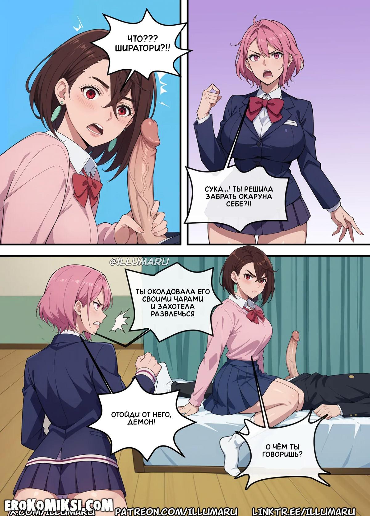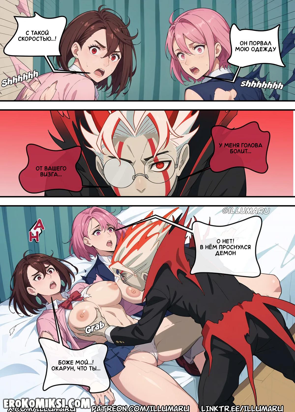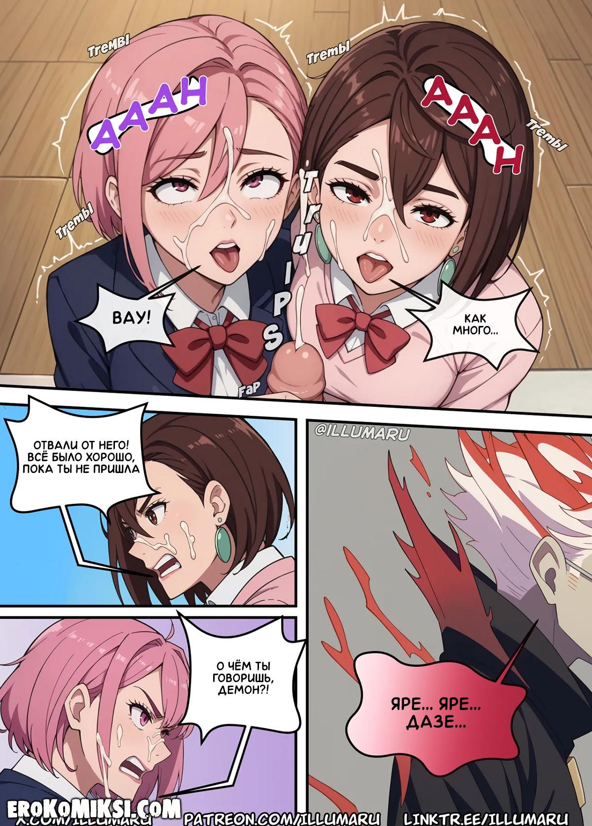 Порно комикс DanDaDan. Кто получит Окаруна? Часть 2. Увидев, как Момо отсасывает член у Окаруна, Айра решает присоединиться, чтобы Окарун сам мог выбрать, кто из них лучше. Окарун сильно от этого возбуждается и превращается в демона, и сорвав одежду с красоток, начинает их трахать своим огромным членом.
