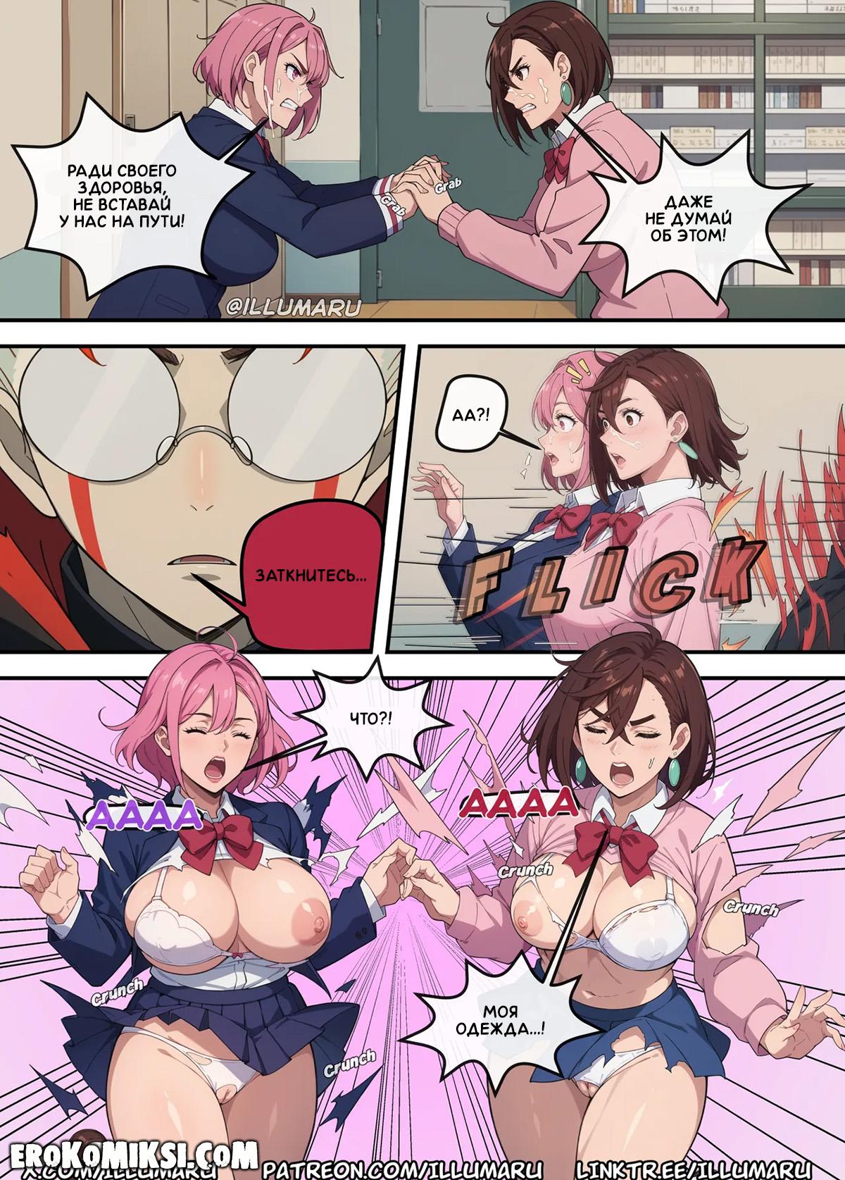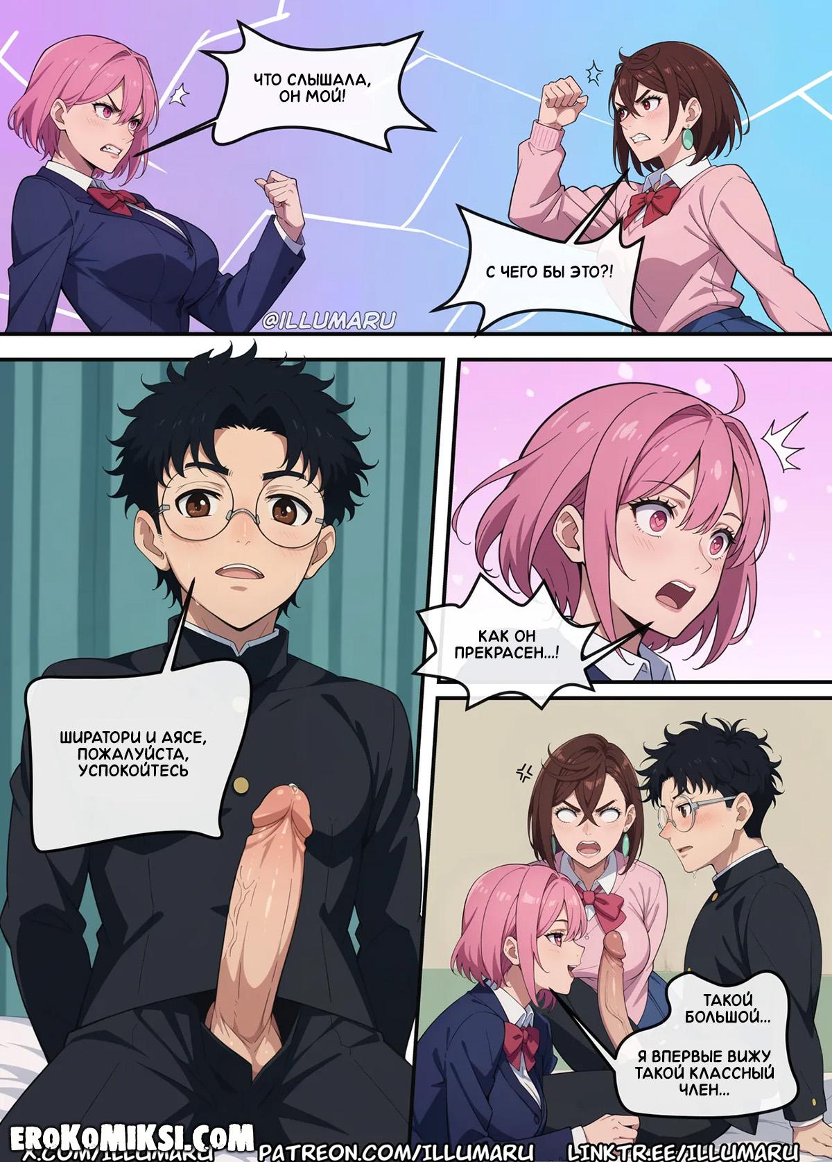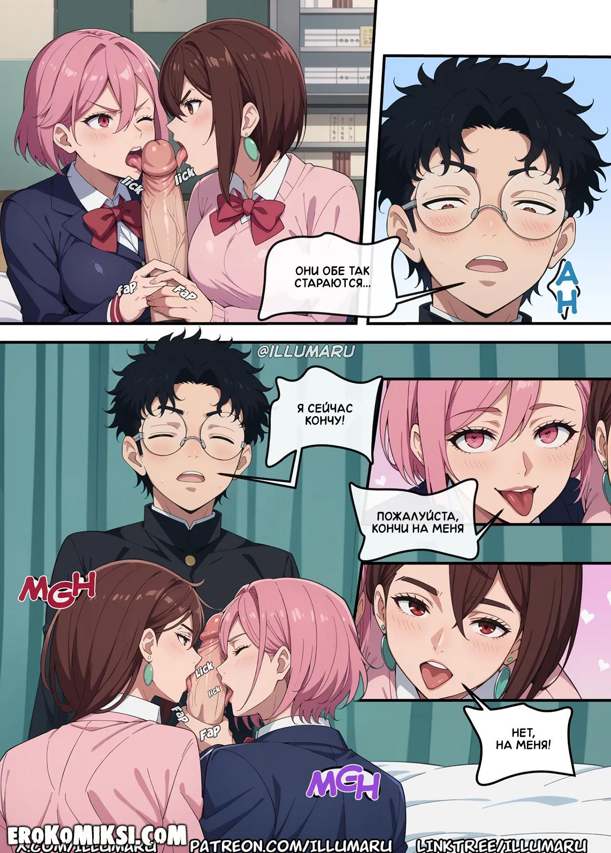 Порно комикс DanDaDan. Кто получит Окаруна? Часть 2. Увидев, как Момо отсасывает член у Окаруна, Айра решает присоединиться, чтобы Окарун сам мог выбрать, кто из них лучше. Окарун сильно от этого возбуждается и превращается в демона, и сорвав одежду с красоток, начинает их трахать своим огромным членом.