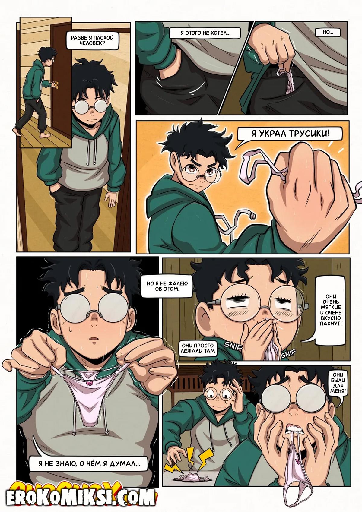 Порно комикс DanDaDan. Охотник за трусиками. Во время обеда у Момо, Окаруна приспичило в туалет и по пути в уборную, он увидел на полу трусики, которые его явно заинтересовали, и он решил предположить, чьи это могут быть трусики, и в тот момент, пока он нюхал трусики, появилась Айра…