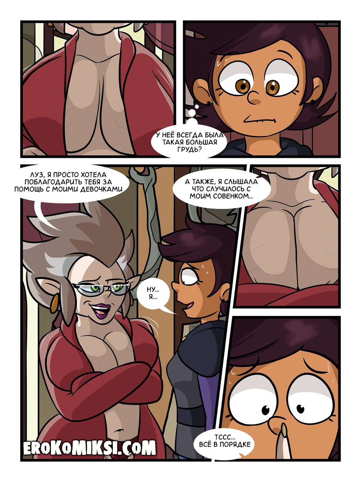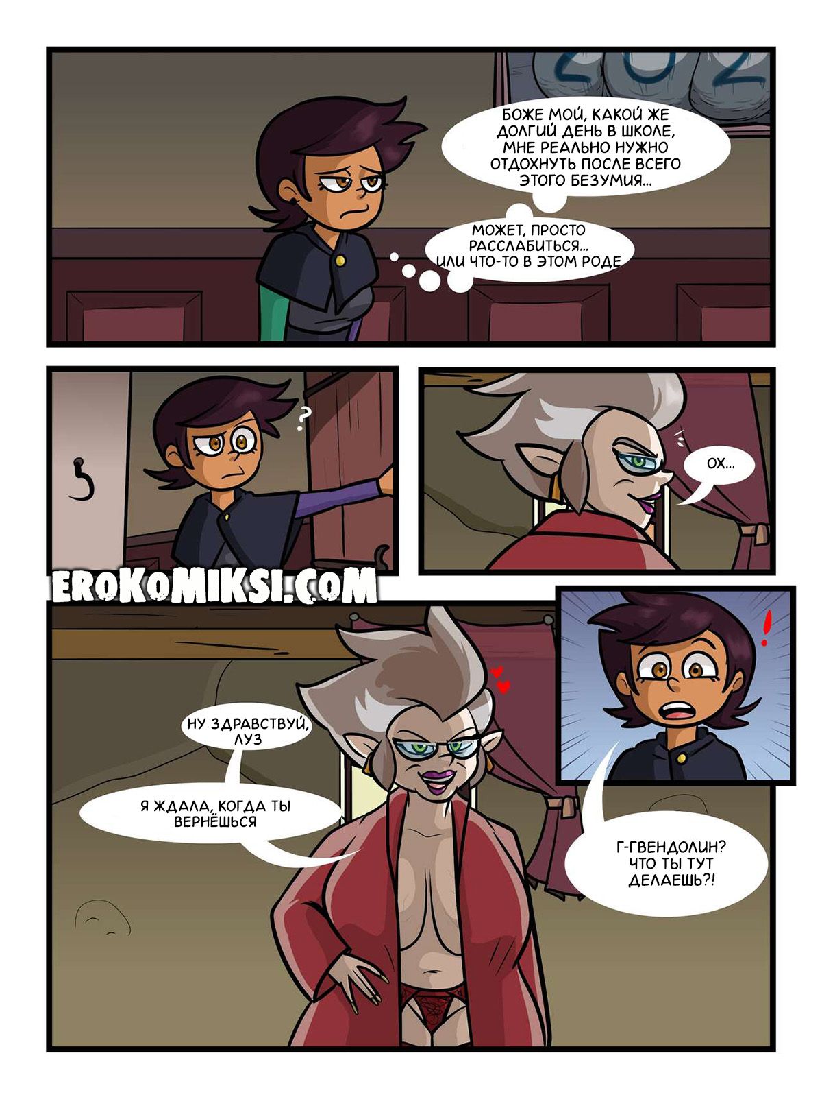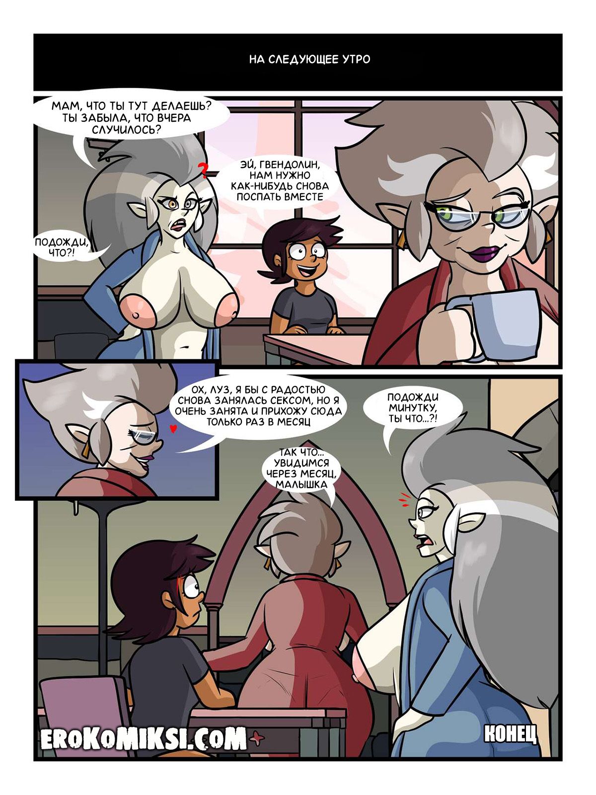 Порно комикс Дом Совы. Сюрприз Гвендолин. Вернувшись домой после учёбы, уставшая Луз застаёт дома Гвендолин. Гвендолин предлагает Луз немного расслабиться и отдохнуть после трудного дня, и начинает снимать с себя одежду. Увидев огромную грудь Гвен, Луз сразу же возбуждается и не в силах сопротивляться своим желаниям, начинает трахать Гвендолин…