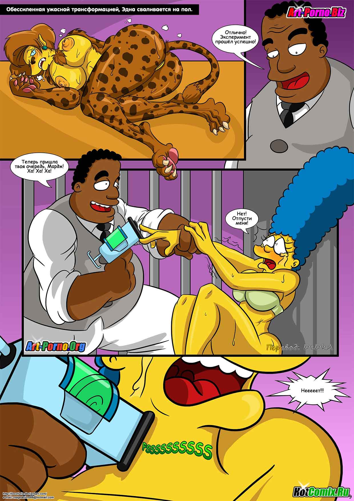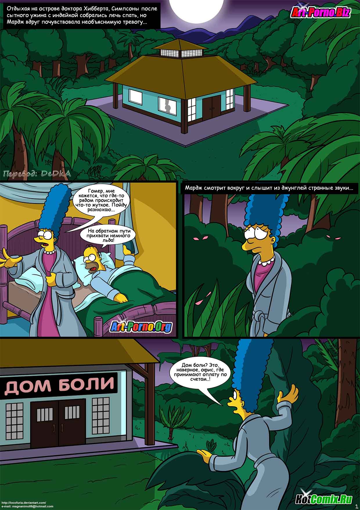 Перед вами секс комиксы про Симпсонов, в истории, где популярное семейство отдыхает на острове доктора Хибберта. Хорошенько поужинав индейкой, все члены семьи собрались спать. Но тут, Мардж вдруг ощутила сильную тревогу. Сказав Гомеру, что она чувствует, что в джунглях происходит нечто странное, женщина направилась внутрь острова. Там она находит дом боли, где ее и схватил доктор Хибберт. Как оказалось, в том доме уже находилась за решеткой Эдна, к которой и швырнули Мардж. Позже дамам под дулом пистолета приказали раздеться. После чего озабоченный Хибберт стал проводить свои безумные эксперименты…