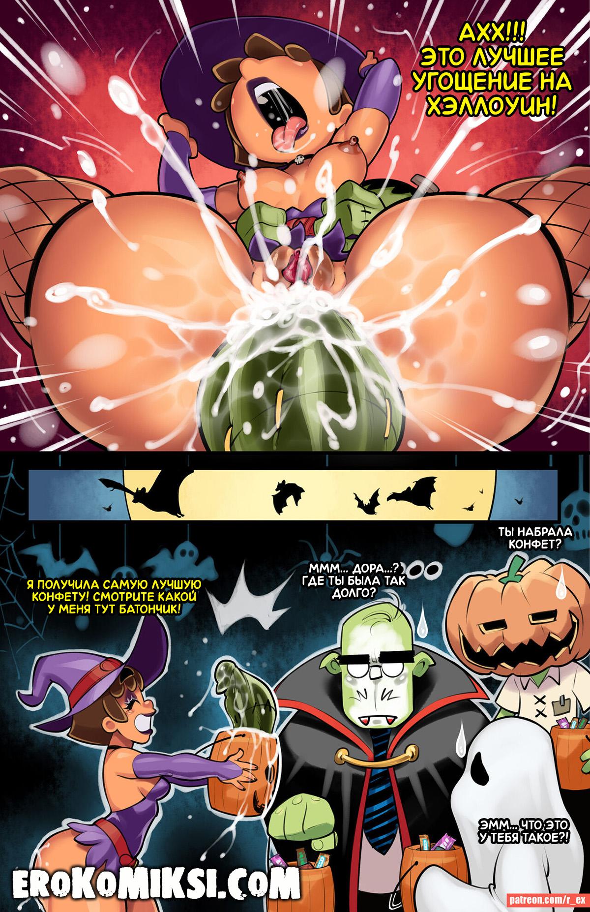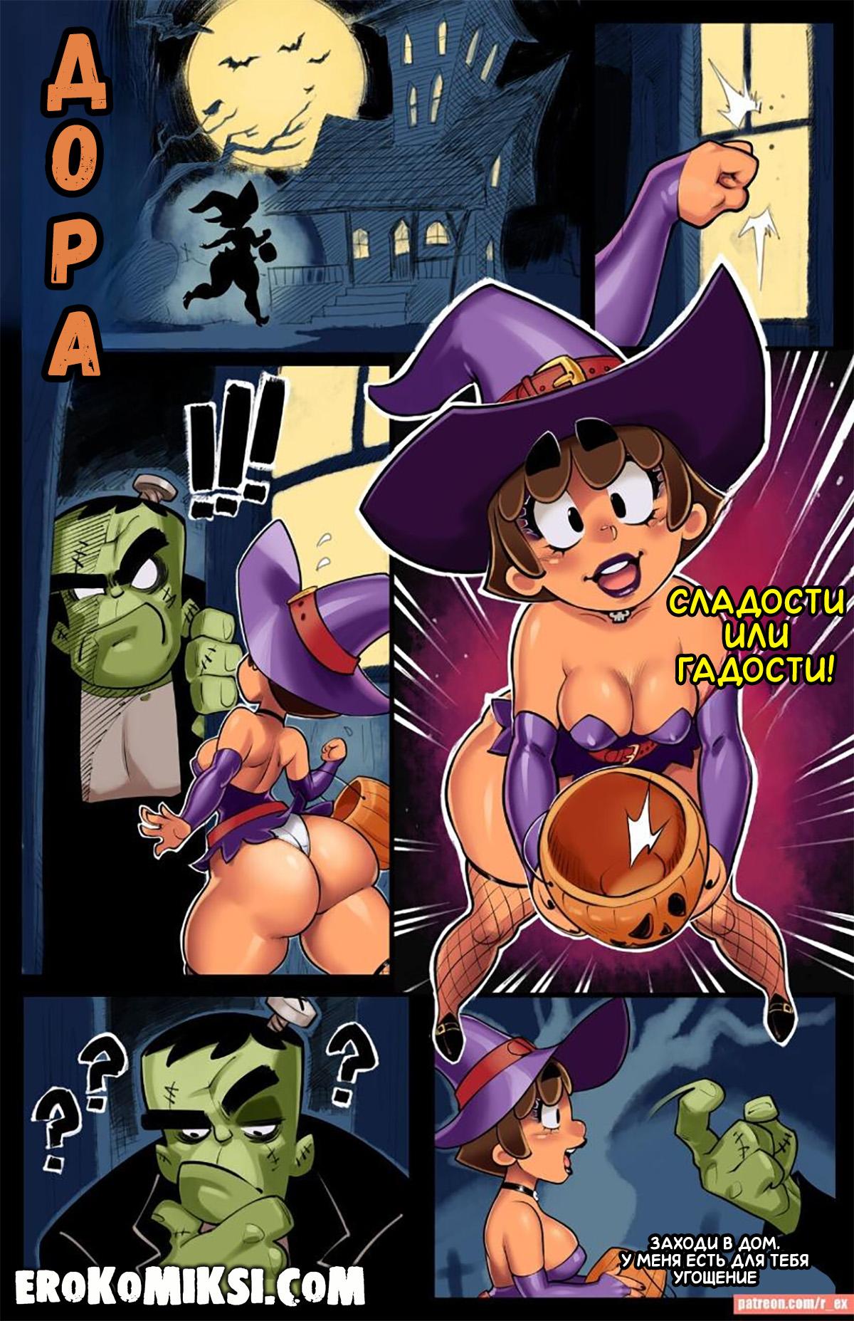 Порно комикс Дора. Сладости или Гадости. На Хэллоуин Дора отправилась по домам в поисках сладостей и забрела в дом к Франкенштейну, который, оценив красотку Дору, решил угостить её своим “батончиком”. Доре так понравилось угощение, что она потребовала добавки.