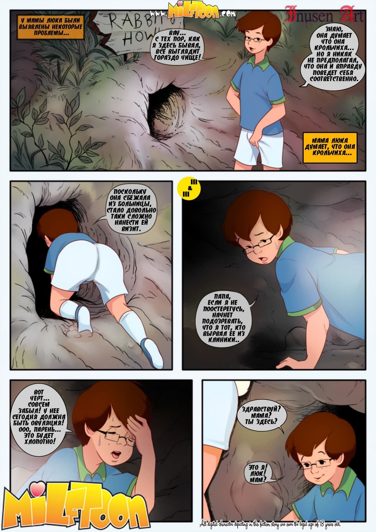 Обожаете порно комиксы инцест читать онлайн? Тогда скорее знакомьтесь с данной историей, где у зрелой мамочки Люка «протекла» крыша (имеется в виду голова) и после этого женщина стала на полном серьезе считать себя настоящей крольчихой! Конечно, с такими психическими проблемами она попала в психиатрическую клинику, но вскоре сбежала оттуда и, как и положено крольчихе, перебралась жить в нору, где её и стал навещать её похотливый сын Люк. Кстати надо добавить, что дама тоже считала Люка кроликом. Более того, она была уверена, что кролики живут только для одного, чтобы размножаться!