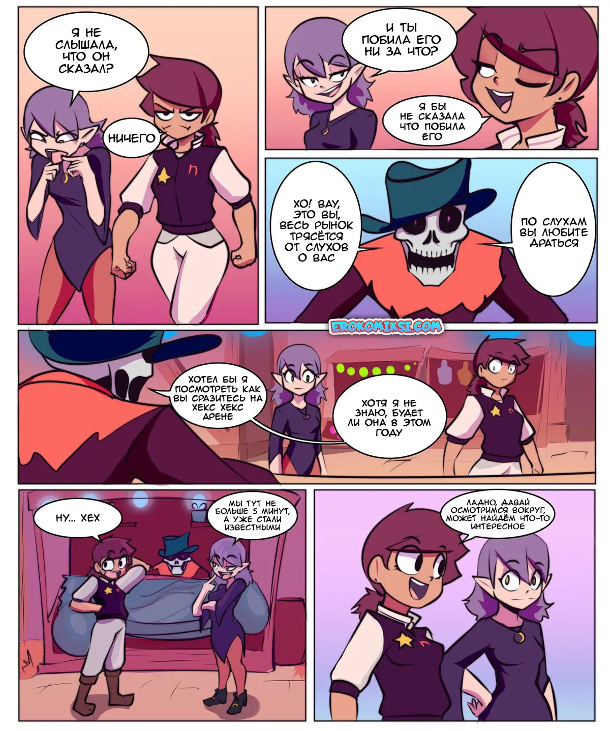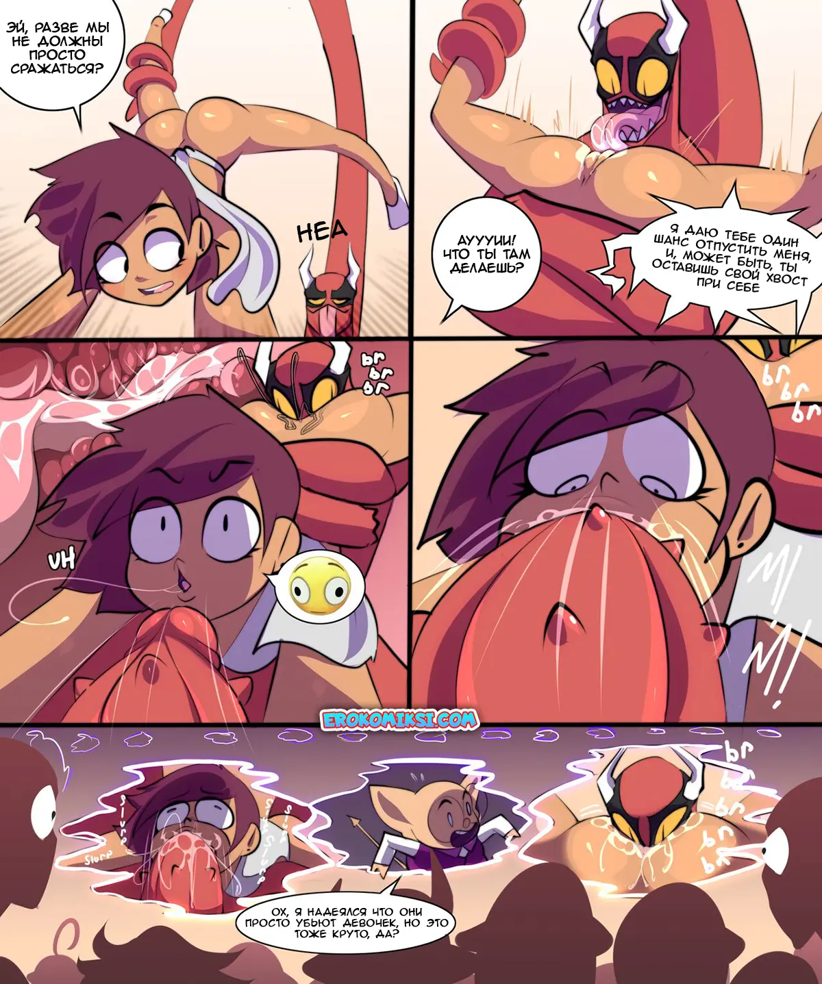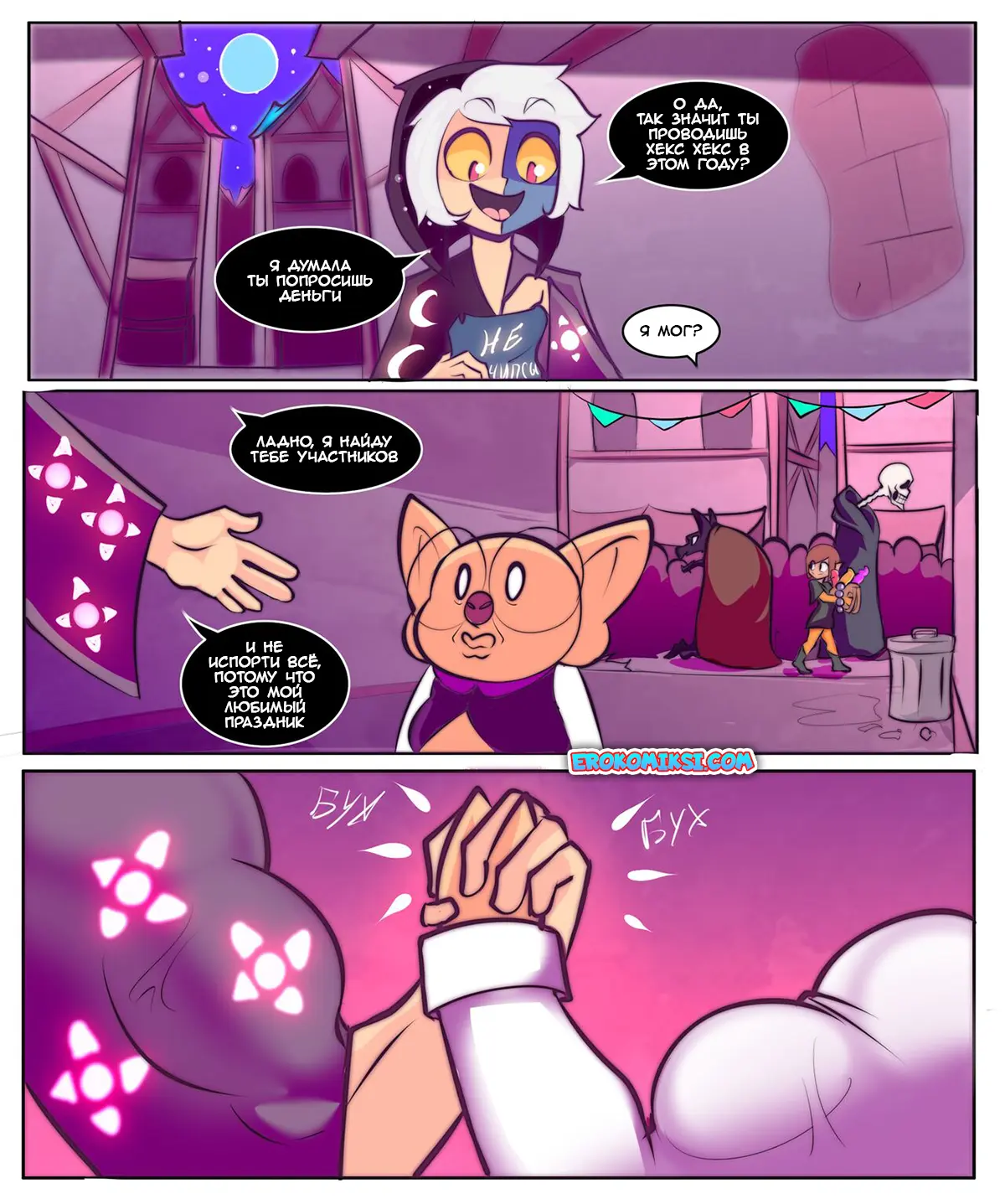 Порно комикс Ебатум Сракум. Эмити и Луз отправились на турнир под название хекс хекс. Там девушкам стало ясно, что им придётся сражаться с полудемоном, который не прочь их отодрать…