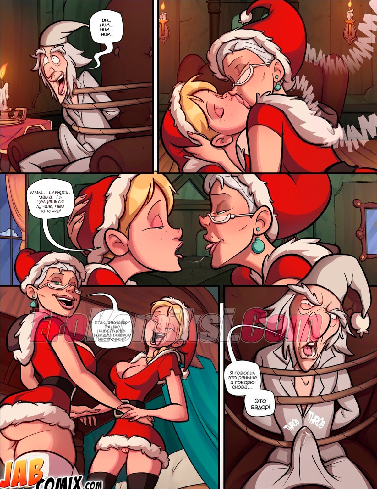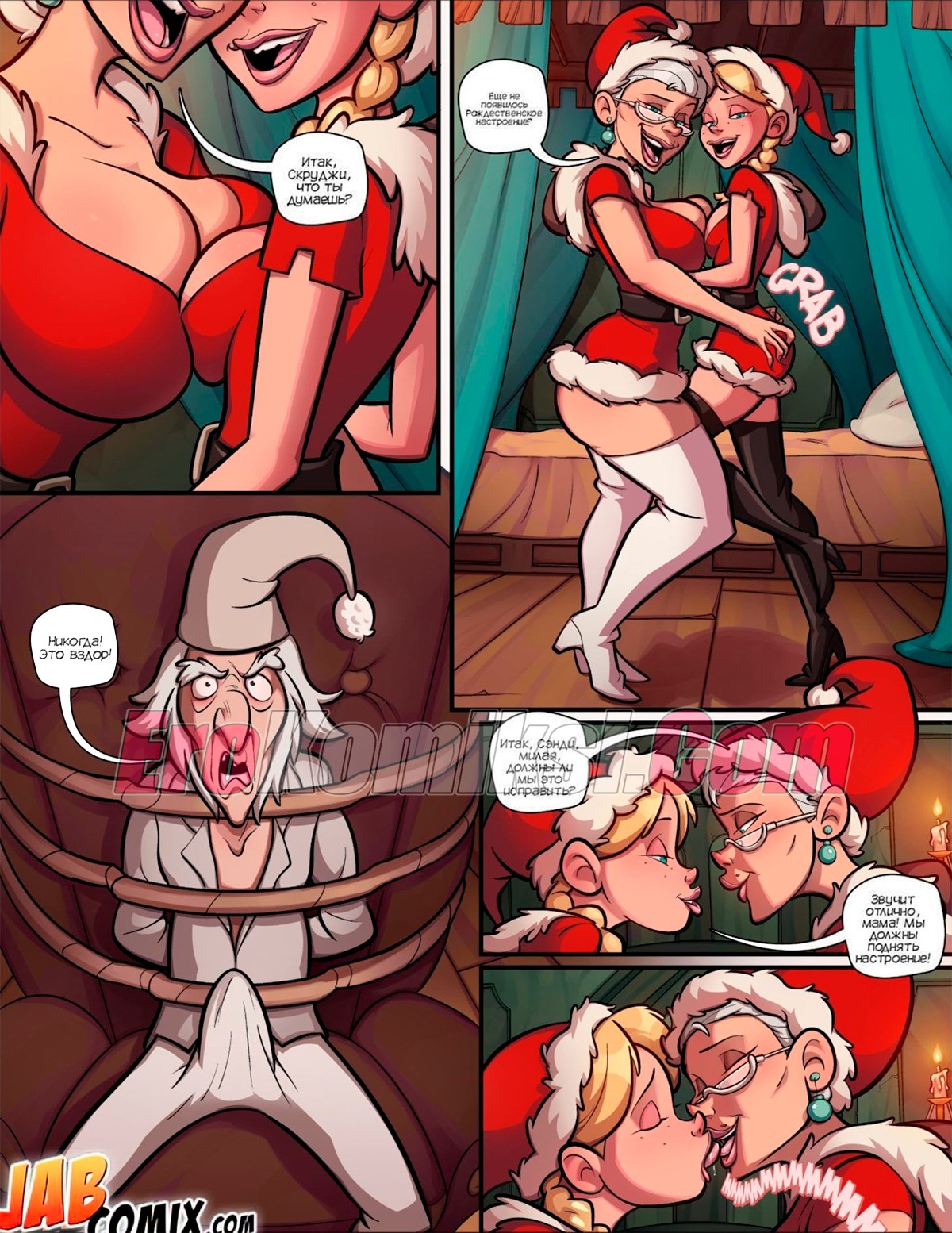 Порно комикс Эбенизер Скрудж. Рождественская песнь. A Christmas Carol. JABComix Горячая милфа с большими сиськами решила подразнить своего мужа и подарить ему новогоднее настроение. Она стала целоваться со своей сексуальной дочкой и ласкать друг дружку, возбуждая мужика.