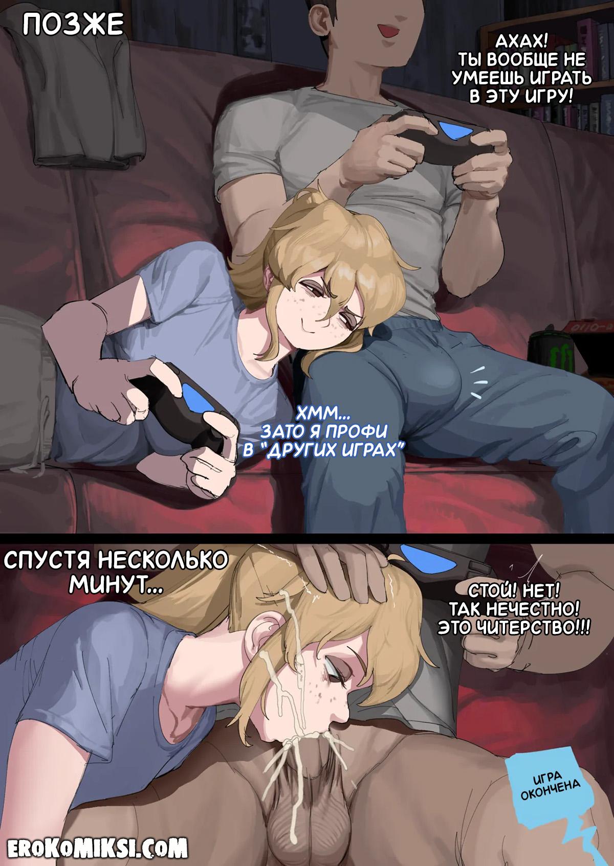 Порно комикс Эшби Мун. Конец игры. Эшби пригласила к себе домой своего парня, чтобы поиграть в видеоигры, однако, во время игры, ребята очень сильно возбудились и Эшби начала отсасывать огромный член паренька, а затем дала как следует оттрахать свою тугую киску.
