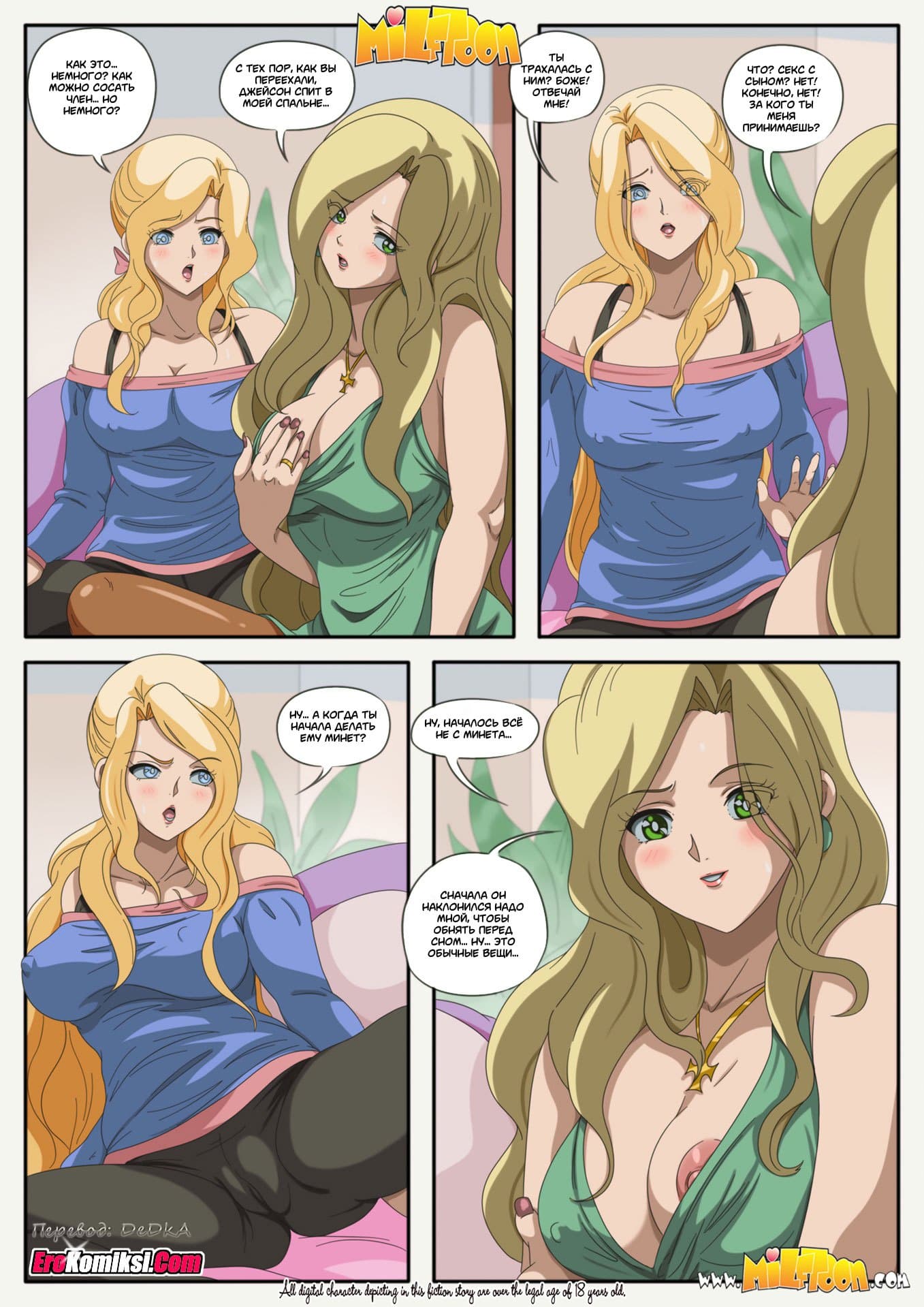 Порно комикс Естественные потребности начинается с того, что зрелая женщина Келли со своей дочерью переехала жить к своей сестре по имени Джанет, супруг которой постоянно уезжал в длительные командировки за границу. По началу Келли не видела ничего не обычного, но, как-то раз, неожиданно, вернувшись домой, раньше обычного, ее ждал не совсем приятный сюрприз. Ведь когда женщина вошла в гостиную она увидела, как ее сестрица дрочит член собственного сына. Дабы, хоть, как-то успокоить находящуюся в шоке Келли, Джанет принялась объяснять сестре причину своего вульгарного поступка…