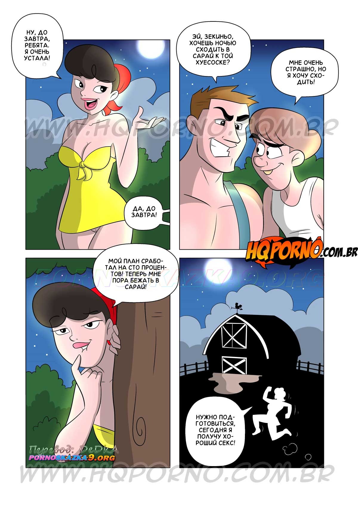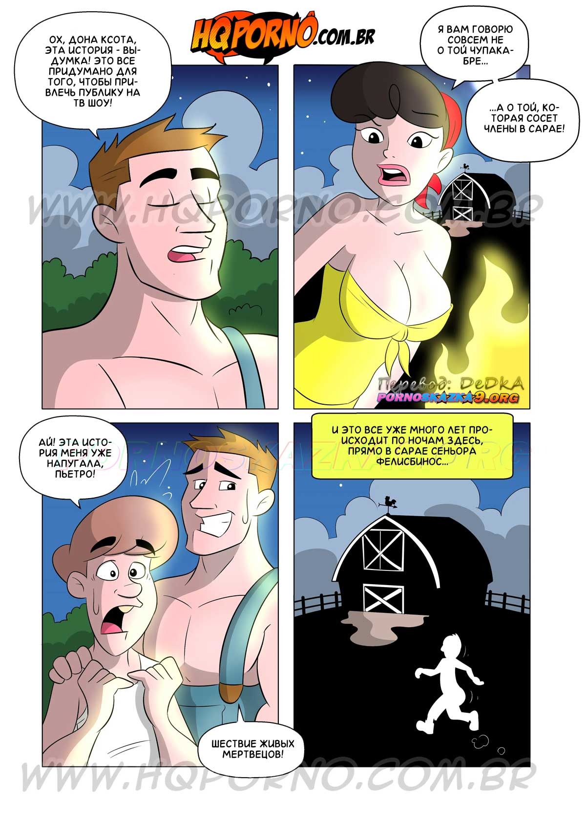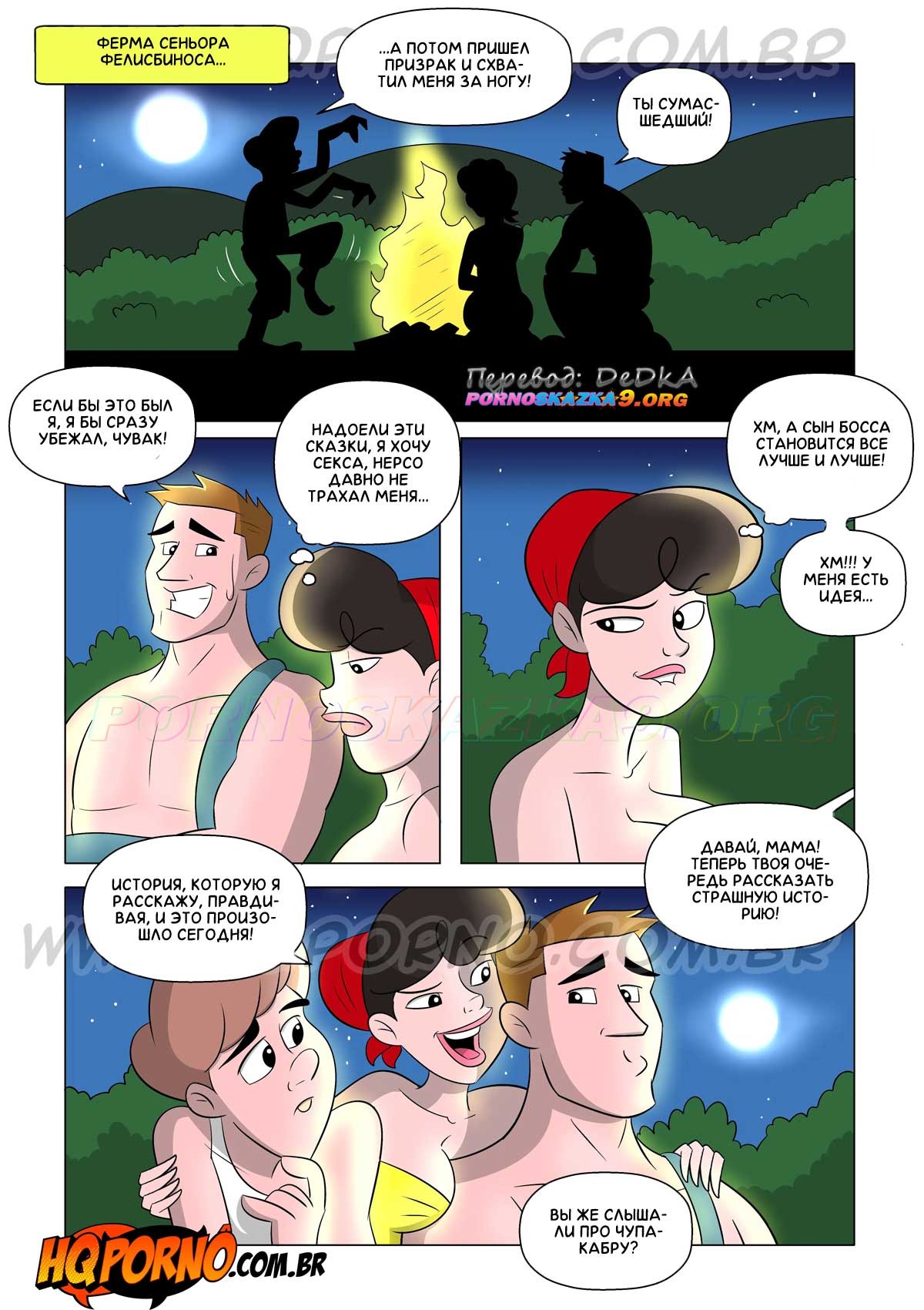 Порно комикс Фелисбиносы. Часть 5: Минет в сарае. Сидя вечерком у костра донья Ксота, Зекиньо и Пьетро поочередно рассказывали друг другу различные истории, но донья Ксота мечтала совсем о другом. Супруг давненько не трахал ее, и у женщины на уме был лишь секс, поэтому донья Ксота придумала историю о том, что по ночам в сарае появляется красивая незнакомка, и стоит мужчине зайти в сарай и сказать «Соси мой член», как «аппетитная» незнакомка тут же позволяет мужчине делать с ней абсолютно все, что он захочет! Выслушав это сексуальное повествование, Зекиньо и Пьетро задумались, а донья Ксота посчитала, что ей уже пора тайком бежать в сарай…
