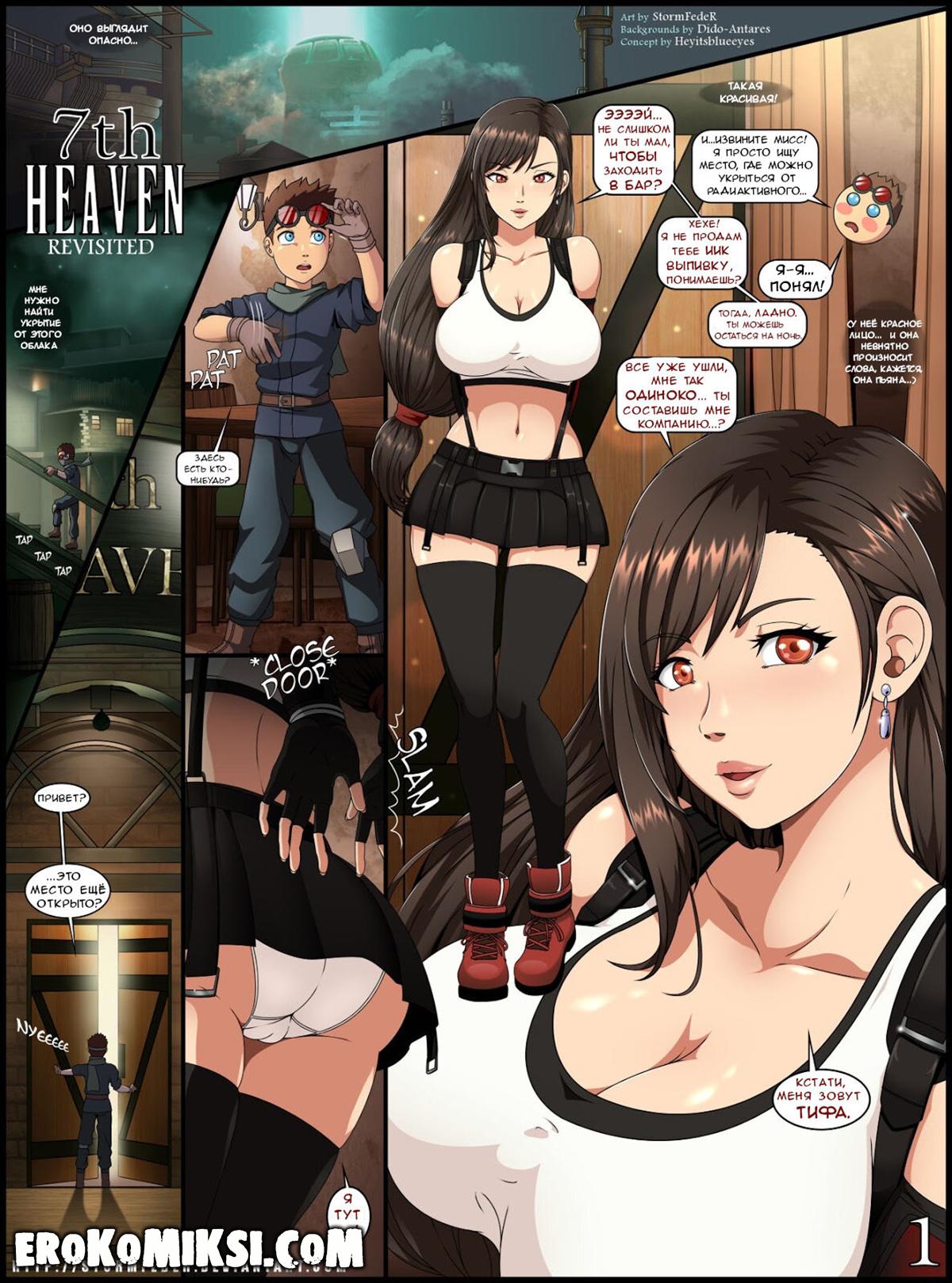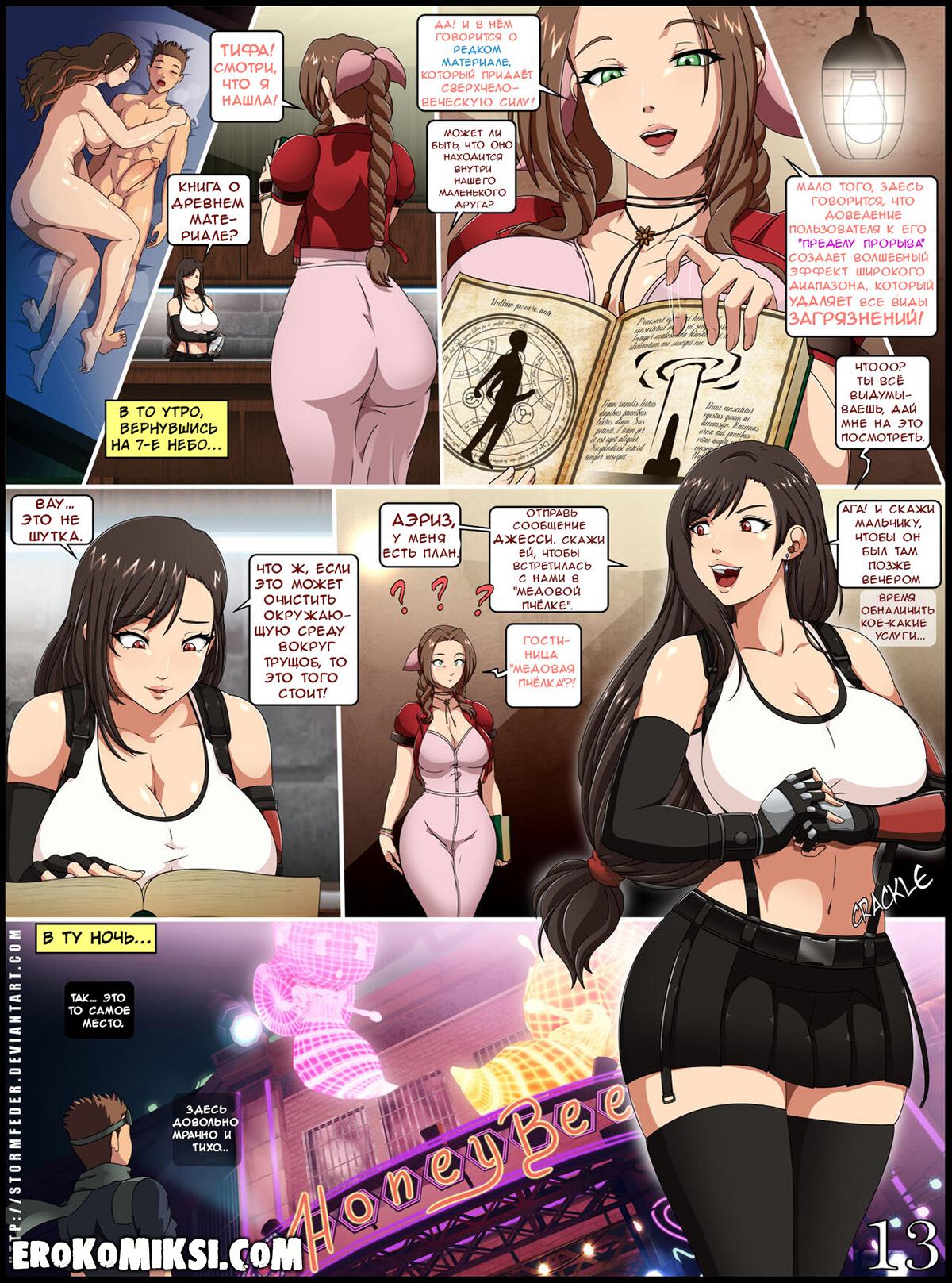 Порно комикс Final Fantasy VII. Чёрное облако. Скрываясь от чёрного облака, которое накрыло город, парень забежал в бар к Тифе, которая была чутка пьяна и позволила пареньку остаться, при условии, что он поможет ей убраться. Во время уборки, Тифа случайно оголила перед пареньком свои большие сиськи, чем возбудила парнишку. Девушка решила немного развлечься и принялась сосать его член, и в это время вернулась Аэриз, которая была шокирована увиденным, но быстро пришла в себя и присоединилась к ним. В итоге, парнишка хорошенько оттрахал Тифу и Аэриз, удовлетворив красоток по полной программе…