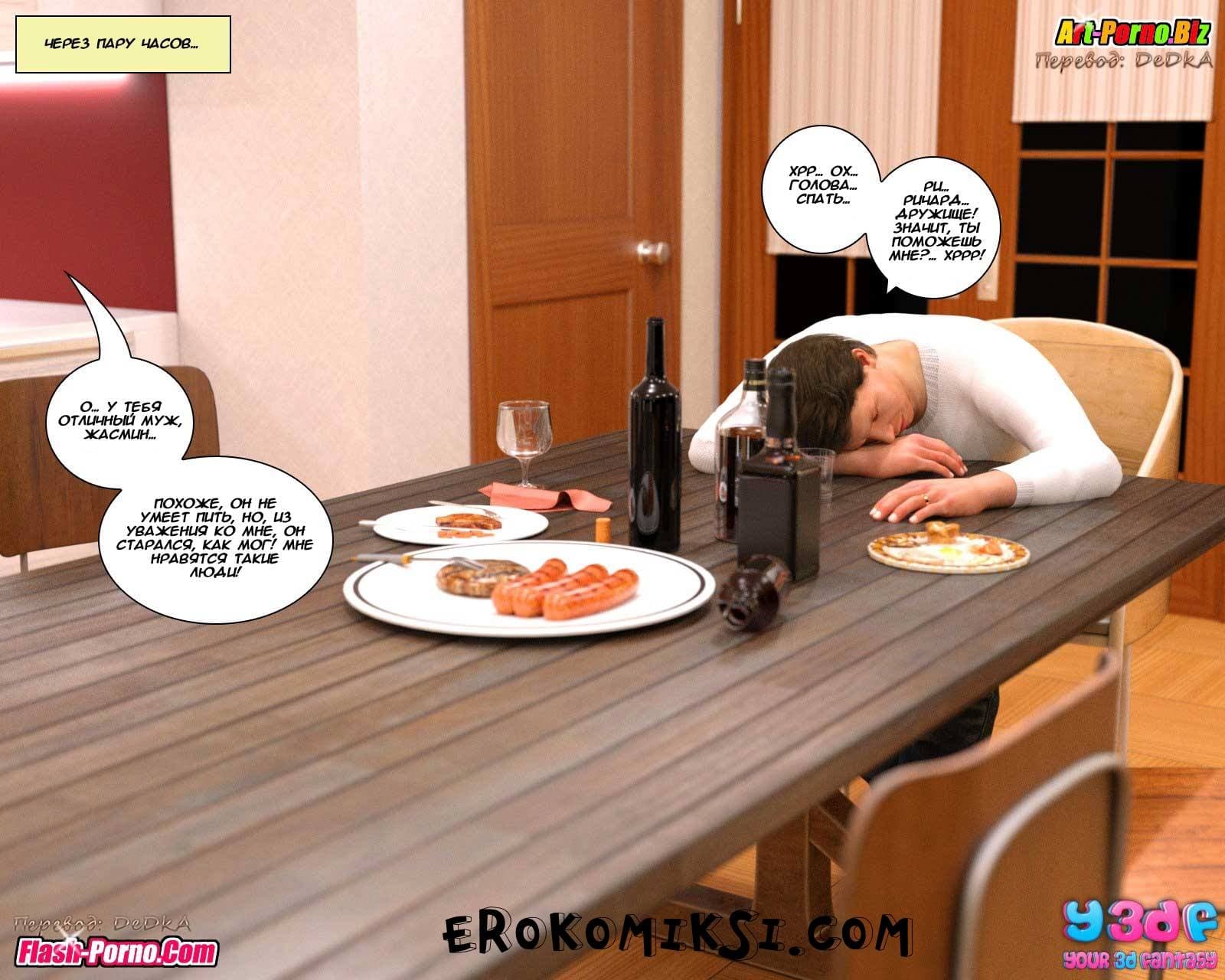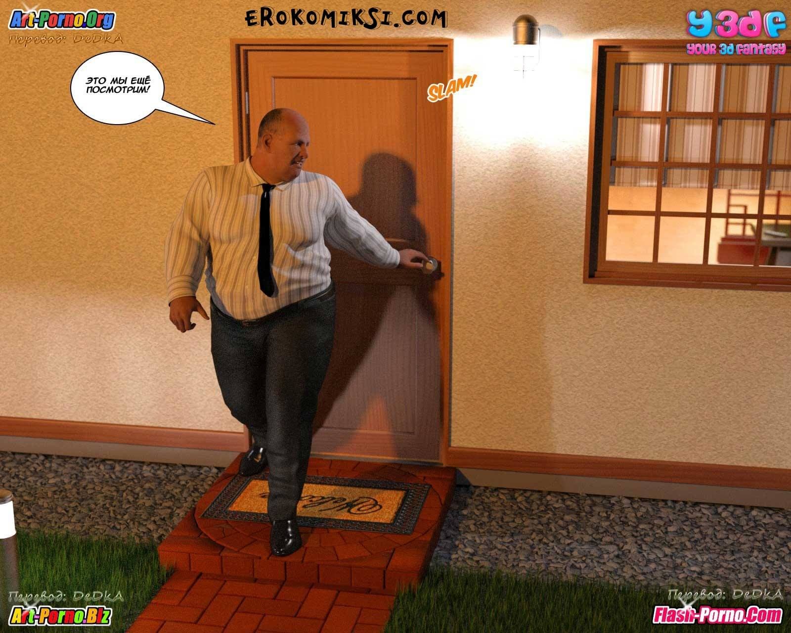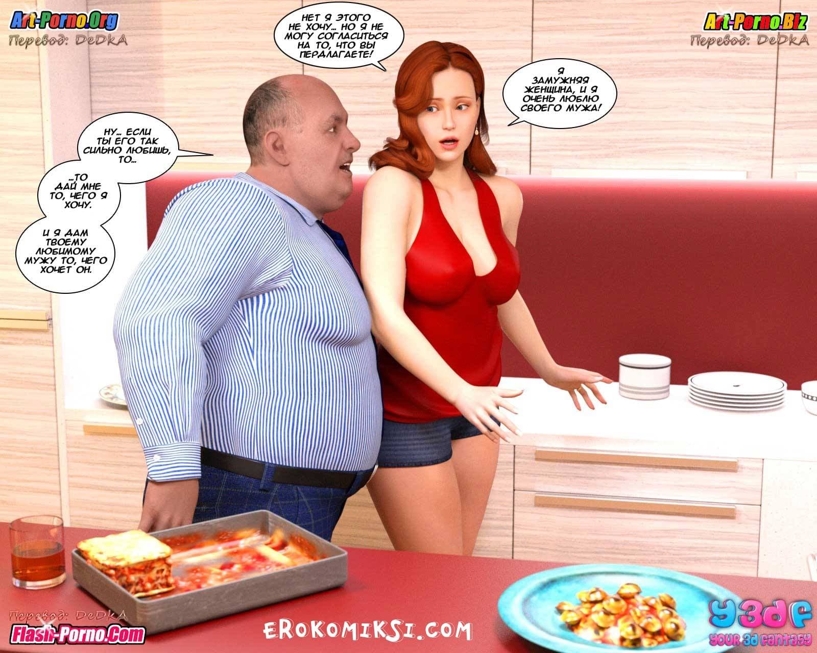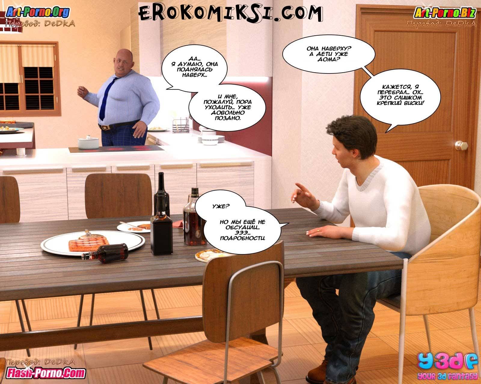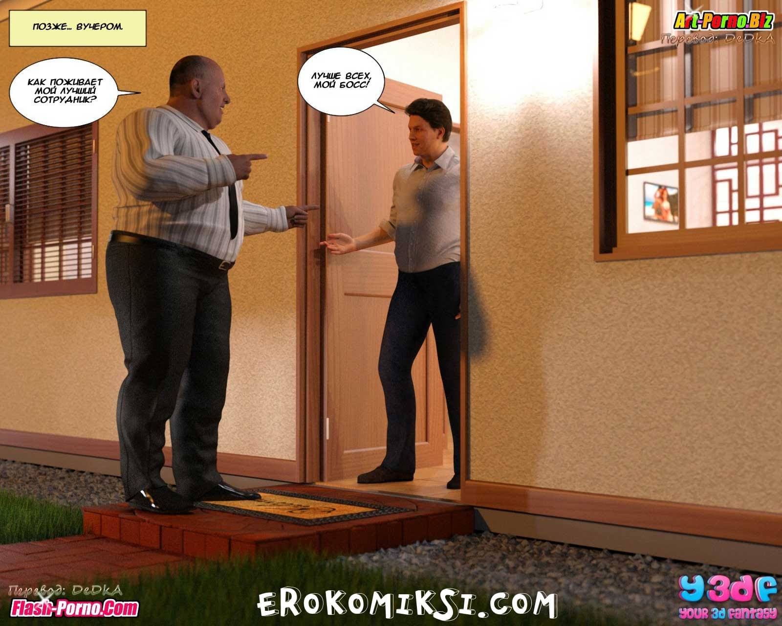 Порно комикс гадкий босс поведает историю о том, как супруги, находясь в ожидании визита к ним на ужин босса главы семьи, очень надеются уговорить его помочь в продвижении карьеры этого самого главы семейства. Босс приехал к ним прямо из аэропорта. Он был в командировке, но в силу определенных обстоятельств был вынужден уехать раньше, чем он желал, и поэтому и в гости к подчинённому он прибыл гораздо раньше того времени, к которому его ждали. Потому что ужин еще не был готов. Только вот с первой минуты его пребывания стало ясно, что мужчину интересует вовсе не какой-то ужин, а прелестная и сексуальная во всех отношениях хозяйка…
