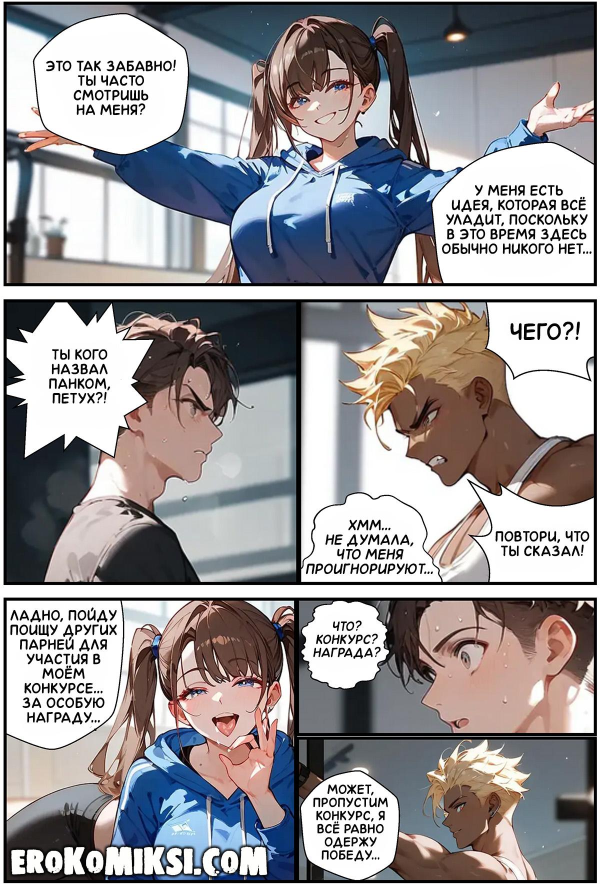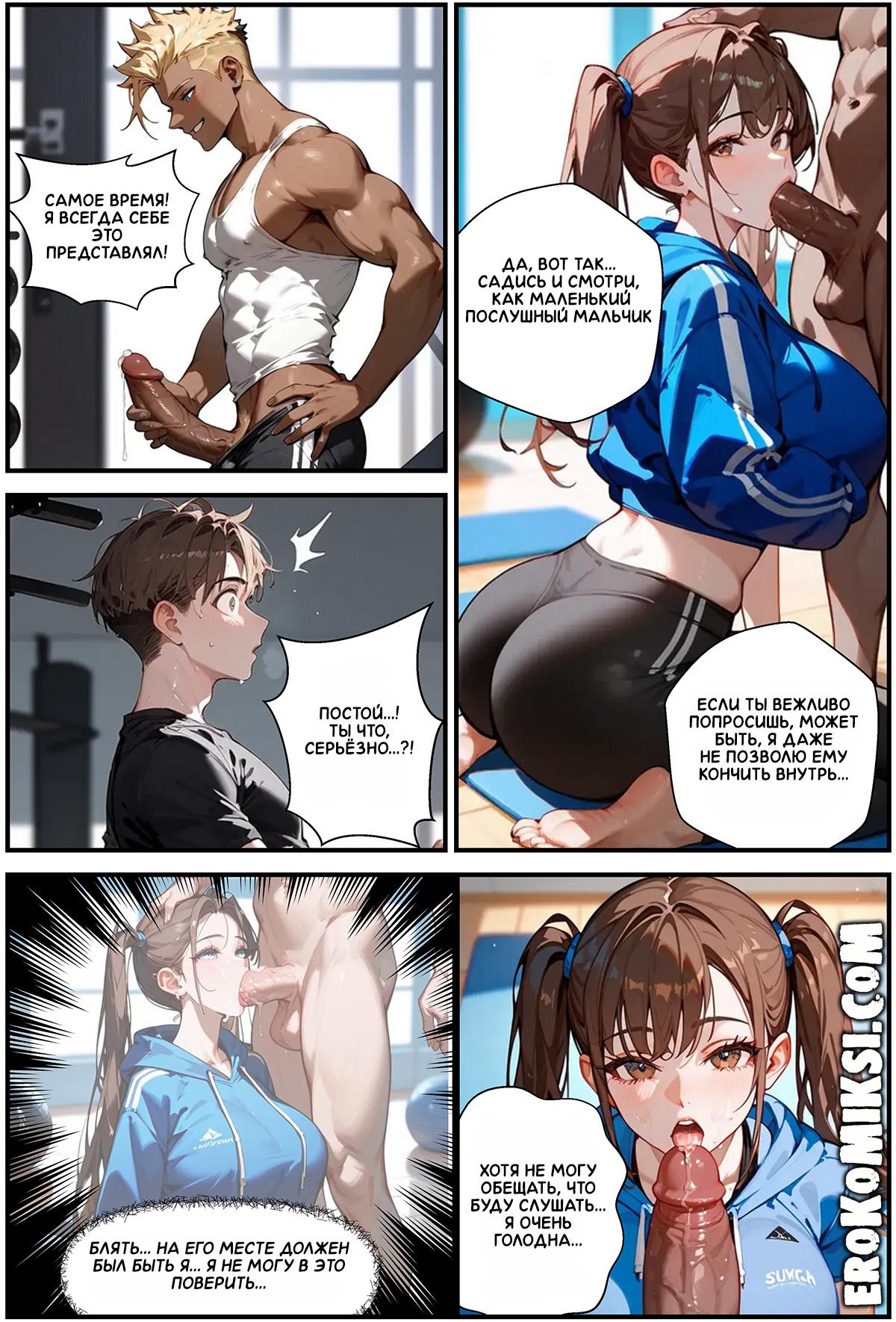 Порно комикс Горячая тренировка. Рита – горячая девчонка, которая ходит в спортзал, и все парни возбуждаются при её виде. Как-то раз, парни начали из-за неё ссориться, и чтобы уладить конфликт, Рита встала на колени и принялась сосать парням, а затем позволила им как следует её оттрахать и обкончать её горячее тело…
