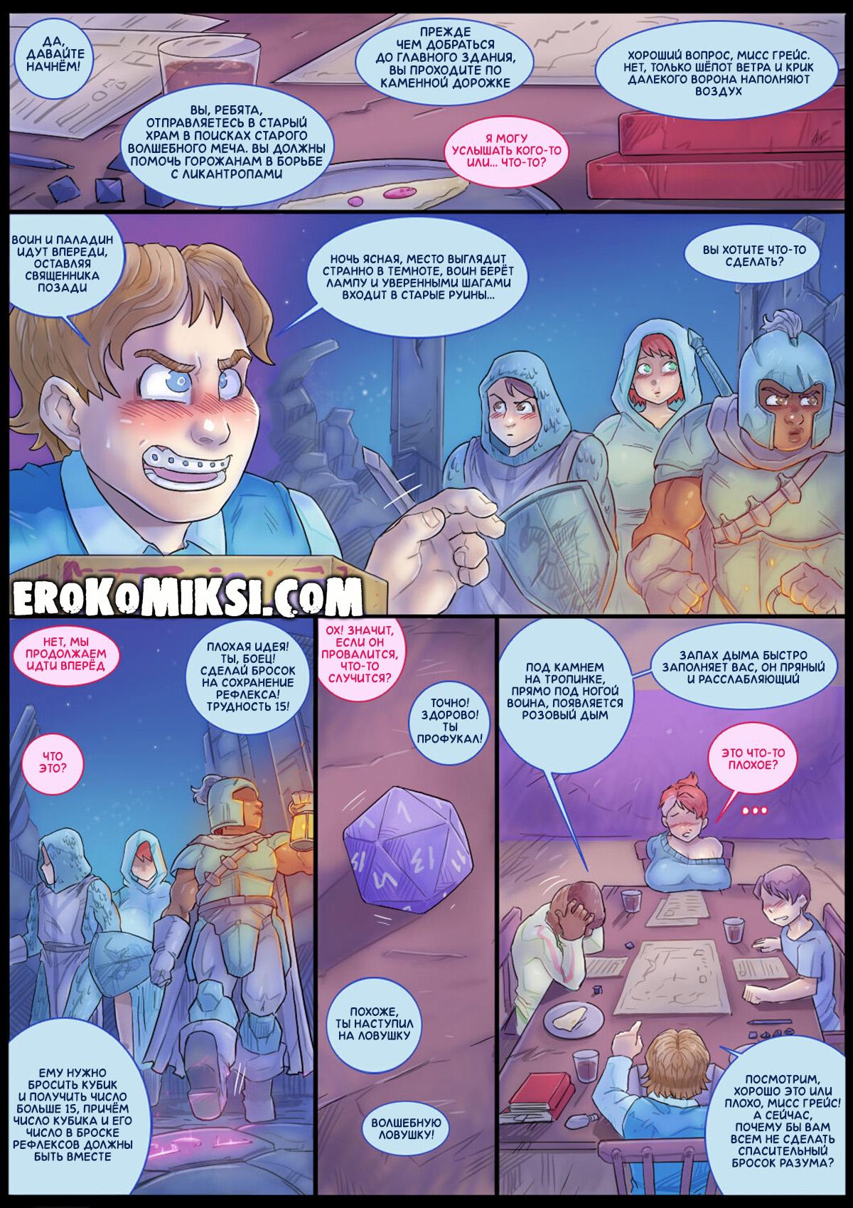 Порно комикс Горячие настольные игры. Ребята решили поиграть в Подземелье драконов и пригласили свою учительницу, мисс Лэнгсли Сандерс, которая уже давно мечтала поиграть в эту настольную игру. Начав игру, ребята так увлеклись и вжились в свои роли, что превратили всё в ролевую игру и как следует оттрахали Мисс Сандерс, которая не сильно сопротивлялась…