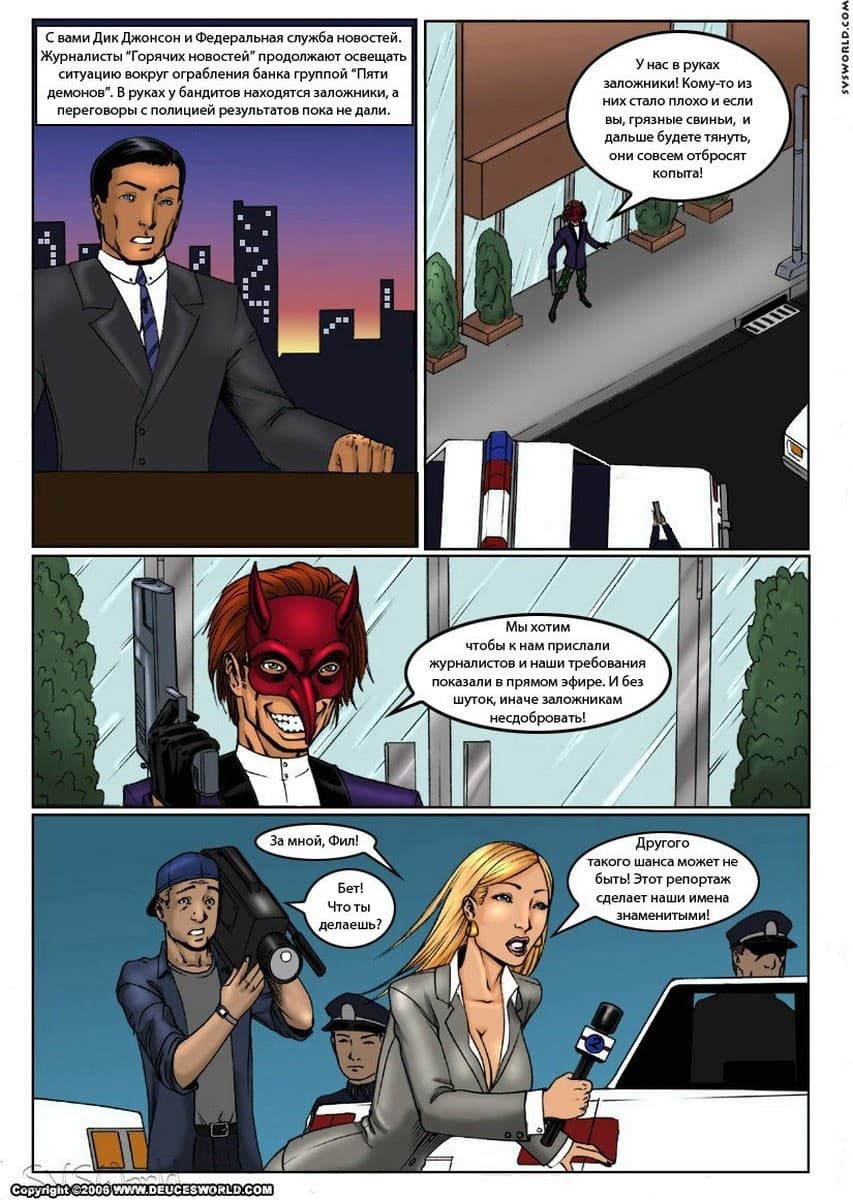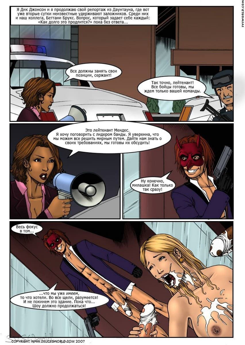Всем тем, кто любит смотреть порно комиксы про разные, возбуждающие истории представляем данное произведение. Речь в нем пойдет о репортере канала и журналистке по имени Беттани Брукс. Сегодня она освещает по новостям в прямом эфире события в одном банке, который грабят. Пытаясь взять интервью у главаря бандитов, она сама того не ожидая, становится объектом сексуальных домогательств со стороны преступника. Теперь она полноценно берет интервью, только вместо микрофона у нее большой член во рту и все это в прямом эфире!!!