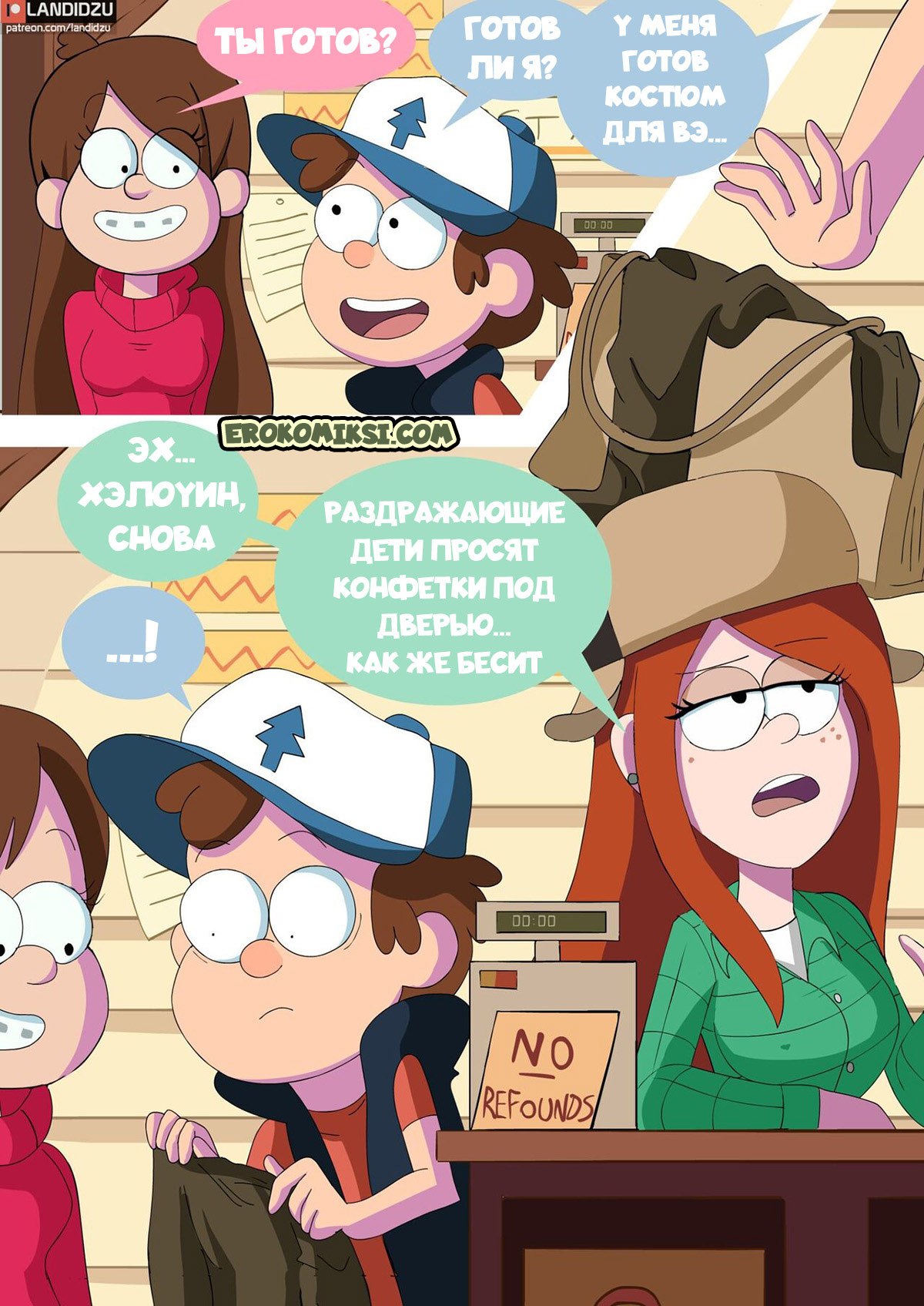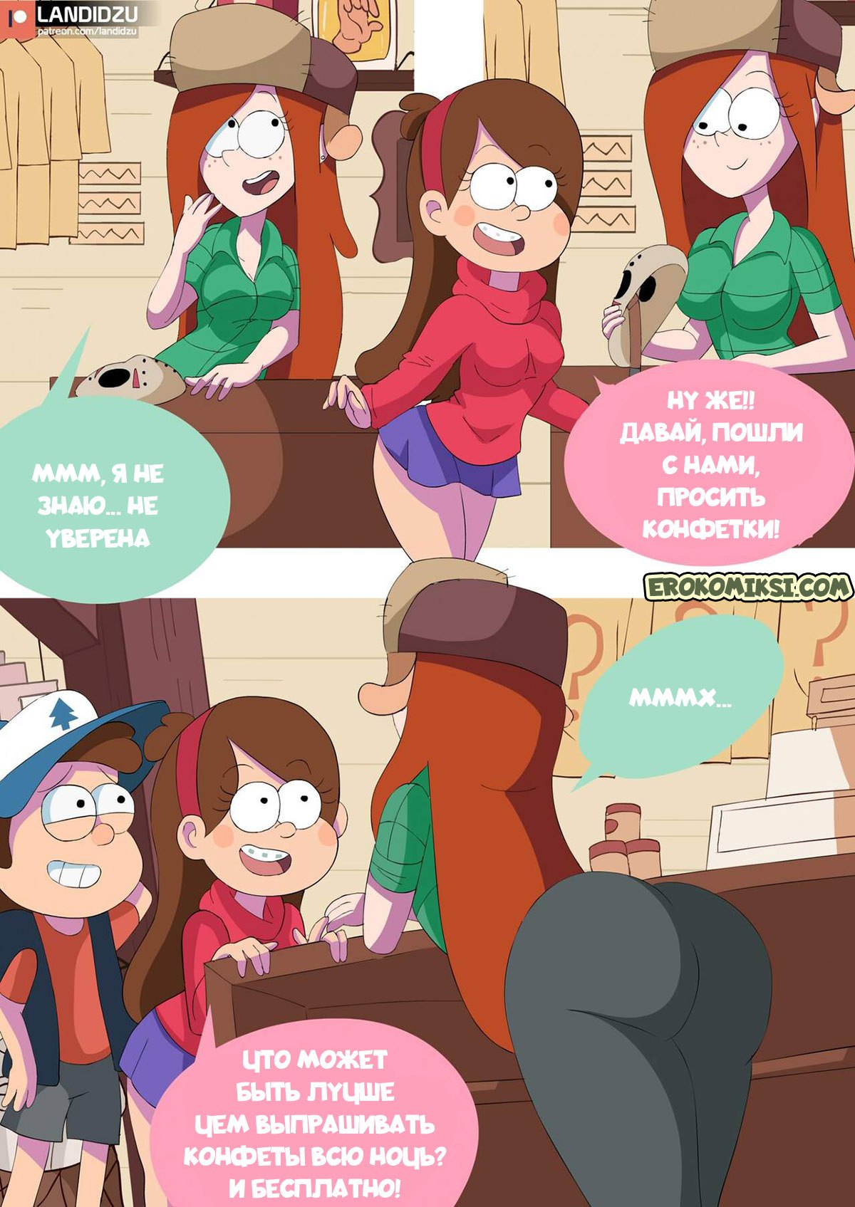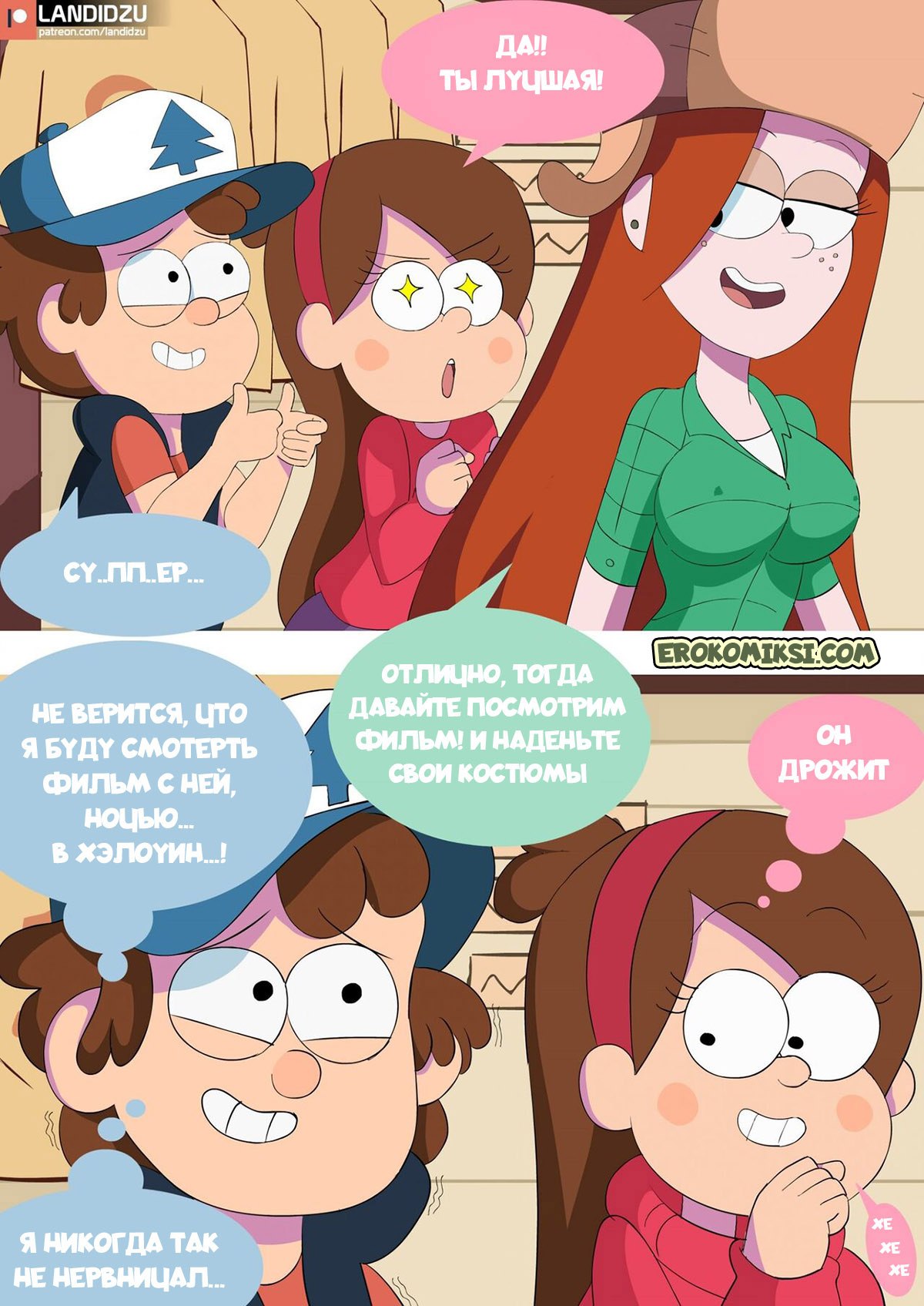 Порно комикс Гравити Фолз: Кошелек или жизнь. Диппер и Мэйбл собираются пойти на хэллоуин, но прежде они приглашают с собой Венди. Девушка хотела бы с ними пойти, но не может из-за работы в хижине чудес. Тогда она предлагает друзьям остаться на ночь с ней в домике за просмотром фильмов ужасов, и приодеться в костюмы, а конфеты можно взять из магазина. Ребята соглашаются и решают провести ночь вместе. Однако у Венди нет костюма и Мэйбл одалживает ей свой запасной наряд. Костюм немного маловат, но зато Дипперу видно, как сильно выпирают аппетитные части тела девушки…
