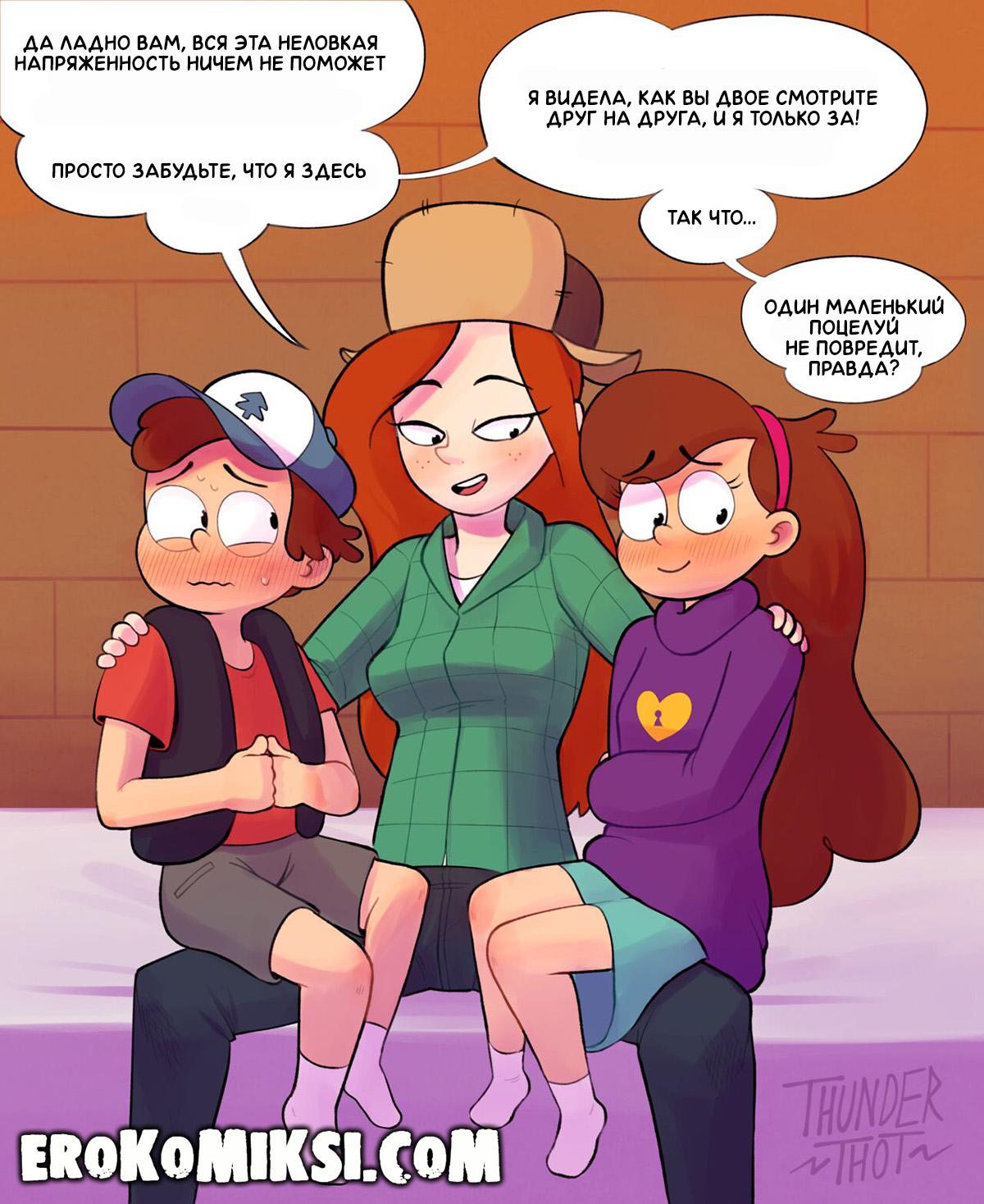 Порно комикс Гравити Фолз. Наставница Венди. Венди видит, как близнецы Диппер и Мэйбл мило ведут себя друг с другом, и решает кое-что проверить. Она предлагает им научиться целоваться друг на друге, и когда те начинают смачно сосаться, то радуется, что была права. Но на этом, Венди только раззадорилась, и теперь, она учит Мэйбл сосать член Диппера…