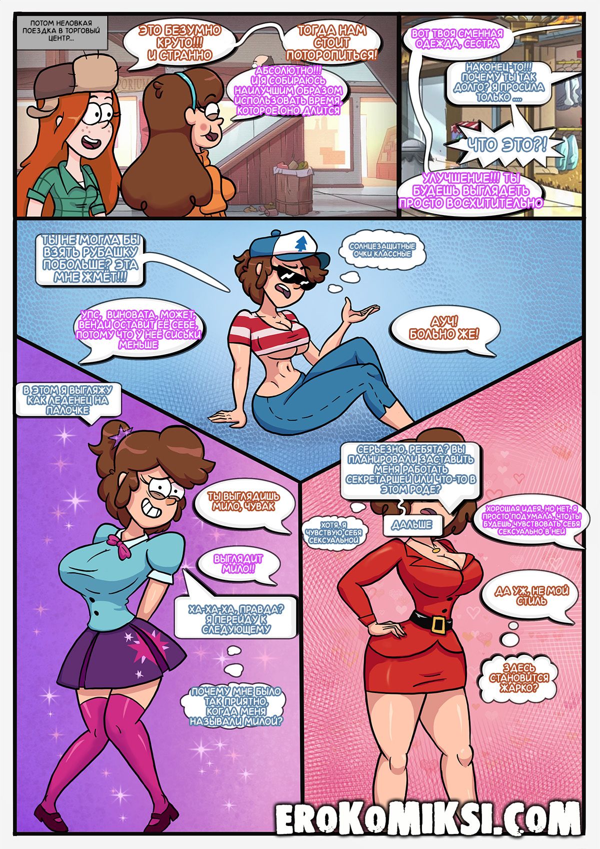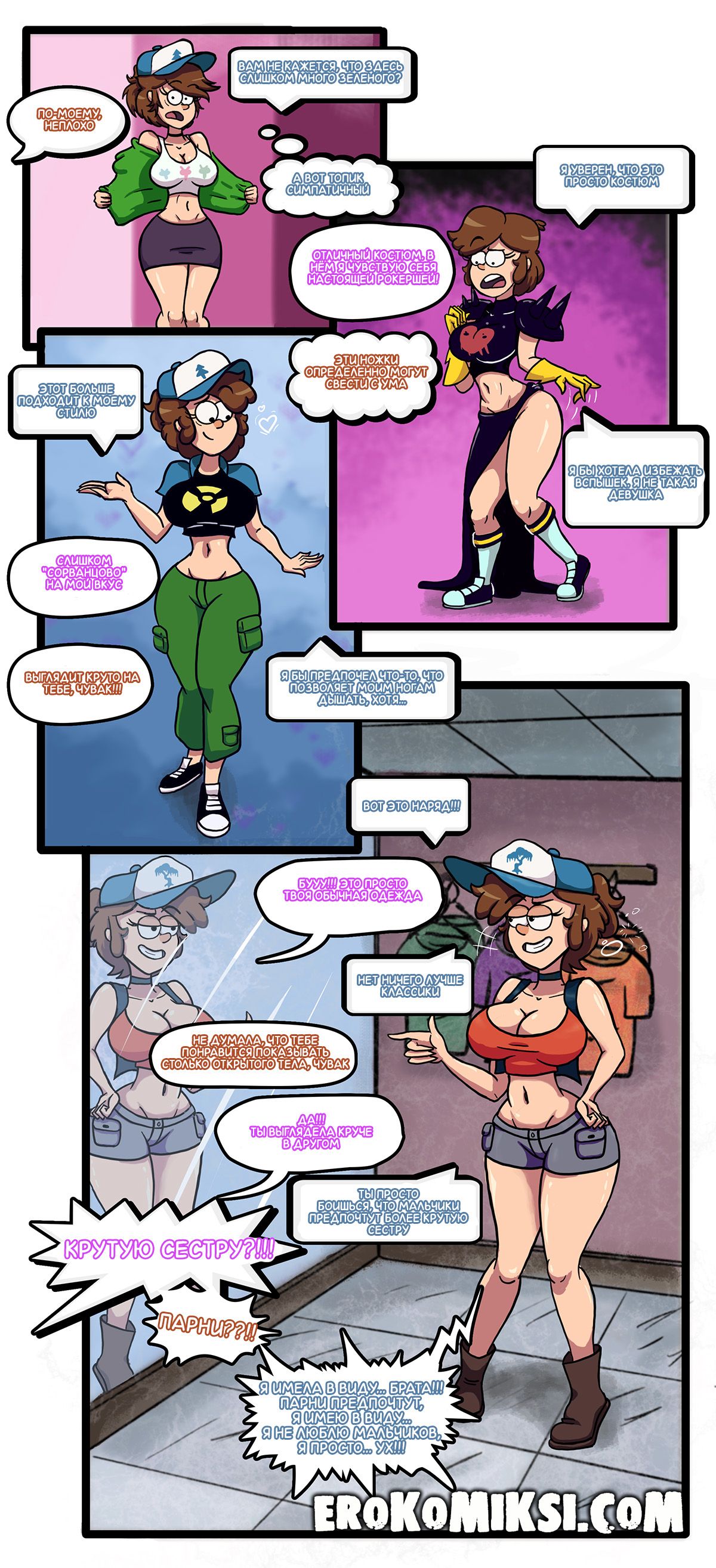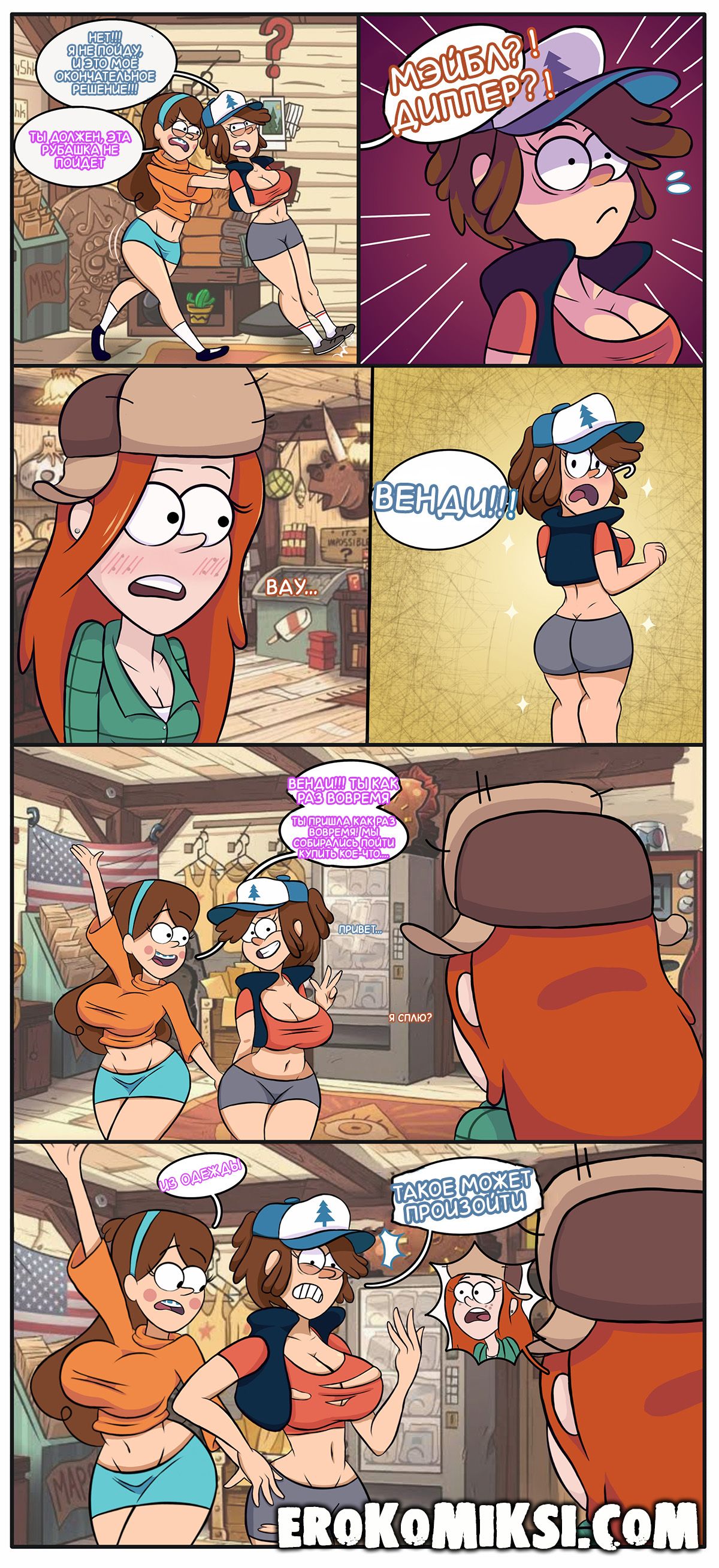 Порно комикс Гравити Фолз. Волшебные грибы. Диппер нашёл в лесу волшебные грибы, при употреблении которых, человек становится взрослым. Скушав гриб, Диппер не стал взрослым, а превратился в сисястую девушку! Его братец Мэйбл тоже решил попробовать грибочек и с ним случилось тоже самое! В итоге, их подружка Венди, помогает братьям подобрать подходящую женскую одежду!