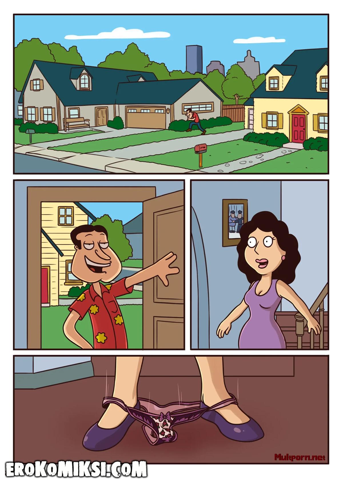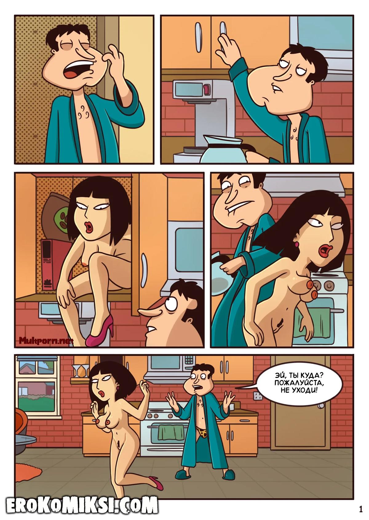 Порно комикс Гриффины. Приключения Гленна Куагмайра. Озабоченный Гленн продолжает свои похождения и ищет женскую киску, в которую можно вставить свой большой член. Он отправляется в дом Гриффинов, чтобы присунуть Лоис, но в доме много народу и его план обречён на провал, но он не унывает и отправляется к Бонни Суонсон, которая всегда рада осушить набухшие яйца Гленна…