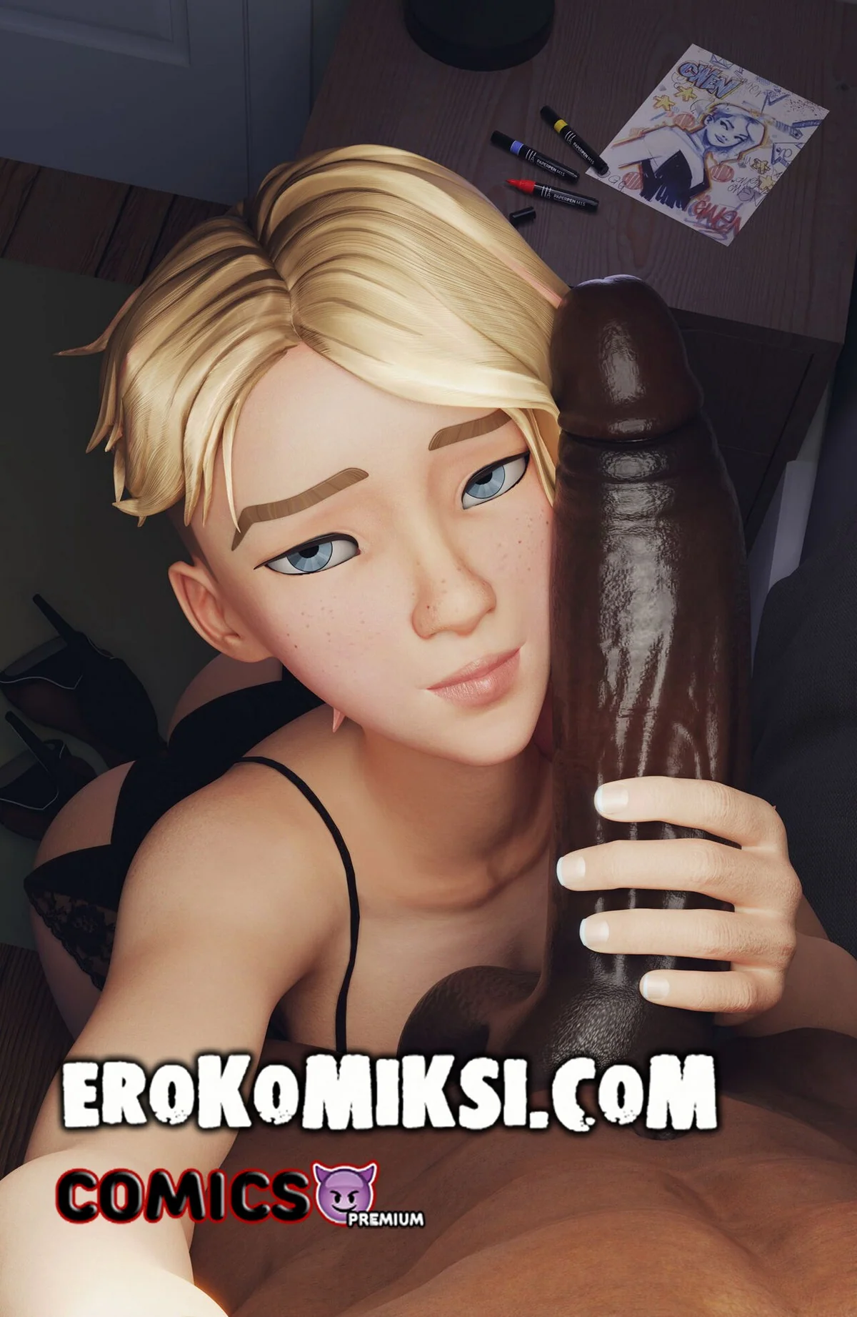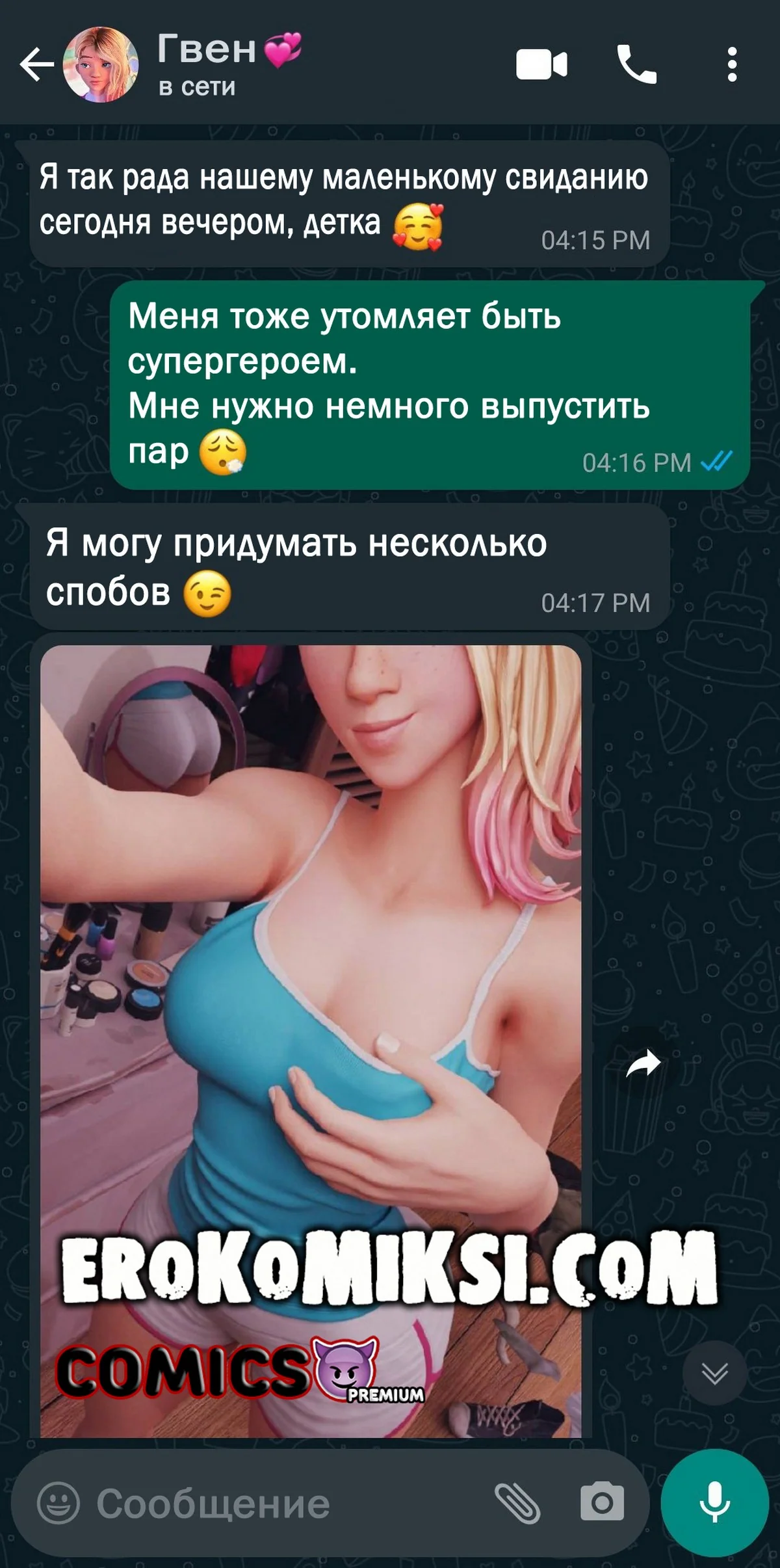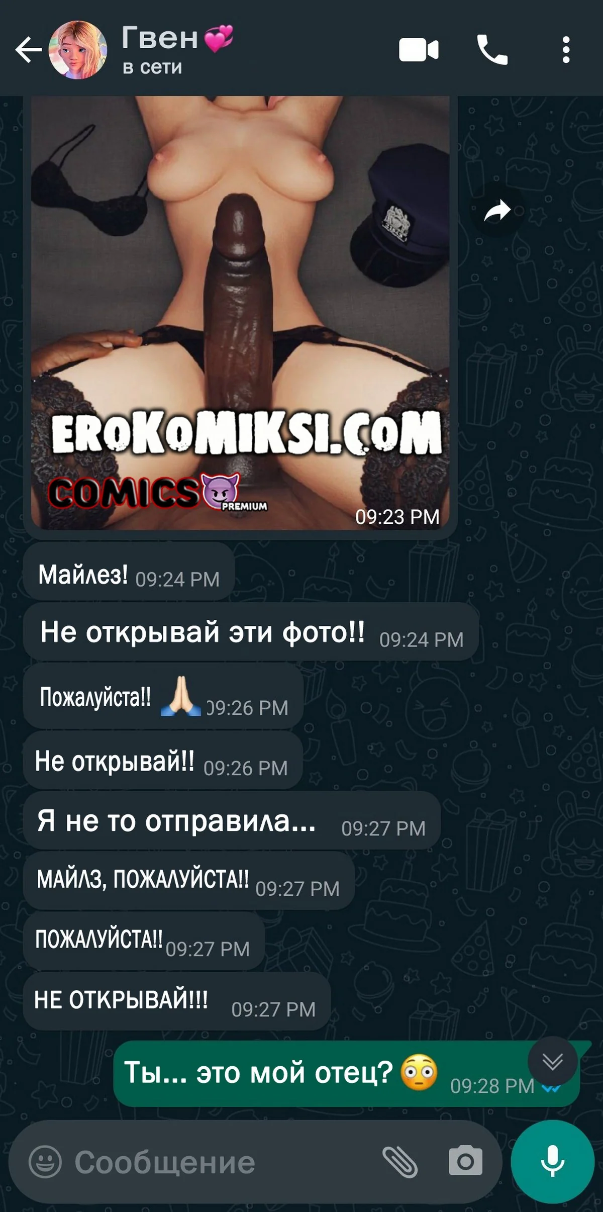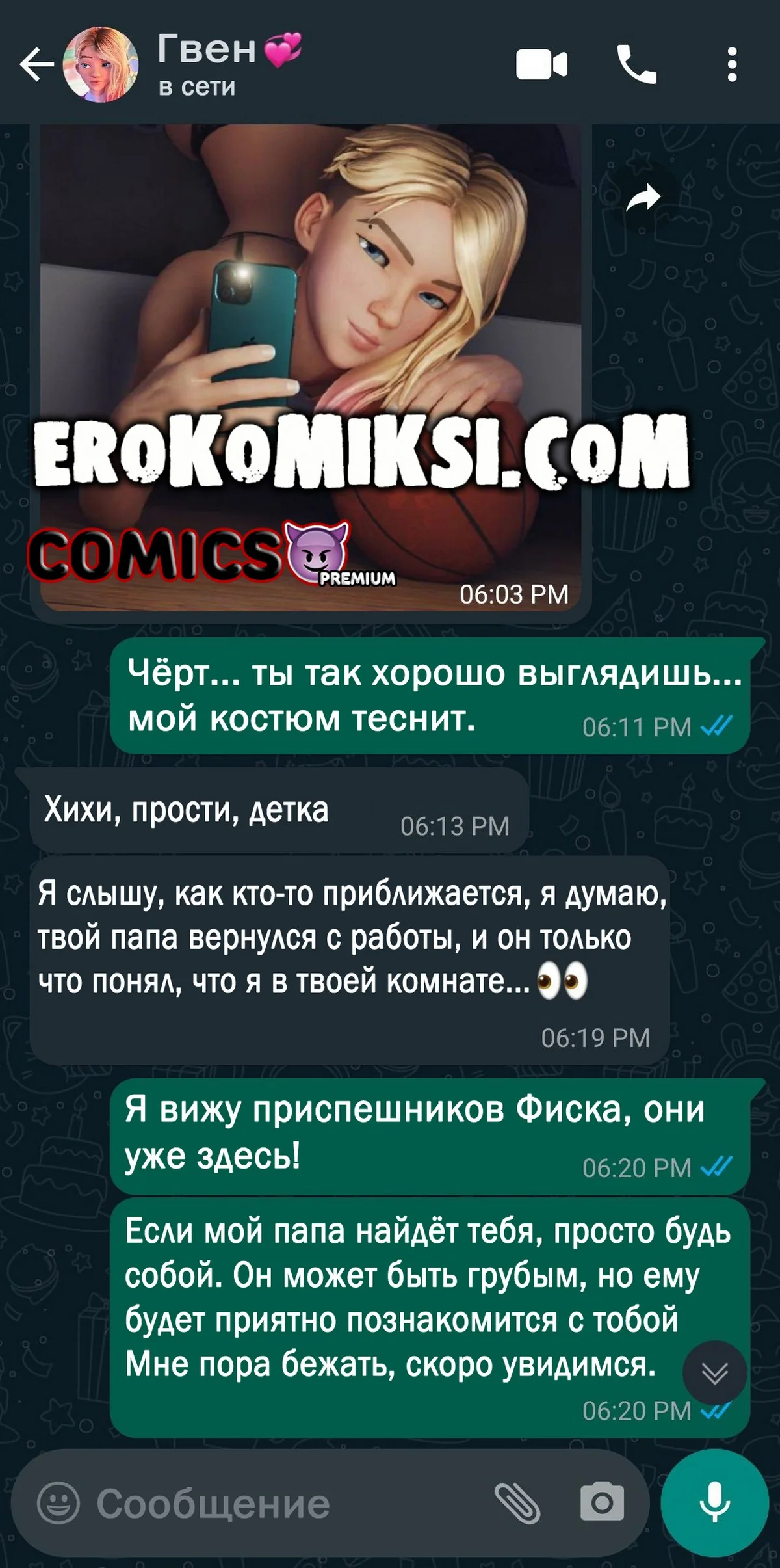 Порно комикс Гвен и папочка. Гвен пробралась в комнату Майлза, чтобы подождать его там, пока он дерётся со злодеями. Спустя некоторое время она случайно спалилась и отец Майлза решил наказать её за то, что она пробралась в дом…