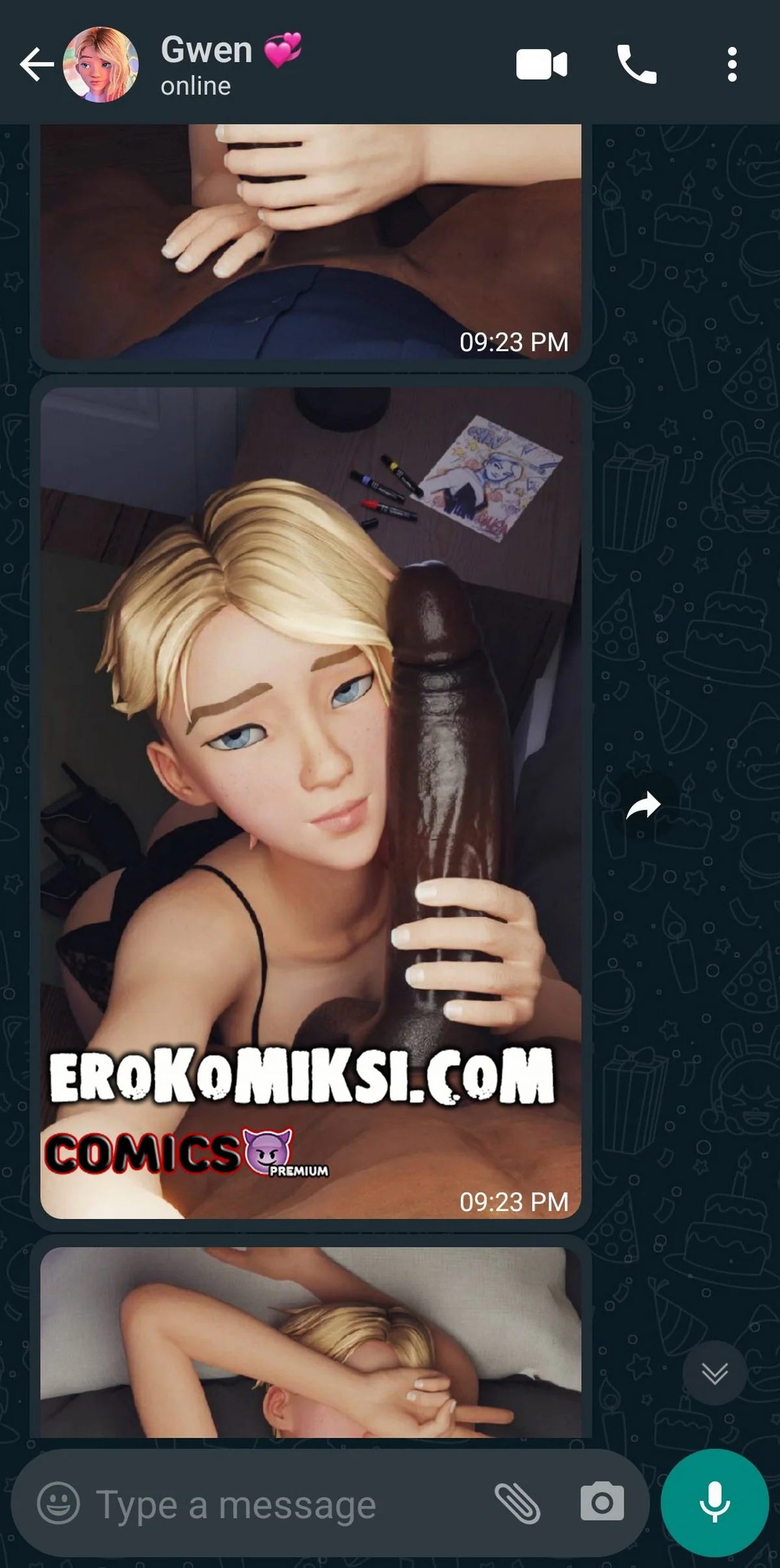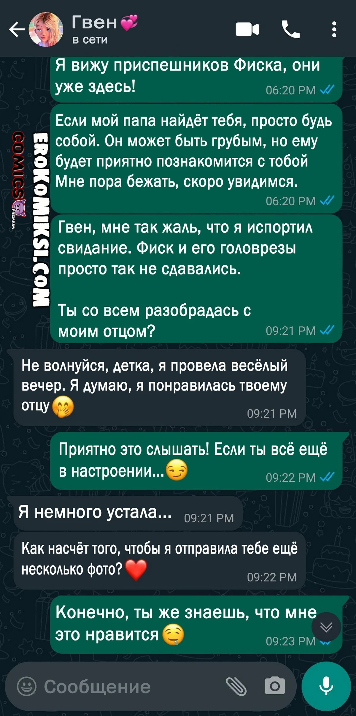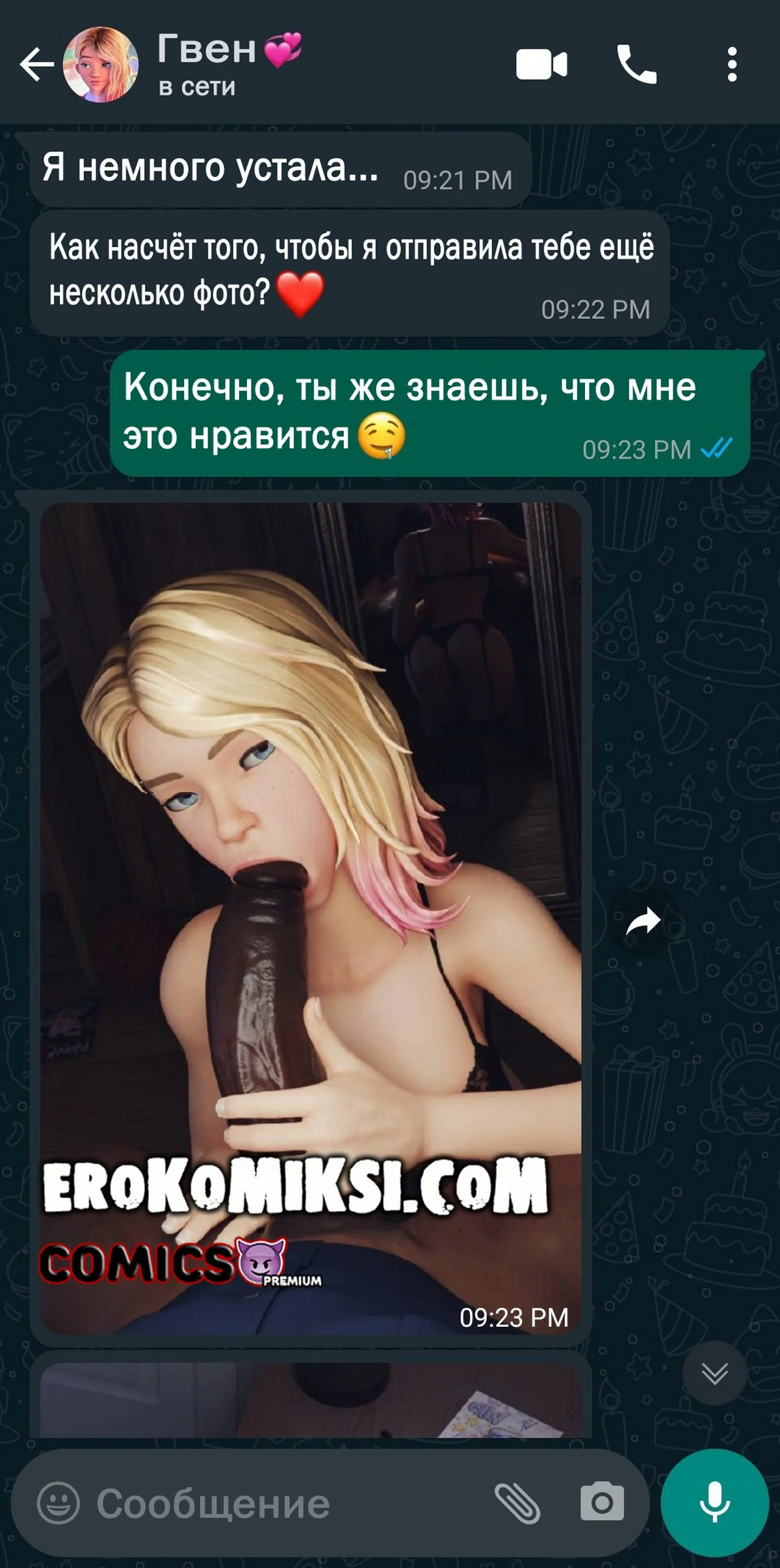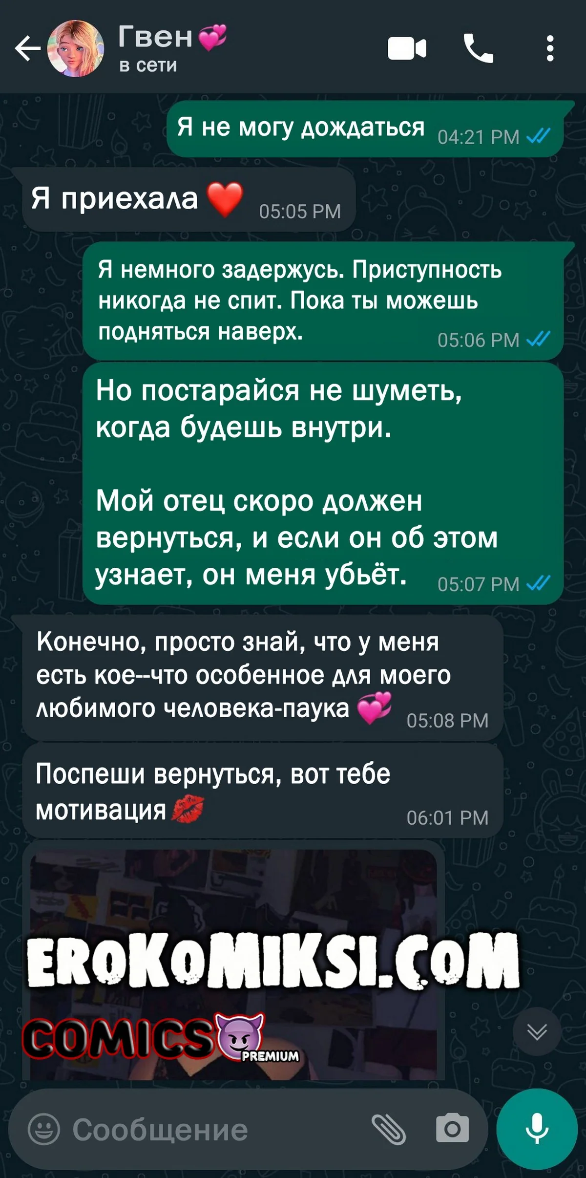 Порно комикс Гвен и папочка. Гвен пробралась в комнату Майлза, чтобы подождать его там, пока он дерётся со злодеями. Спустя некоторое время она случайно спалилась и отец Майлза решил наказать её за то, что она пробралась в дом…