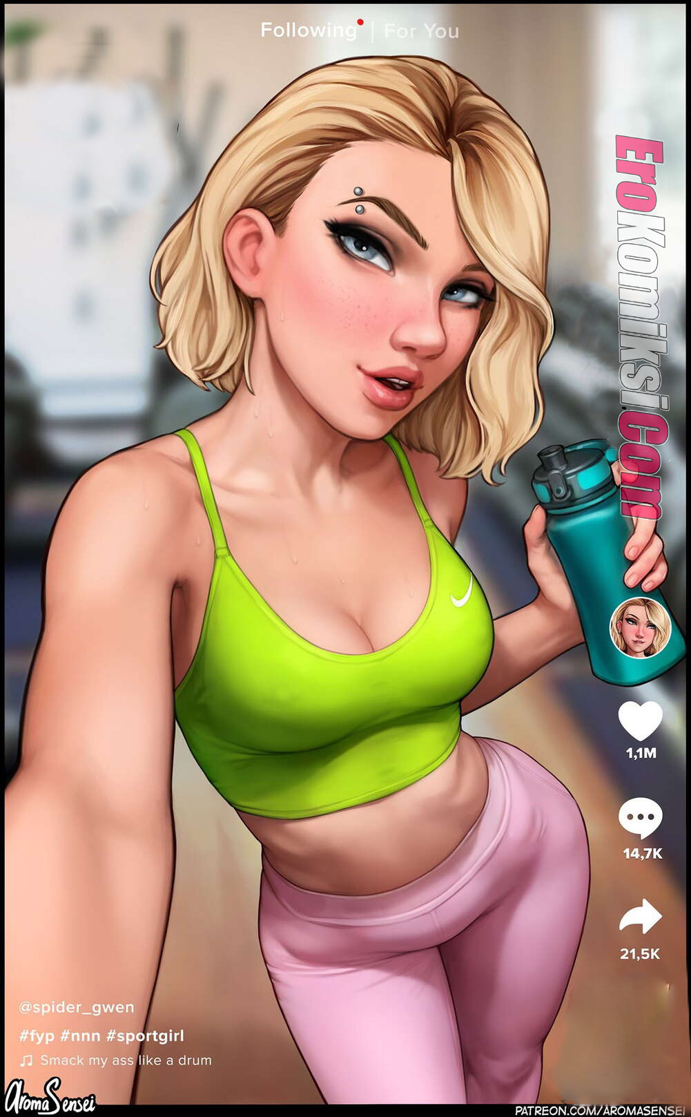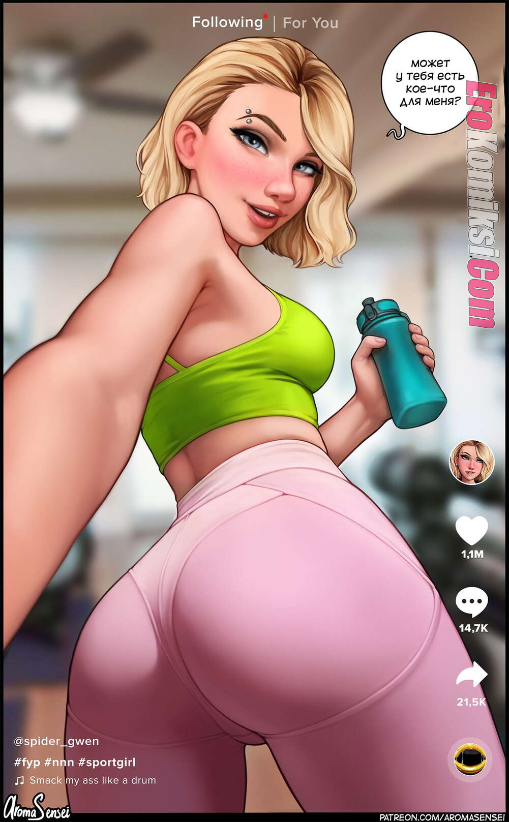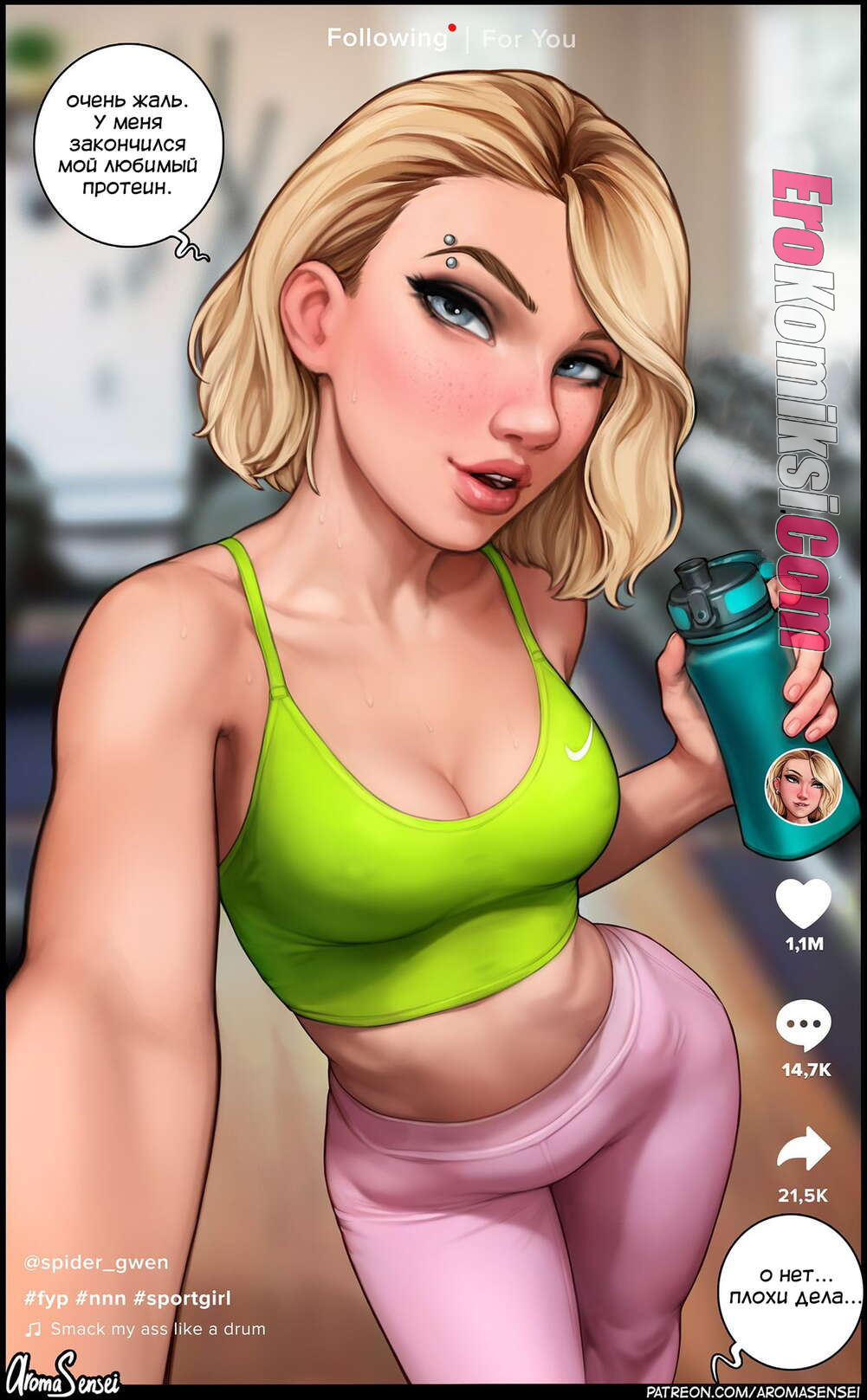 Порно комикс Гвен на тренировке. Gwen. AromaSensei. Развратная Гвен забыла свой протеин и решила вместо тренировки устроить порку и начала соблазнять парня.