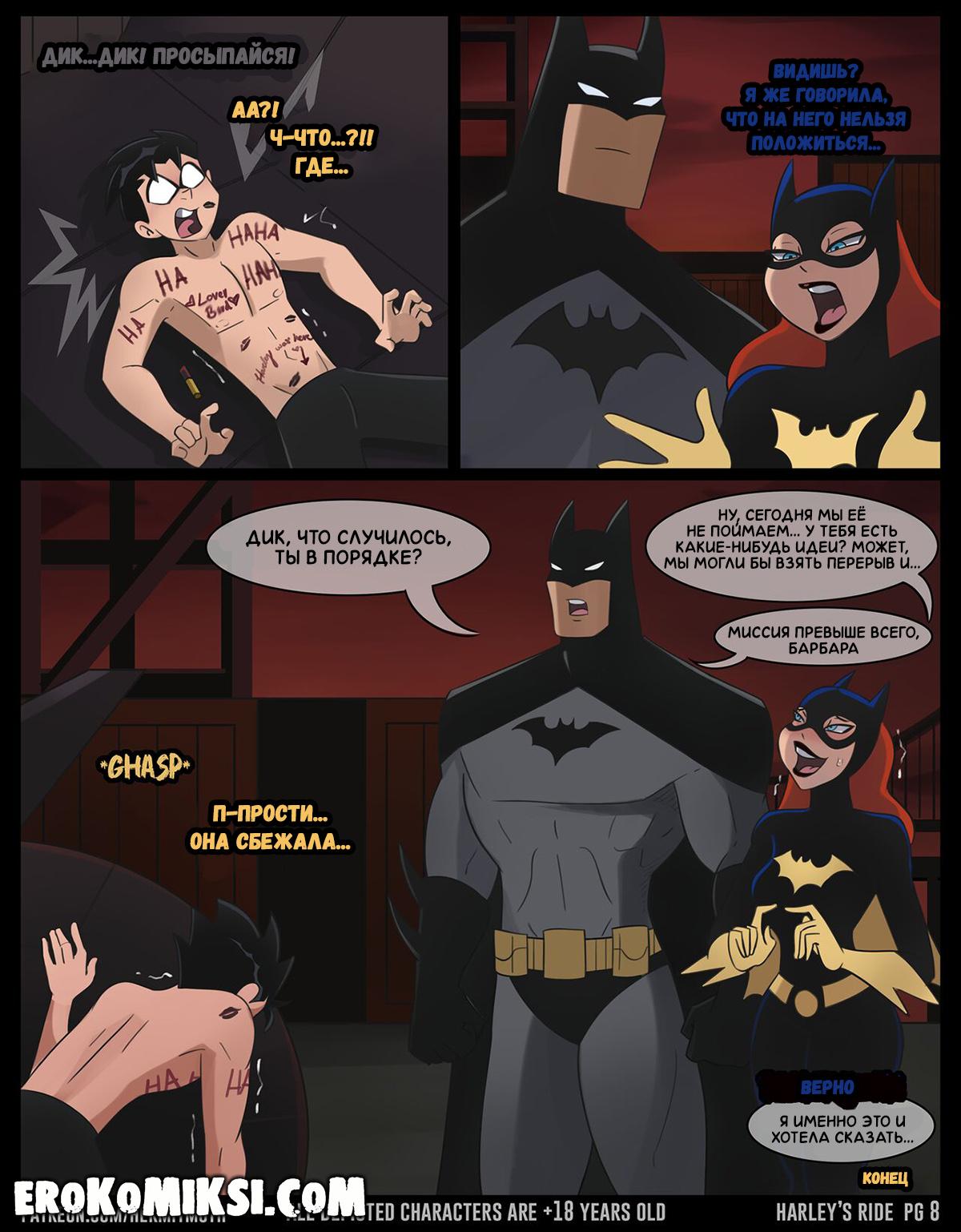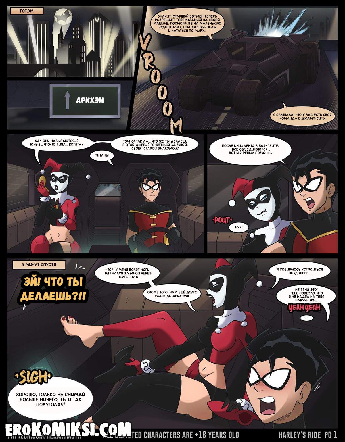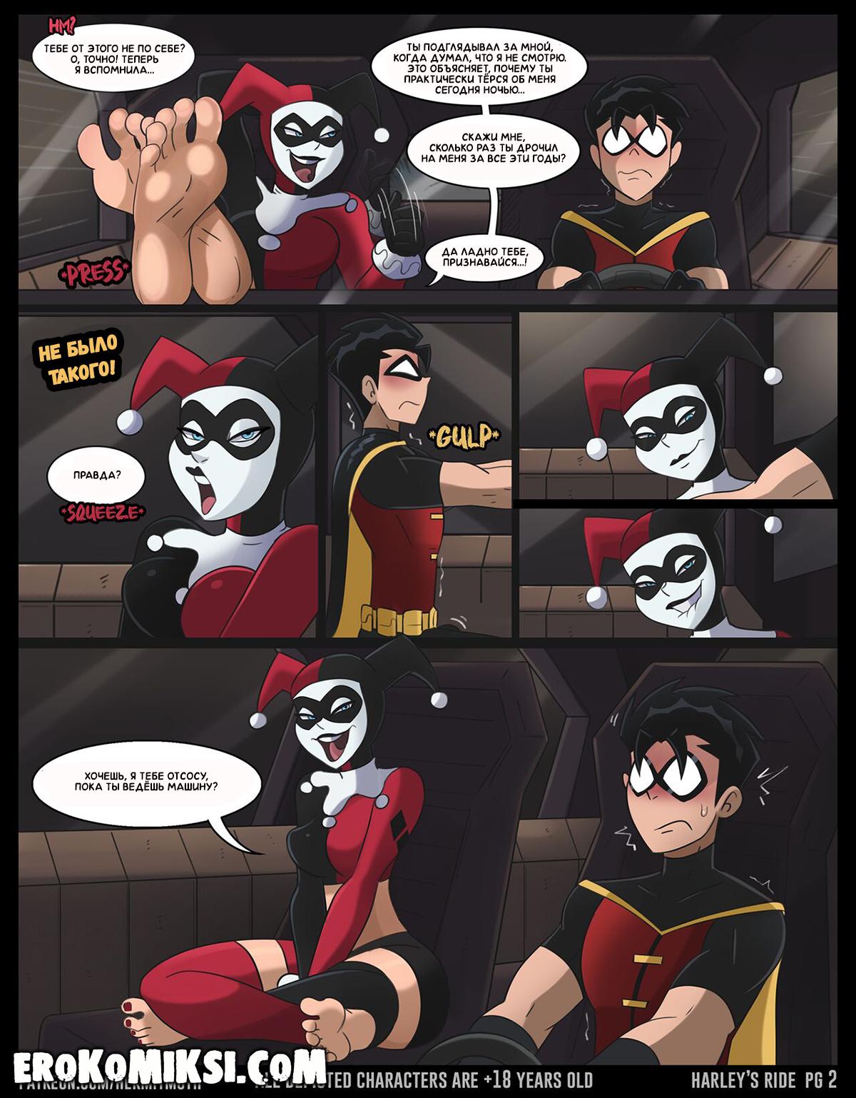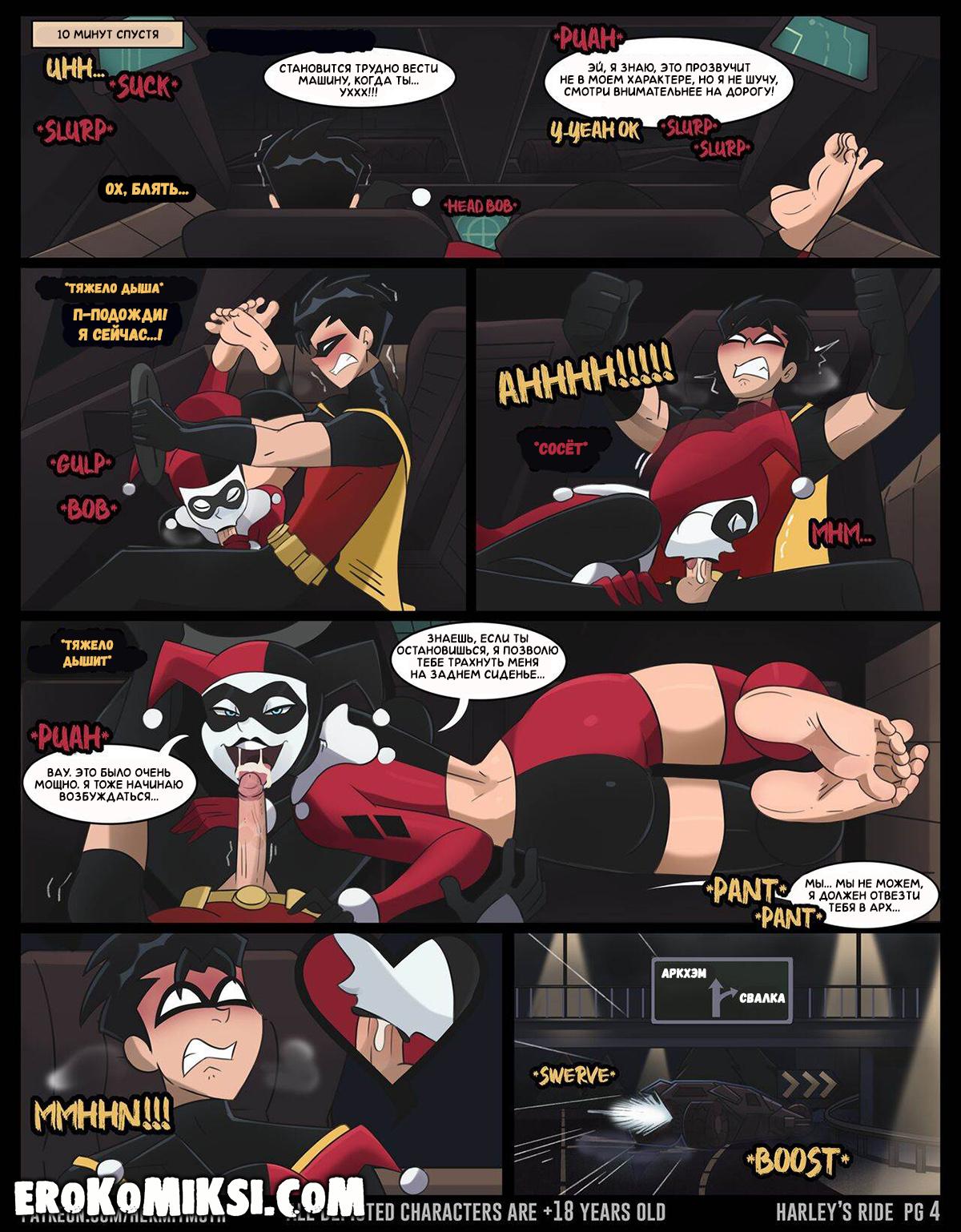 Порно комикс Харли Квинн. Весёлая поездка. У Робина было ответственное задание – поймать и доставить Харли к Бэтмену. Поймав Харли, Робин повёз её к Бэтмену, но в поездке, хитрожопая Харли начала соблазнять Робина и парень не смог устоять перед чарами красотки. Она достала его член и как следует отсосала и Робин наполнил её рот своей горячей спермой, что очень возбудило Харли и парочка перебралась на заднее сиденье, где они трахались несколько часов подряд…