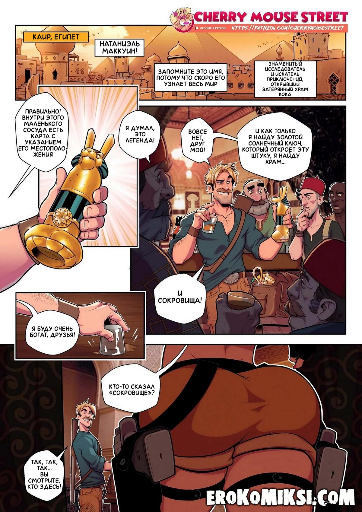 Порно комикс Хлоя Долл и храм члена. Нейт Маккуин опередил Хлою Долл в поисках сосуда, открывающего путь к сокровищам Кока. Но Хлою такой расклад не устраивал, и она решила хитростью украсть у Нейта сосуд. Она затащила его в номер отеля, где вытащила из штанов его огромный член и принялась сосать, пока Нейт не обкончал всё лице Хлое и вырубился.//