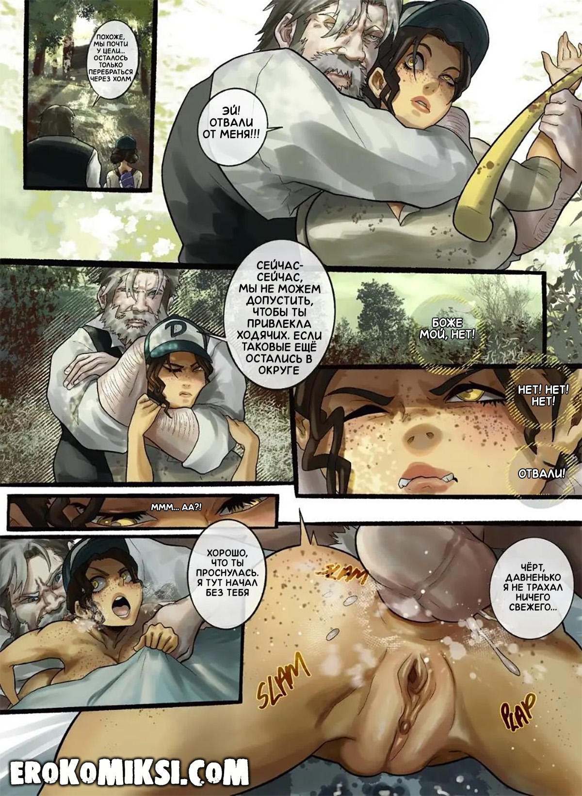 Порно комикс Ходячие Мертвецы. Не доверяй незнакомцам. Клементина скиталась в одиночестве по лесу и наткнулась на старика, который направлялся в свою хижину, и она решила последовать за ним. Девушка не знала, что нельзя верить первому встречному и стала его сексуальной рабыней, ведь старик долго не трахался и теперь, целыми днями напролёт развлекается с сисястой красоткой…