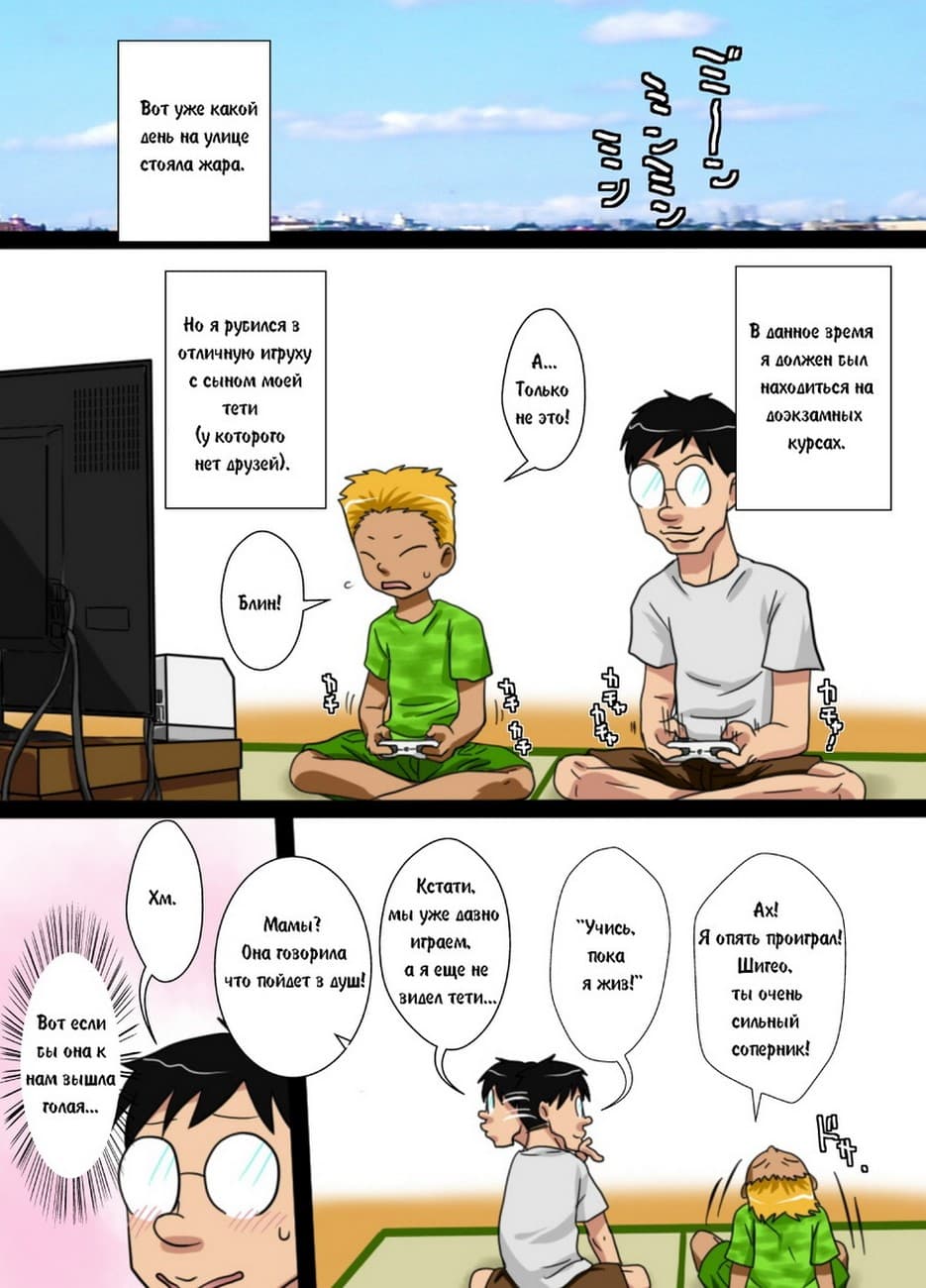 В этом цветном хентай комиксе вы увидите, как наглый парень Шигео опять пришел в гости к тете с твердым намерением трахнуть ее. Он на спор стал играть с ней в компьютерную игру, и выиграл. Еще бы, теперь он мог ее потрогать… А дальше, конечно же жесткий секс.