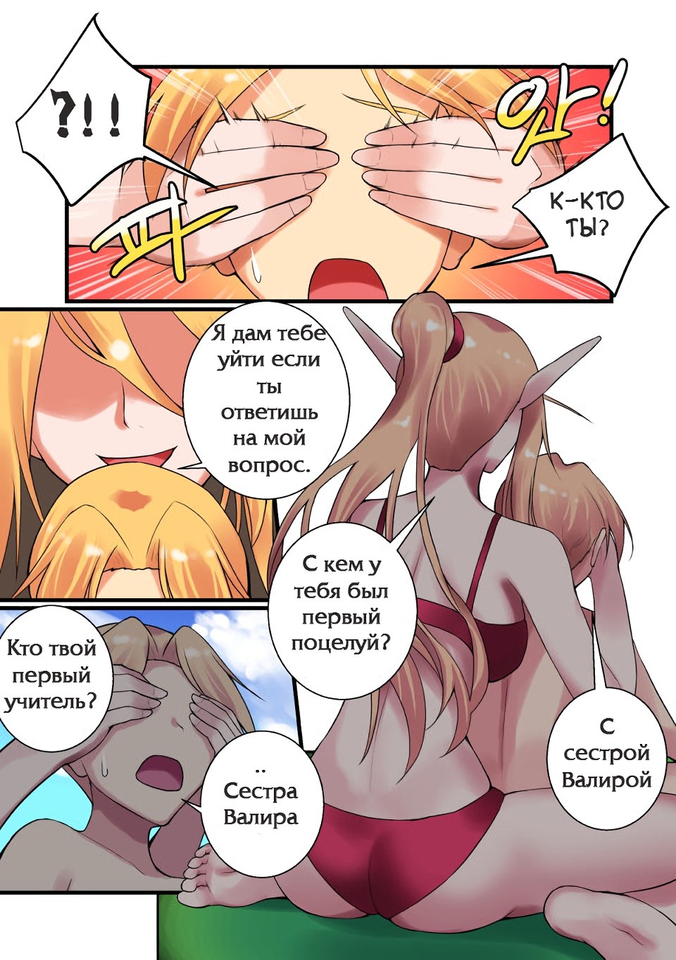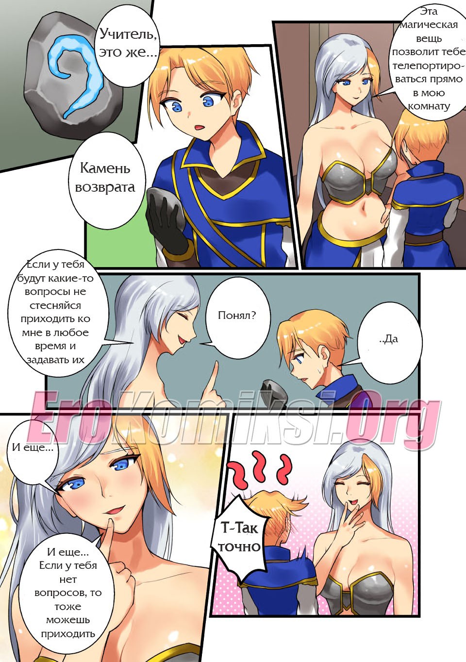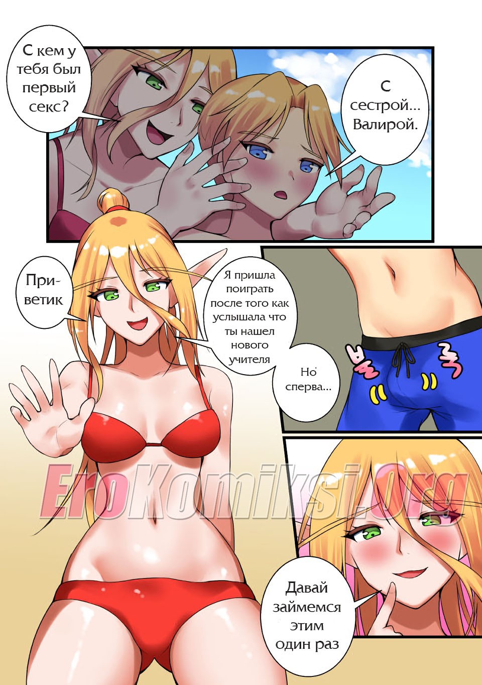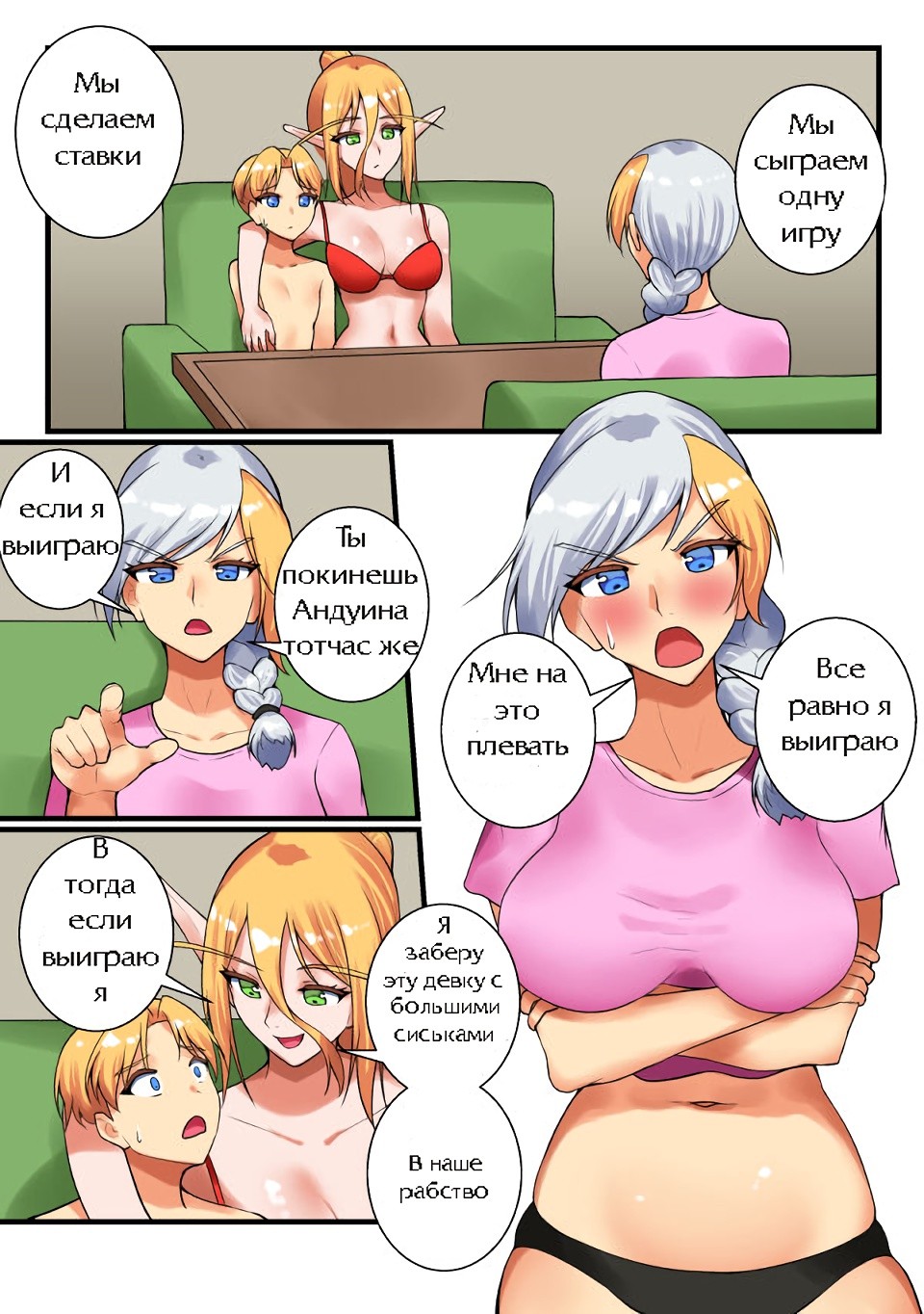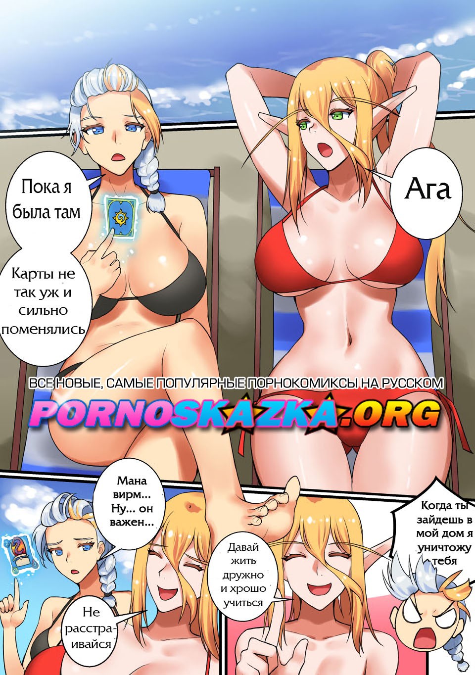 Порно комикс «Игра в карты с учителем» начинается с того, что решительная Андуин пришла к купающейся в пруду специалистке по Hearthstone и прямо попросила взять её в ученицы. Та сказала, что для обсуждения этой темы ей, по крайней мере нужно выйти из пруда и одеться… А потом она предложила в качестве теста поиграть в карты…