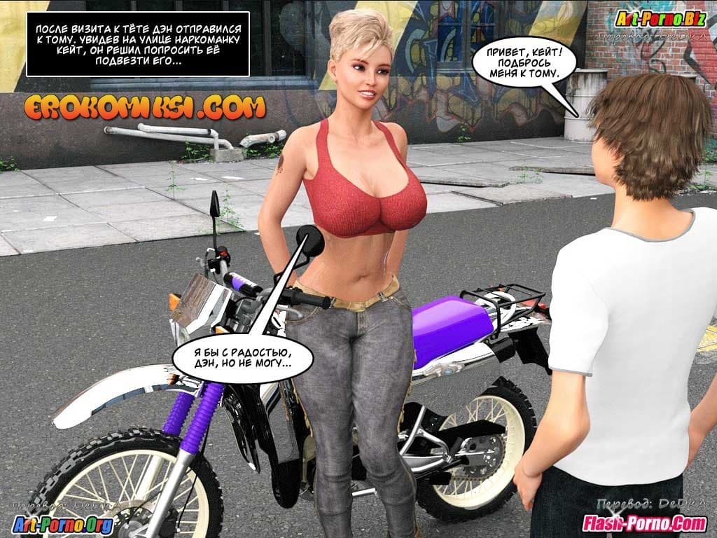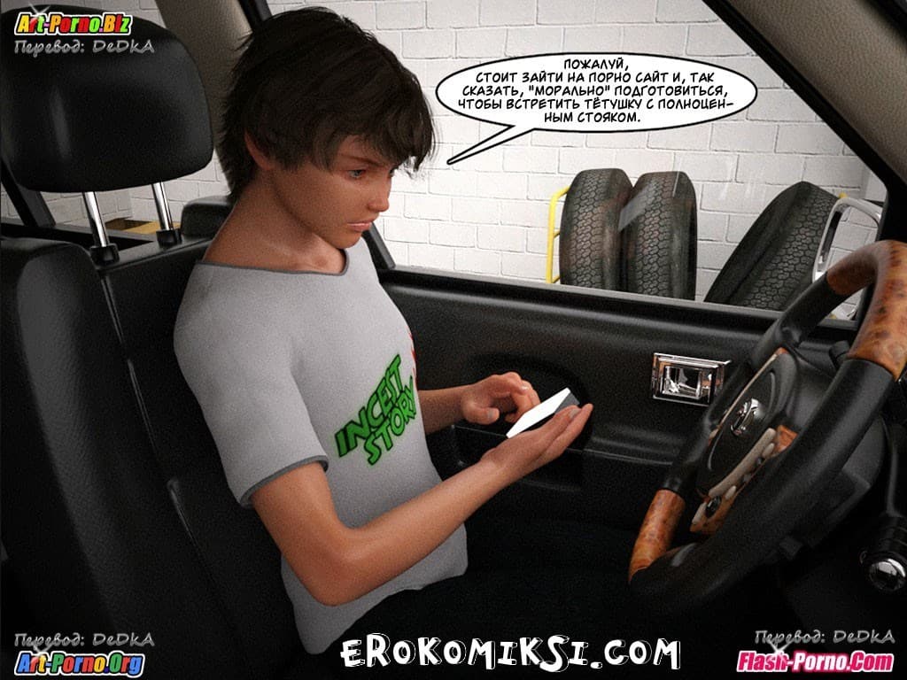 Представляем вашему вниманию порно комикс инцест история 4 эпизод. Как-то, в выходной день Дэн увидел, как его мамаша отсасывает отцу. Это зрелище так сильно возбудило парня, что он захотел немедленно заняться с кем-нибудь сексом. Только вот с кем? Его сестры не было дома, на проститутку нет бабла, а подругу сестры, по имени Николь, Дэну просто нечем шантажировать, поэтому она не даст ее трахнуть. Остаётся только аппетитная тётя Лиза! Ну, что же вперед к ней в гости…