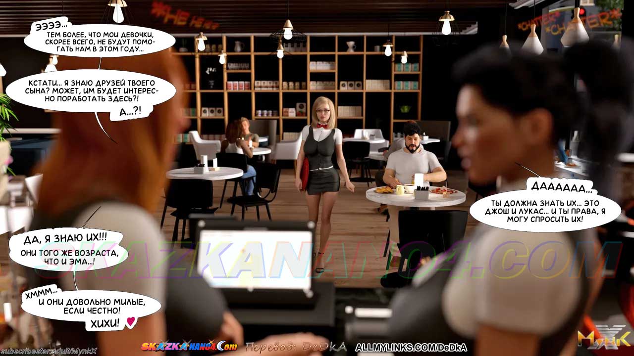 Порно комикс Кафе Фоли. Часть 1. Лиза работает в кафе. Она делится с подругами, которые работают вместе с ней, тем, что ей очень одиноко без мужа, который задерживается в командировке. Одна из подруг, муж которой не балует ее своим вниманием, предлагает Лизе взять еще одну подругу и втроем провести вечер в баре, чтобы пофлиртовать с мужчинами, но Лиза отказывается, сославшись на то, что ее сын приведет вечером своих друзей, и нужно приготовить им ужин, на что подруга в шутку говорит, что теперь она понимает, почему Лиза не хочет идти в бар, ведь у нее дома вечером будут молоденькие парни! Это, конечно, была шутка, но, как известно, в каждой шутке есть только доля шутки…