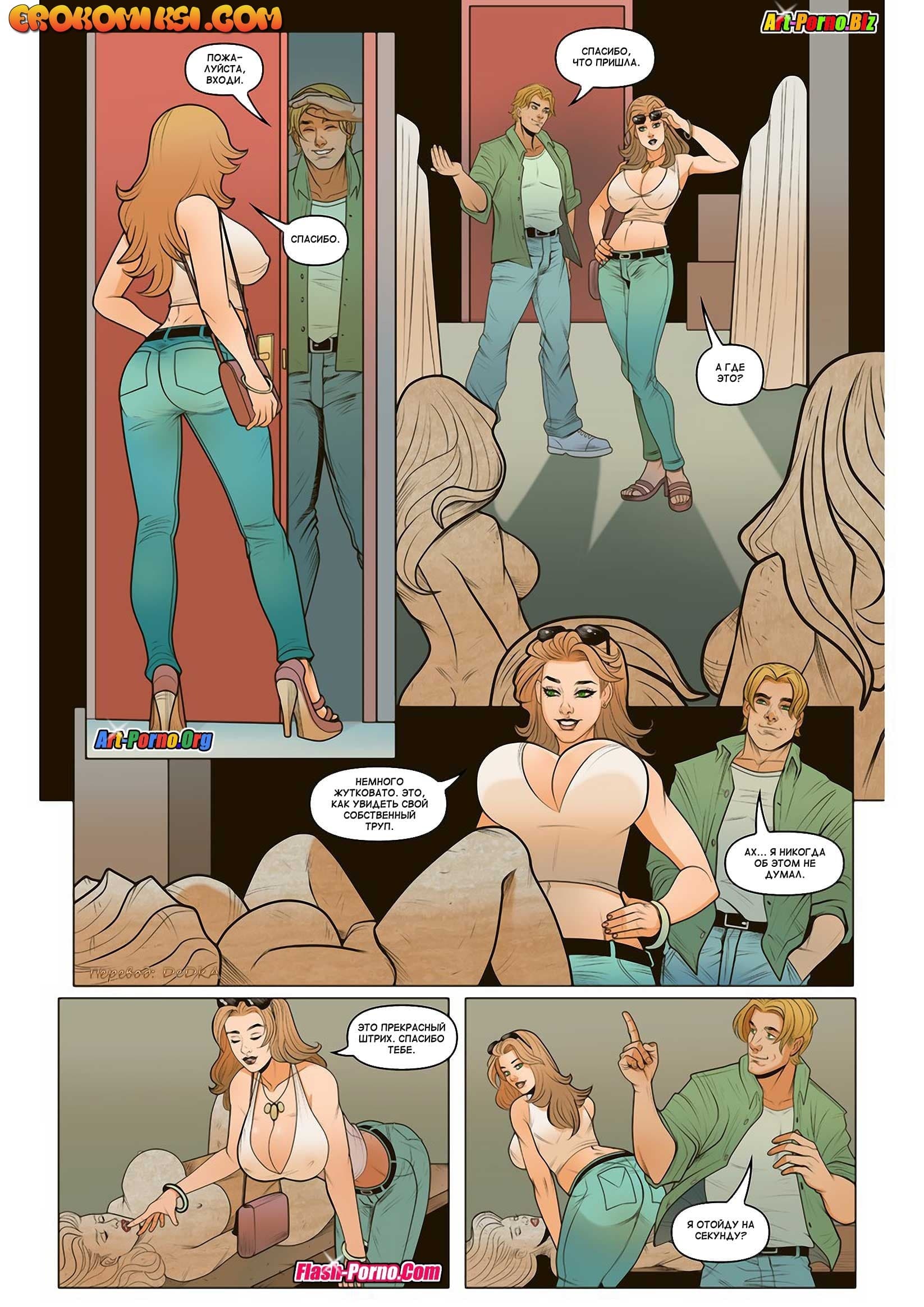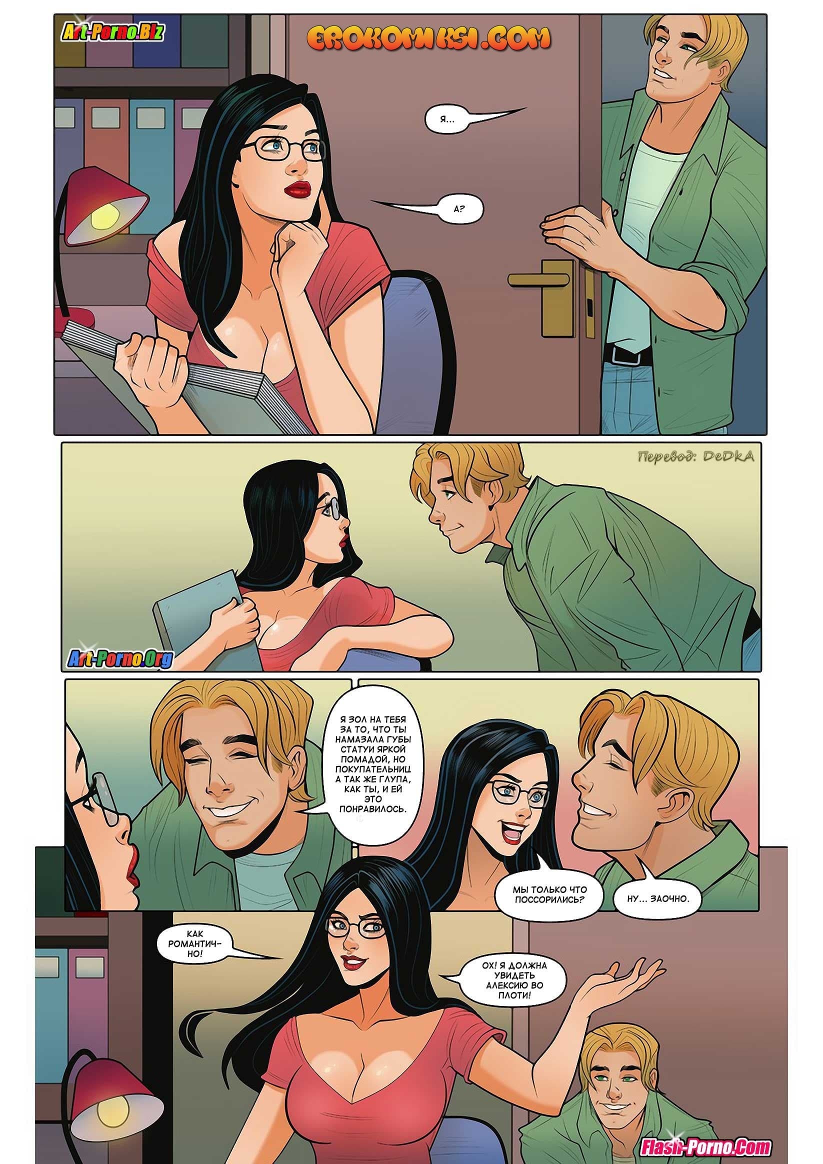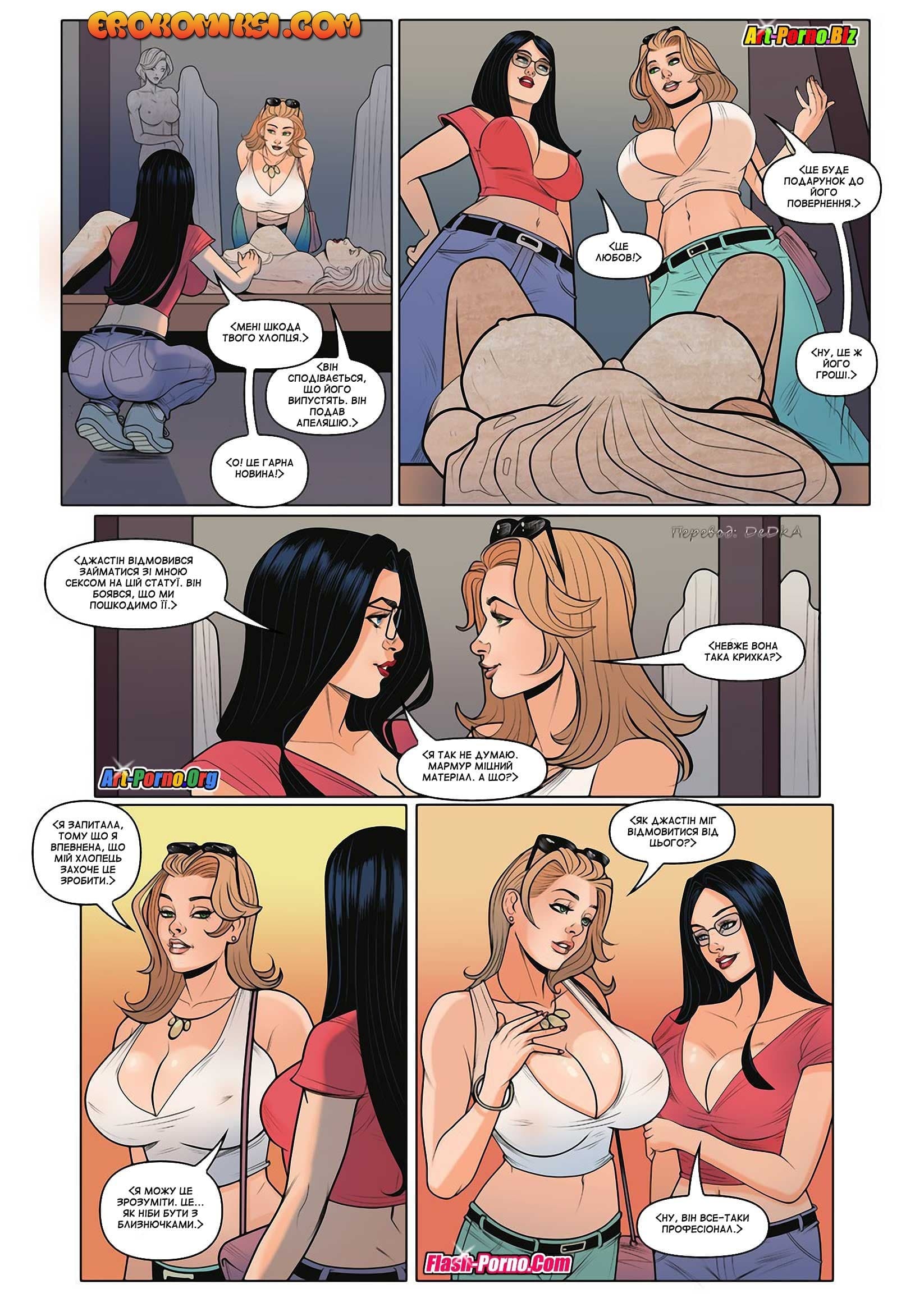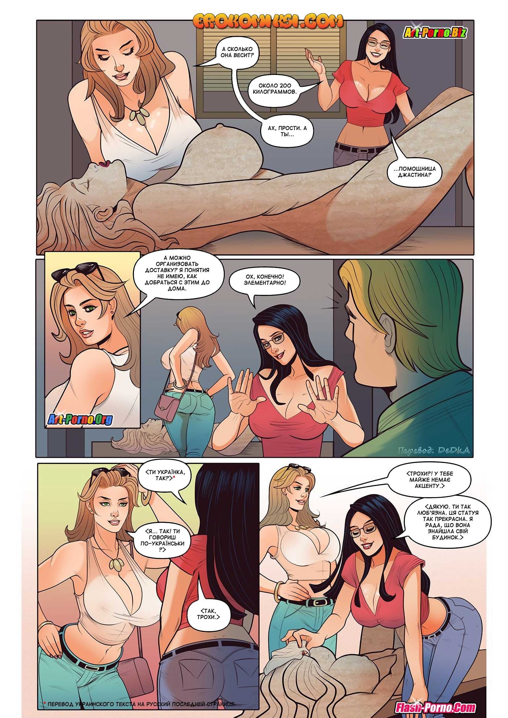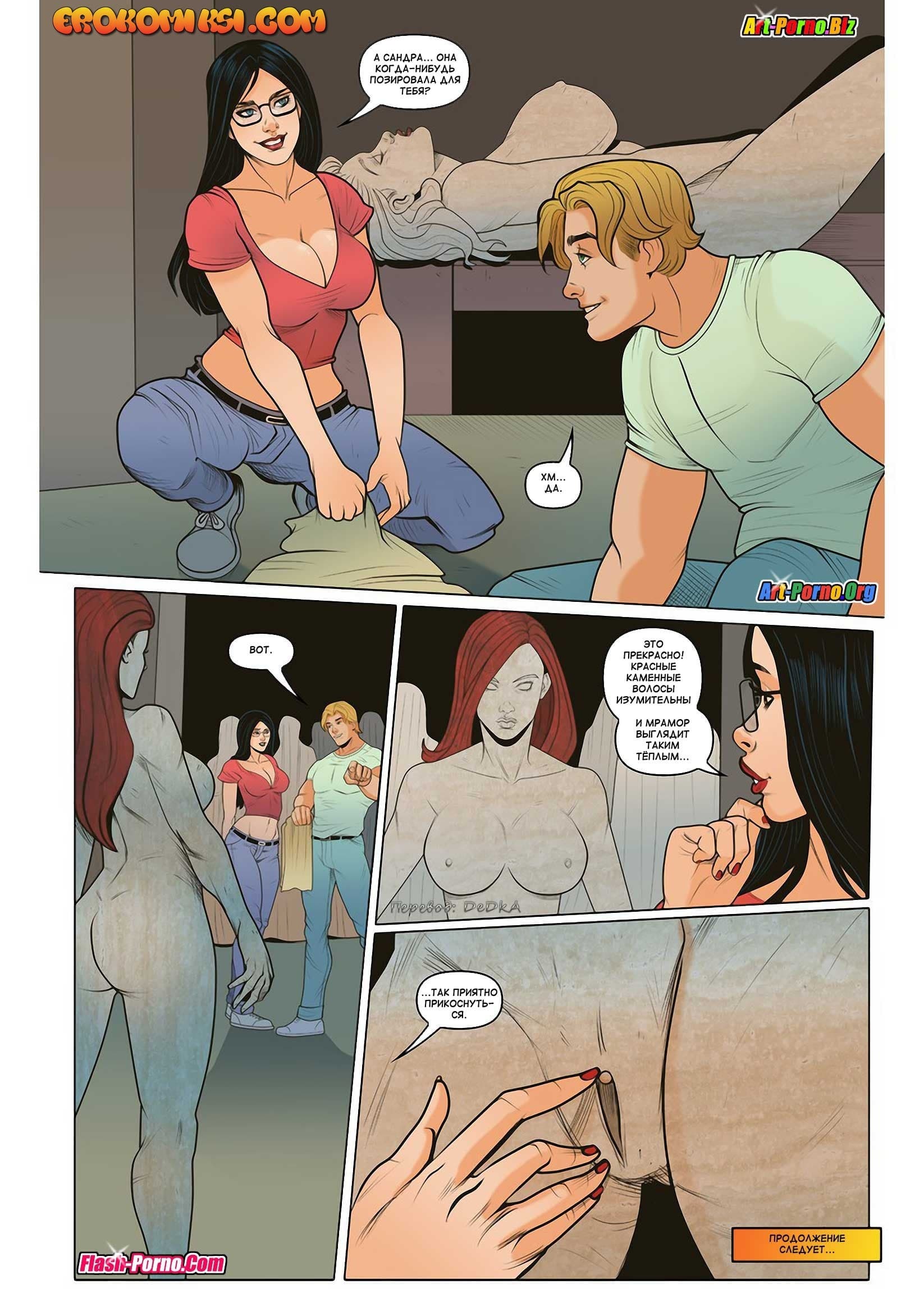 И так, 5 часть секс комикса Канадская подруга начинается с того, что к скульптору, Джастину, неожиданно нагрянула девушка. Как выяснилось, именно ее скульптуру заказал парень этой девушки. Правда, парень угодил за решетку, но он очень надеялся на скорое освобождение. Сегодня же, девушка пришла забрать скульптуру, дабы приготовить подарок своему бойфренду, к его возвращению домой. Но, неожиданно, подруга скульптора предложила гостье, прежде, чем забрать заказ, проверить, не треснет ли она, если на ней… заняться сексом..?