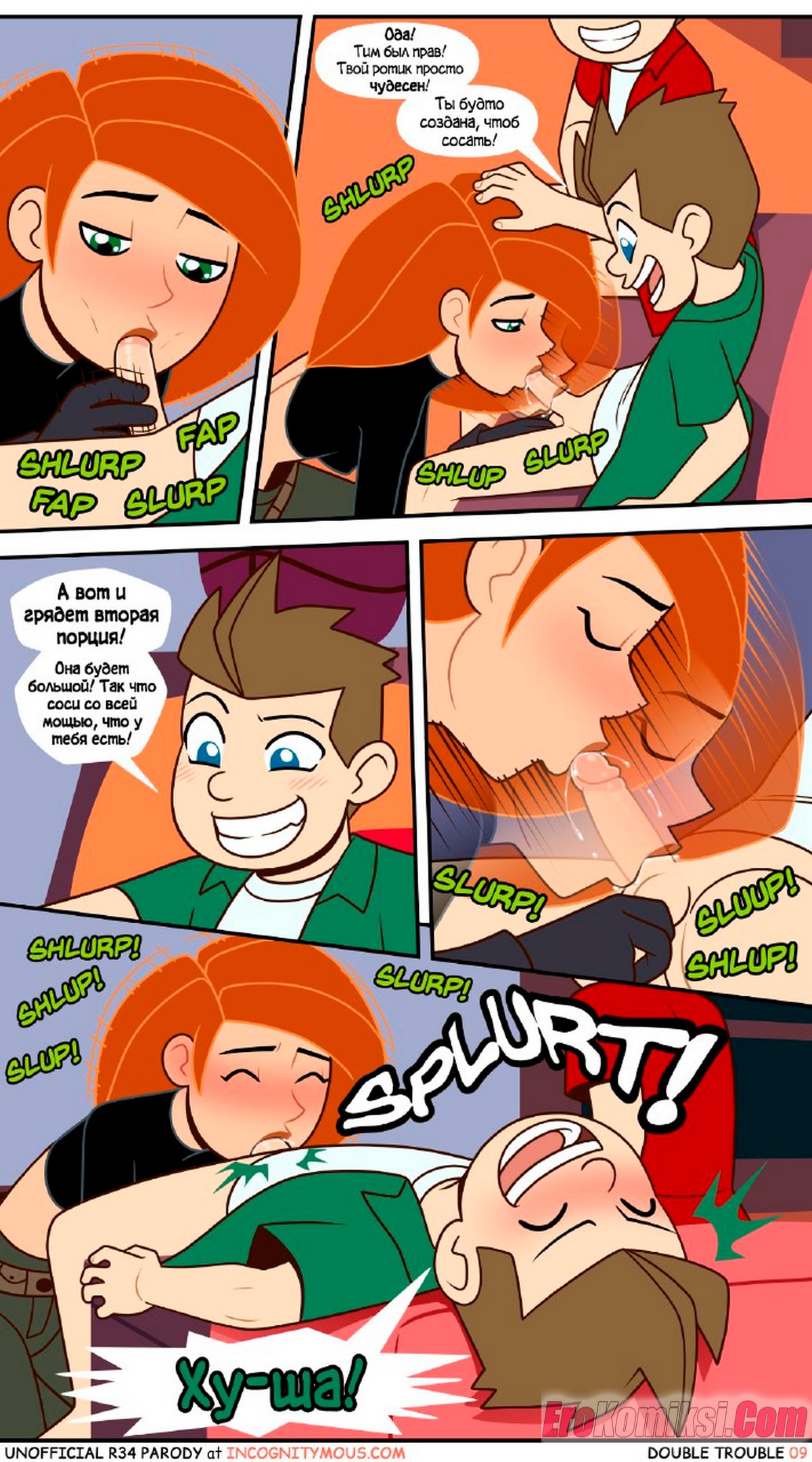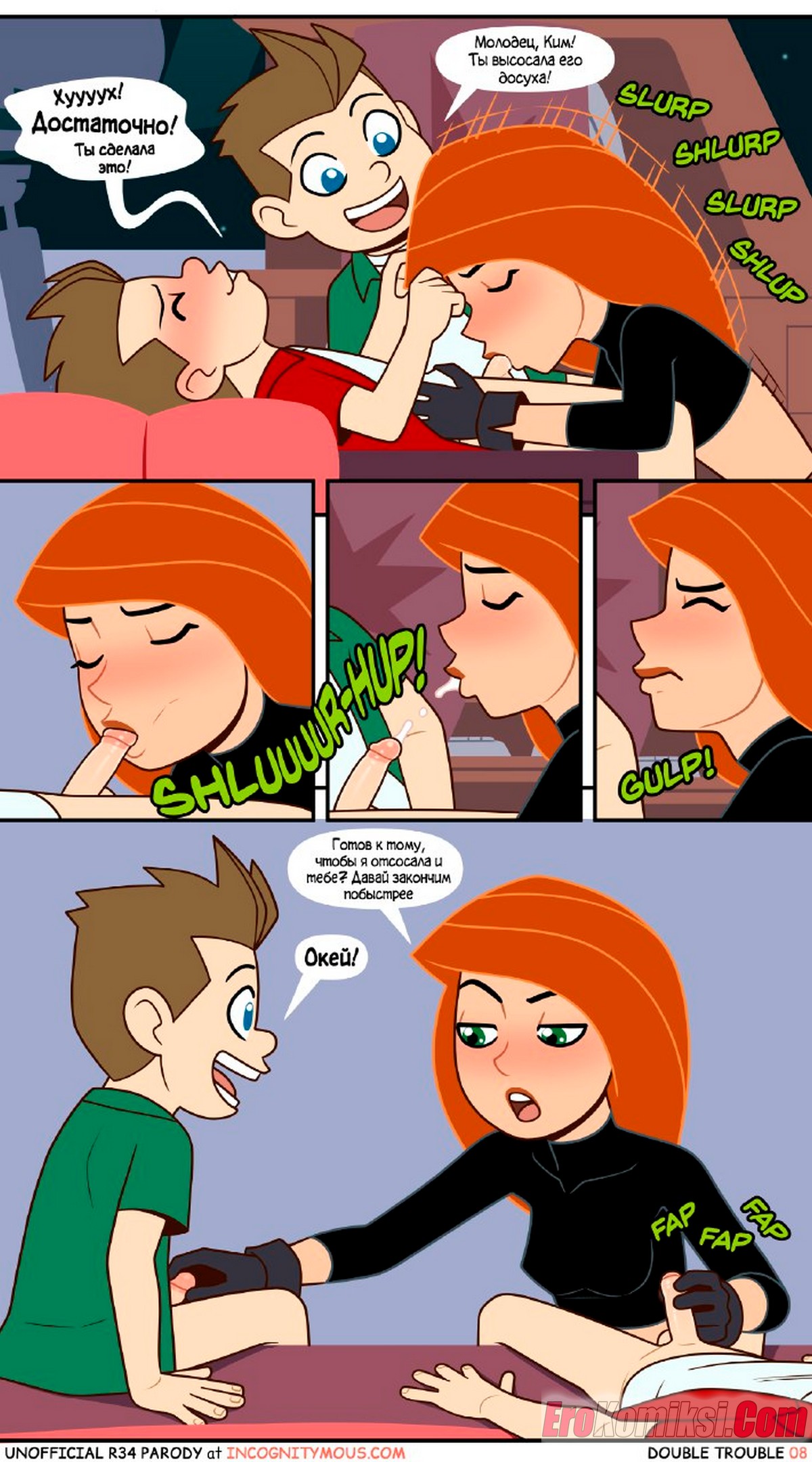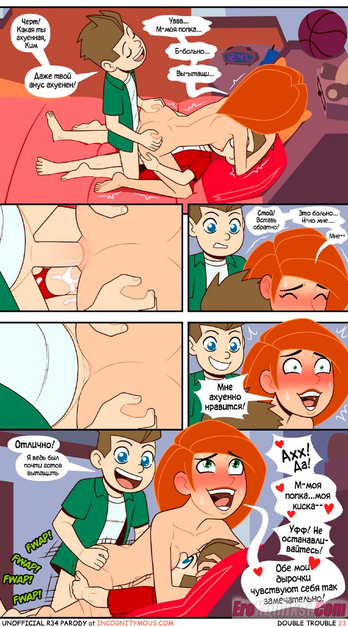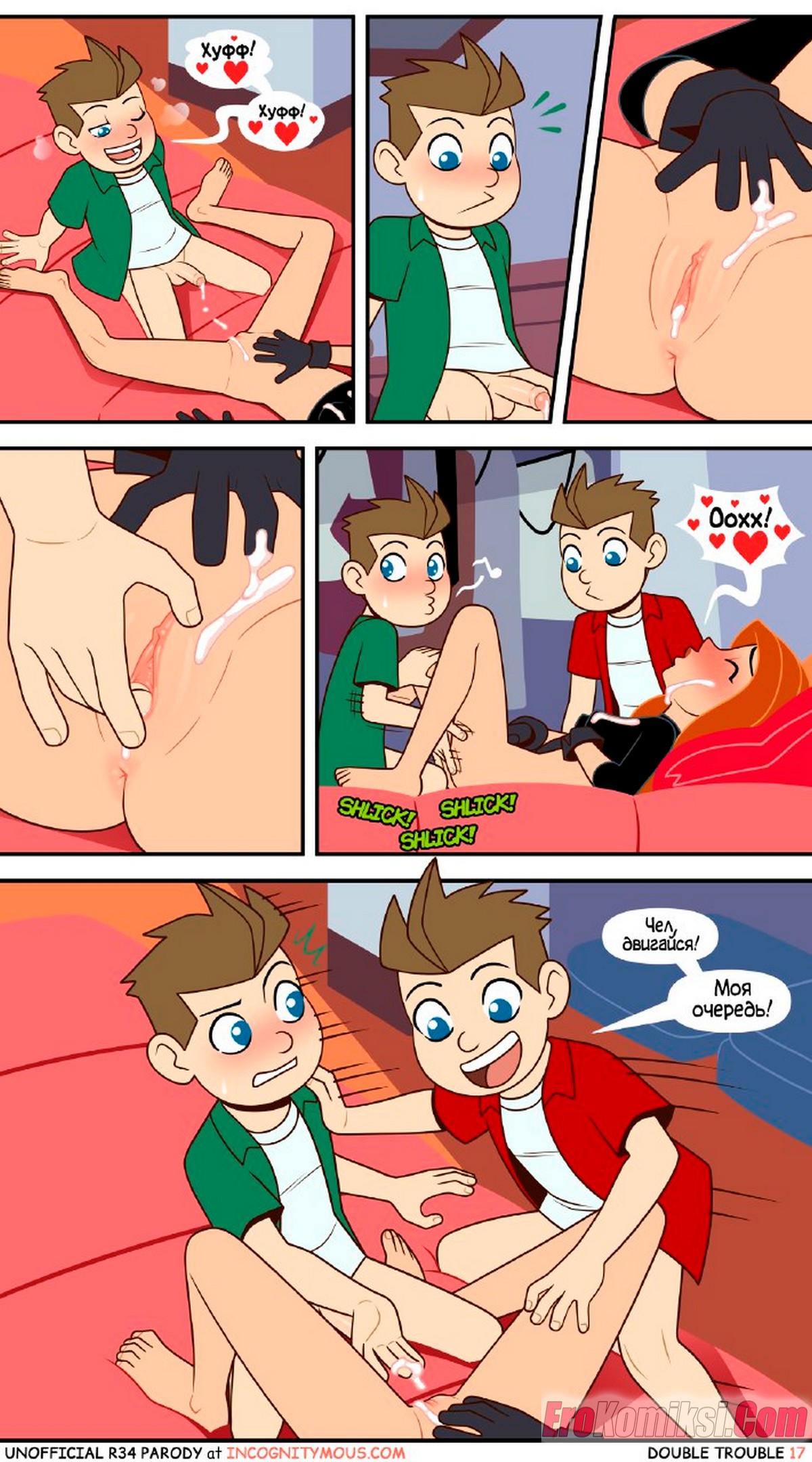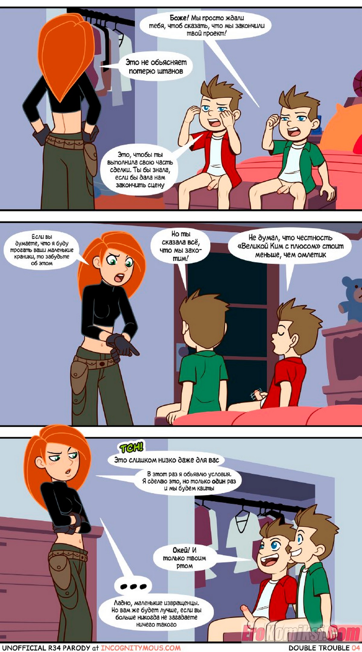 Порно комикс Ким 5+. Двойные неприятности. ПОЛНОСТЬЮ В ЦВЕТЕ!!! Double Trouble. Incognitymous. Двое вундеркиндов подслушали, что девушке нужна помощь в учебе. Они предложили свои услуги в замен на секс, красотка не долго ломалась. так как выхода у нее нет.