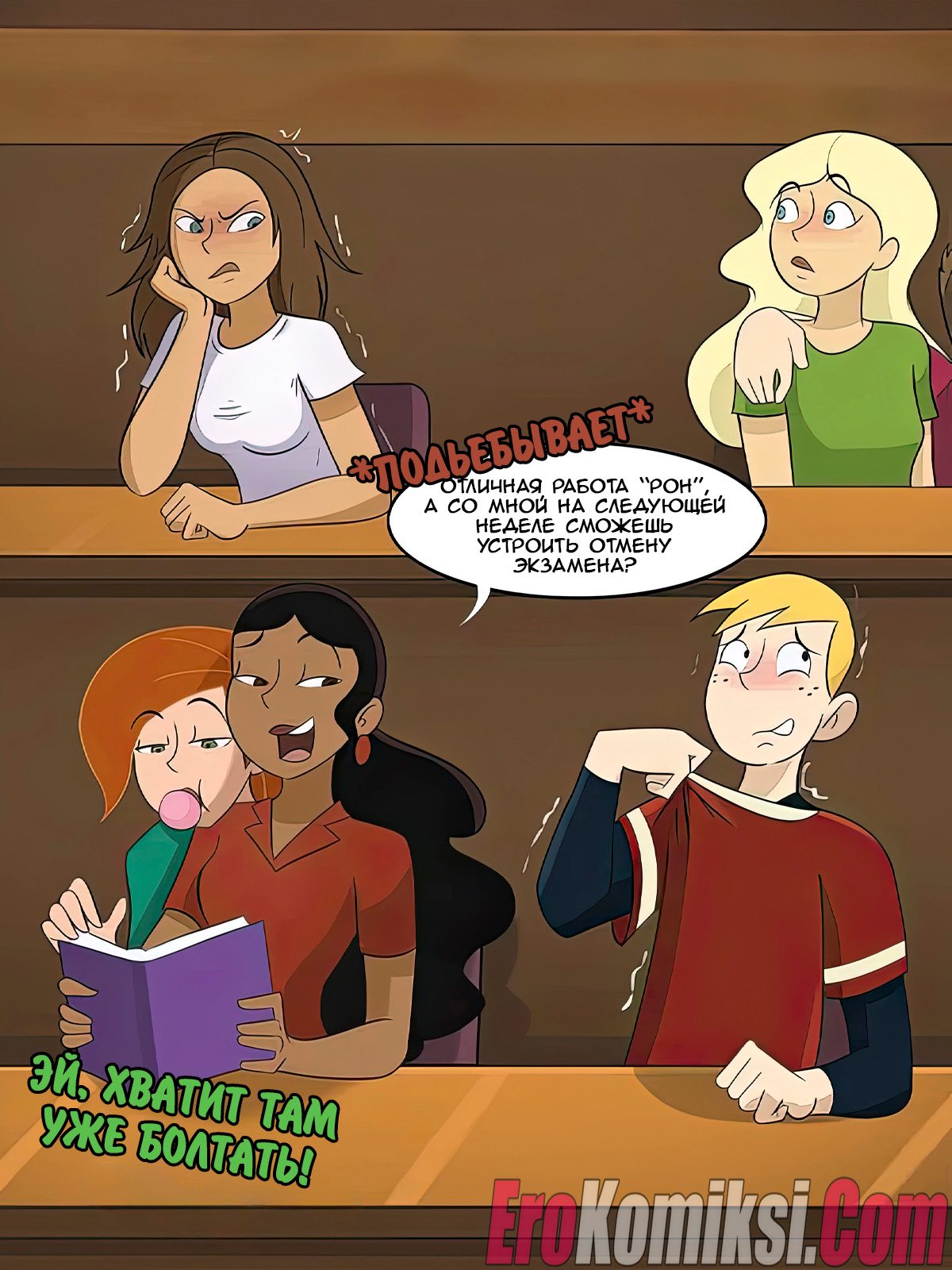 Порно комикс Ким 5+. Шиго опаздывает на урок. Shego is Late to Class. Hermit Moth. Озабоченному Рону и его постоянно думающем о сексе одноклассникам предстоит особый тест на уроке у шикарной зрелки Шиго. Парень же с самого с утра встретился с милфой учительницей и хорошенько ее трахнул, из-за чего она совсем не успела провести тест…