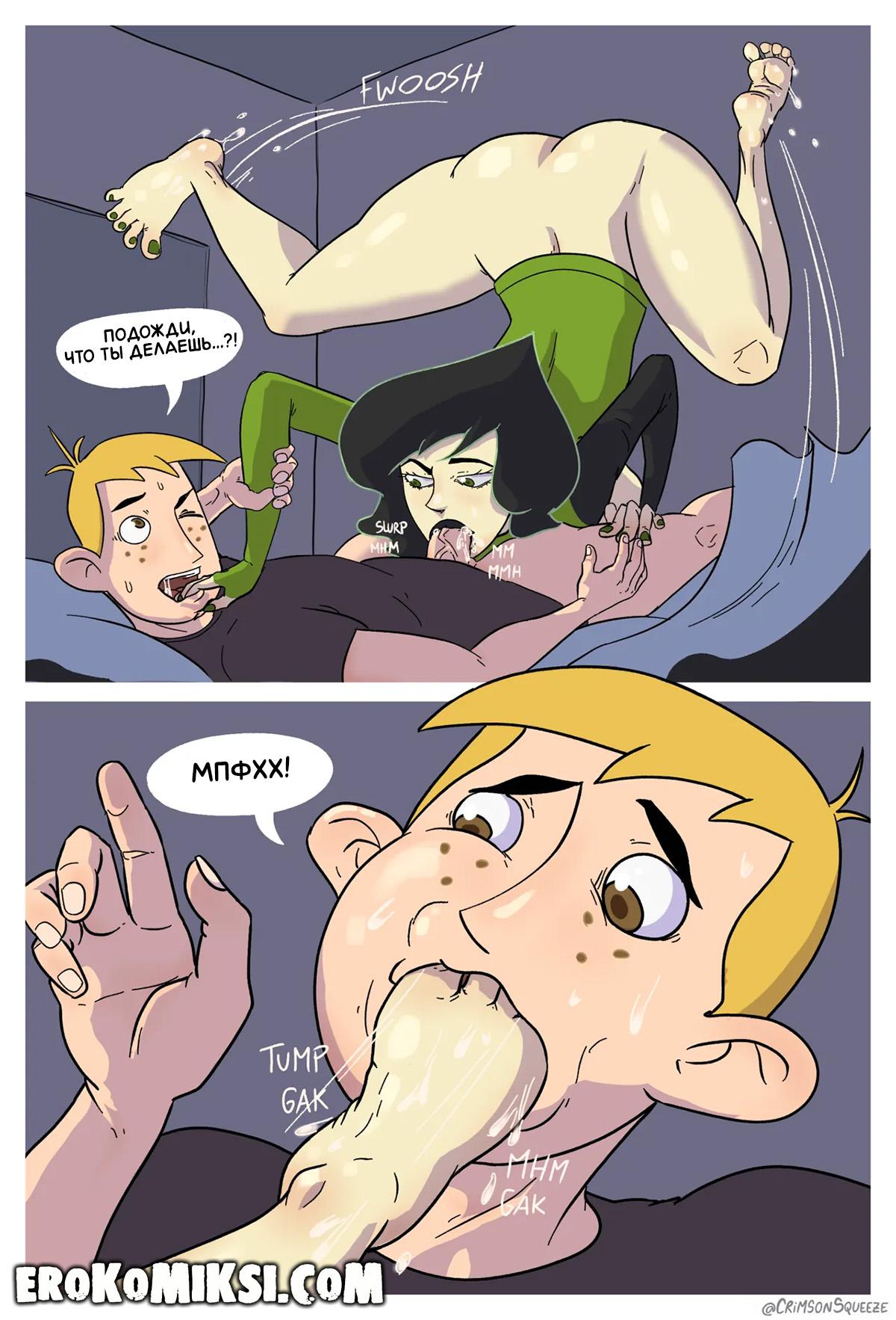 Порно комикс Ким 5+. Шиго под прикрытием. У Шиго особое задание, она должна уничтожить Ким и для этого, втёрлась в доверие к Рону и когда он был дома один, она появилась из ниоткуда и набросилась на его огромный, и как следует отсосала…