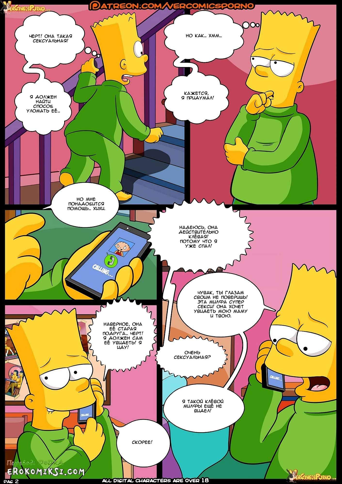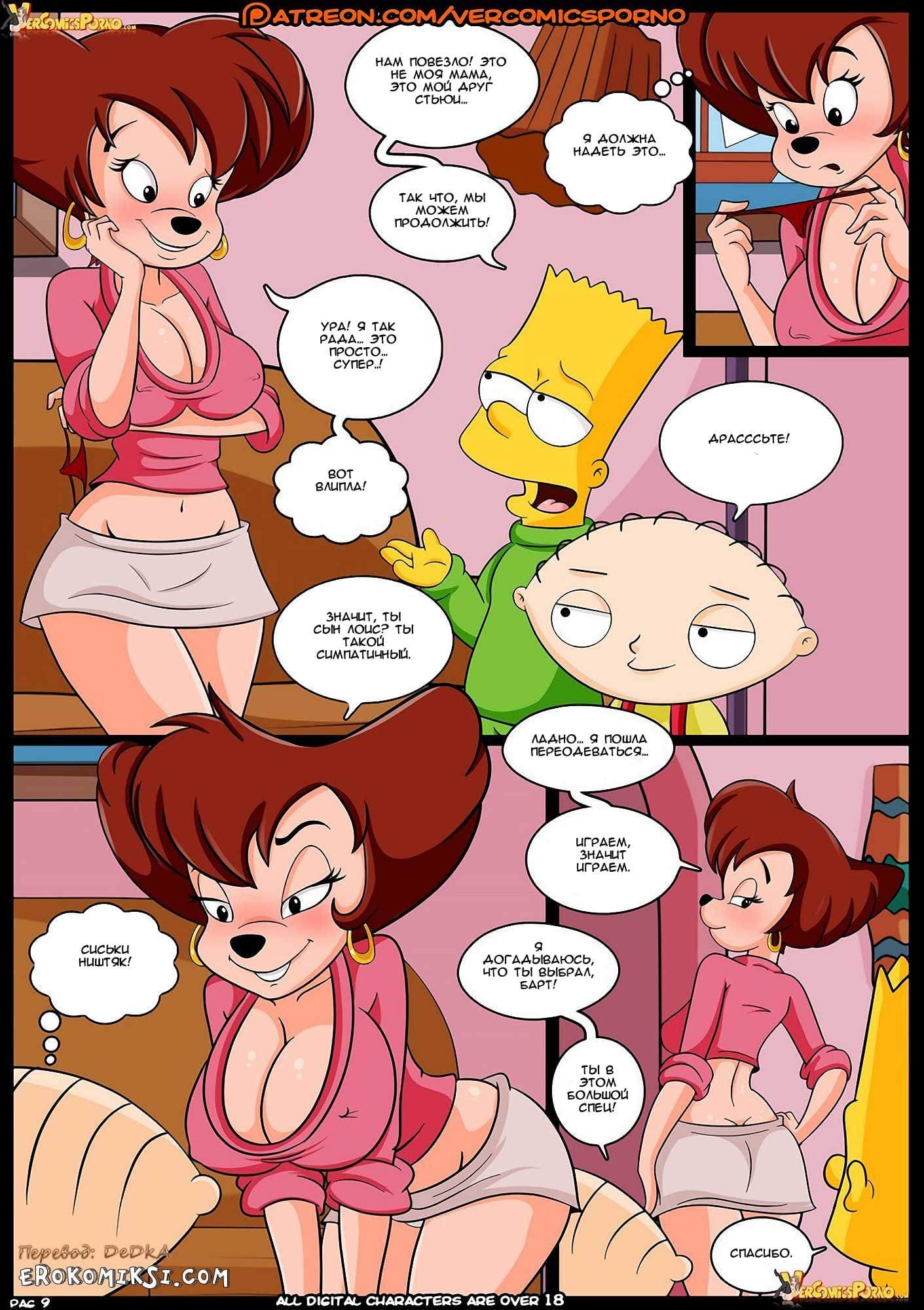 Порно комикс Конкурс 3 часть расскажет вам о том, как в то время, пока Барт, мечтательно витал в облаках, представляя аппетитную незнакомку в сексуальном нижнем белье, зрелая Пег всеми силами, пыталась привести озабоченного парня в чувство. В тот момент, когда взрослой даме это удалось, Пег попросила Барта позвонить его мамочке и спросить, когда она вернется. Но, на данный момент, единственное, о чем мог сейчас думать Барт, это о том, как трахнуть горячую подружку своей матери, и чтобы реализовать данное желание, он немедленно позвонил своему другу Стьюи…