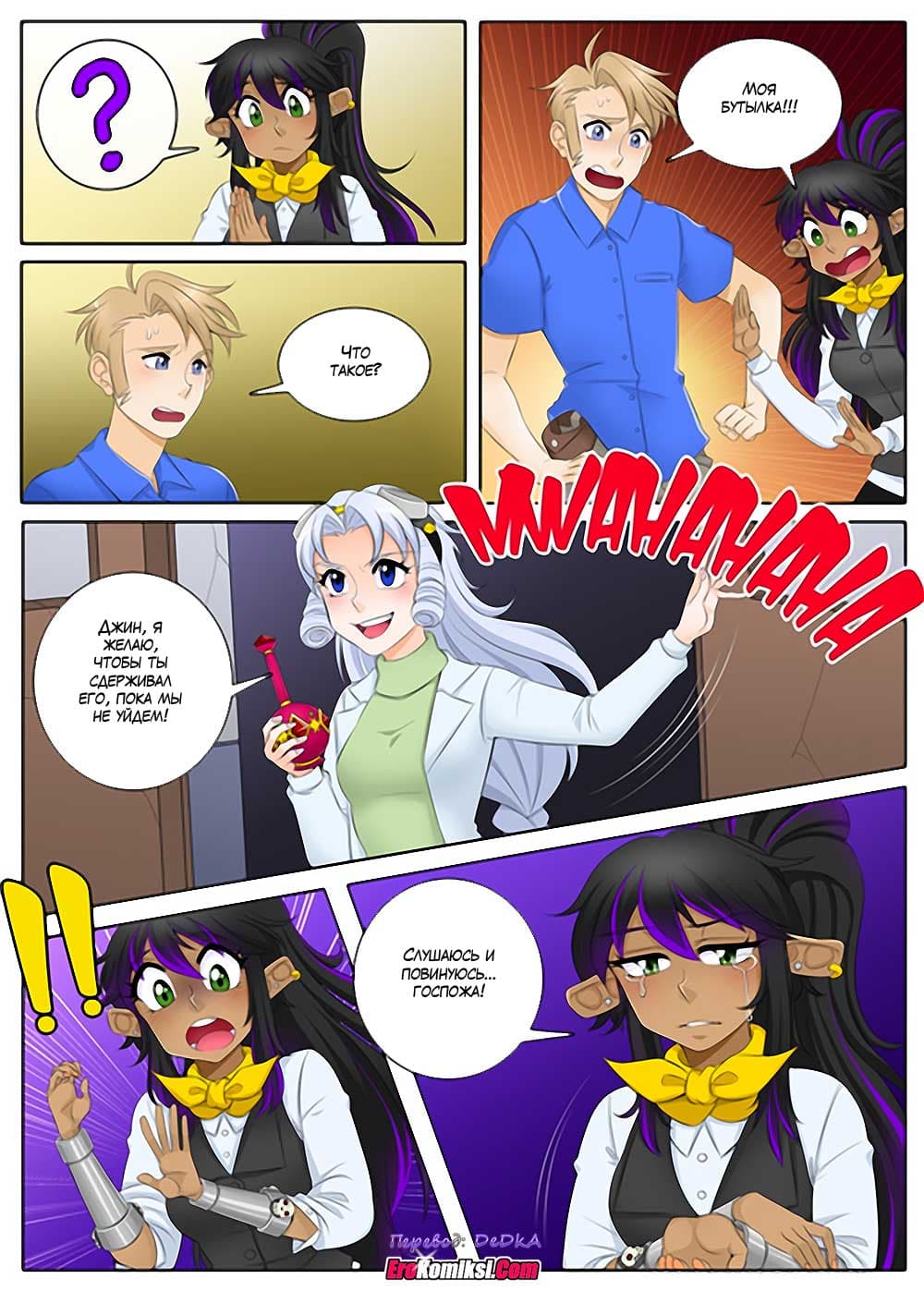 Джин из бутылки всегда подчиняется владельцу бутылки. Таковы правила джинов. Но женщина, даже если она джин, никогда не подчиняется никаким правилам и всё всегда делает так, как ей хочется. Может быть даже так, что женщина-джин загадывает желание, а хозяин бутылки выполняет его… Вот так!