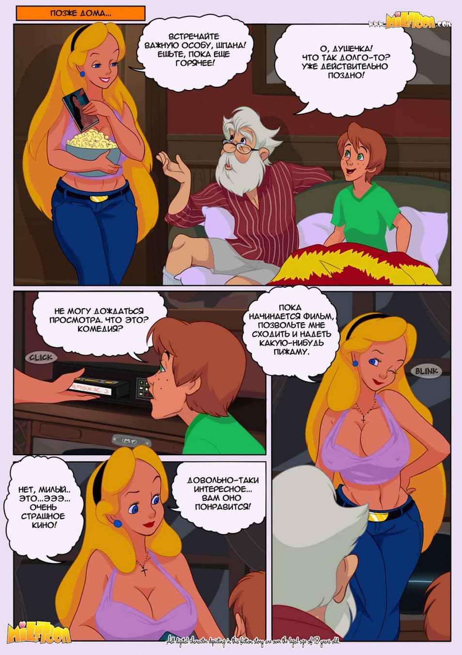 Устали ждать новые инцест комиксы? Ваши ожидания оправдались. Перед вами история о сексуальной женщине Элис, которая изменяет своему пожилому мужу с продавцом видео кассет по имени Джордж. После бурного секса она покупает у него фильм ужасов, в котором множество постельных сцен. Далее неверная женушка приносит кассету домой, где ее смотрит вся семья: она, ее старый благоверный супруг и уже выросший сын. Только Элис не могла предположить, чем закончится для нее этот вечер…