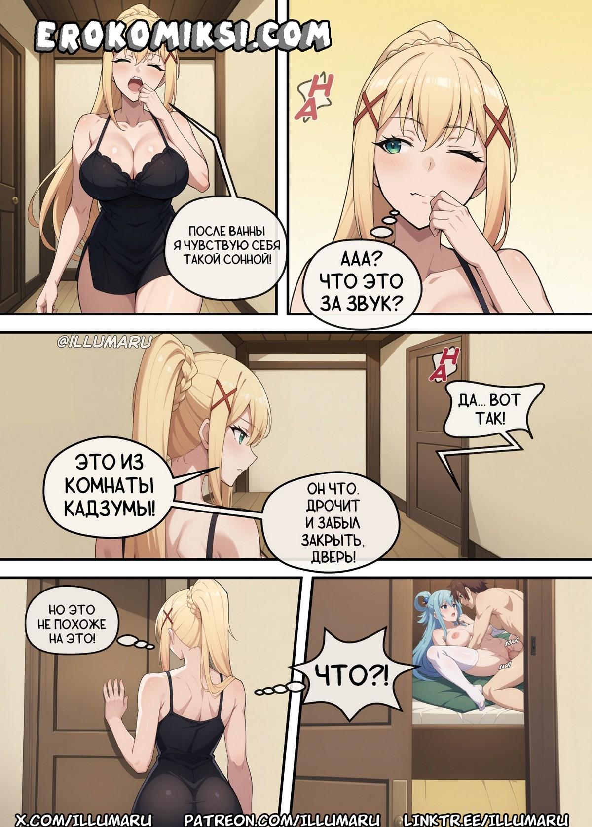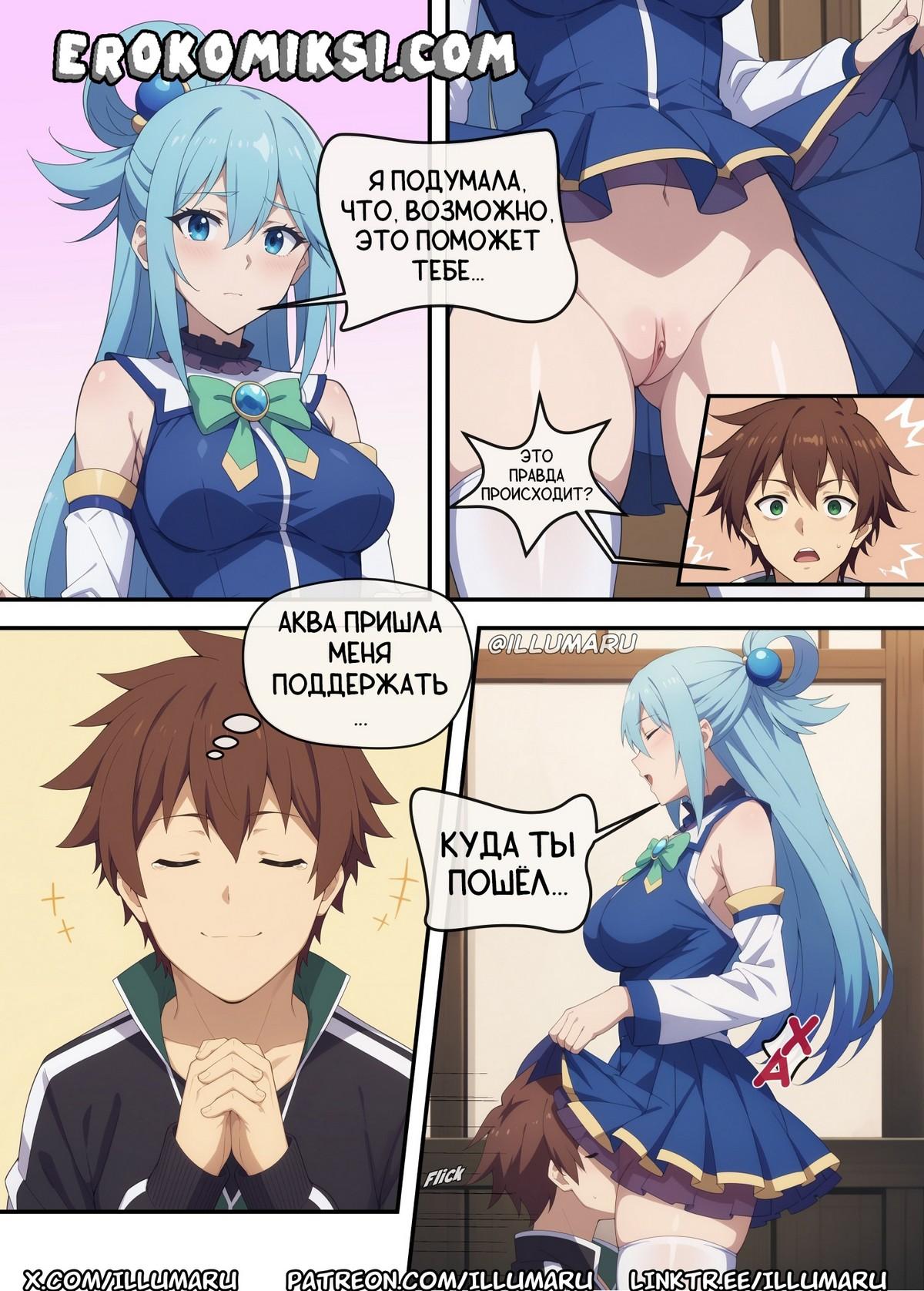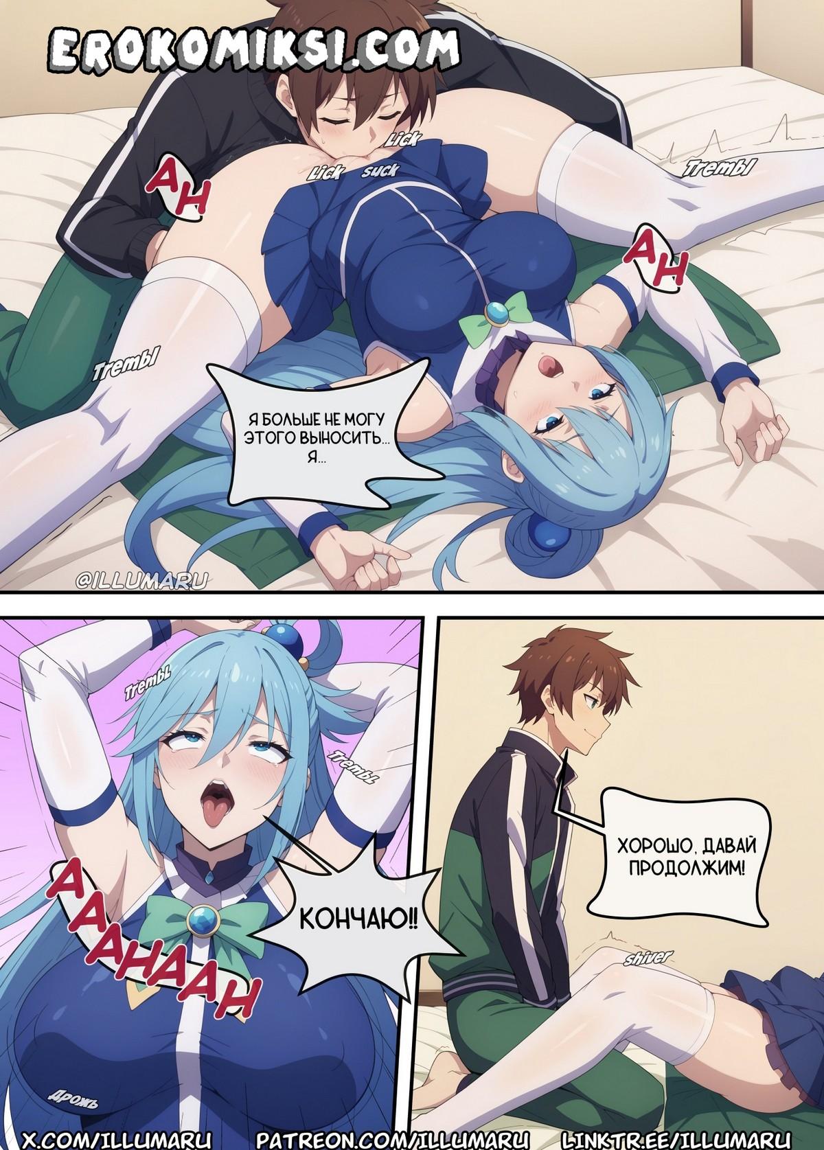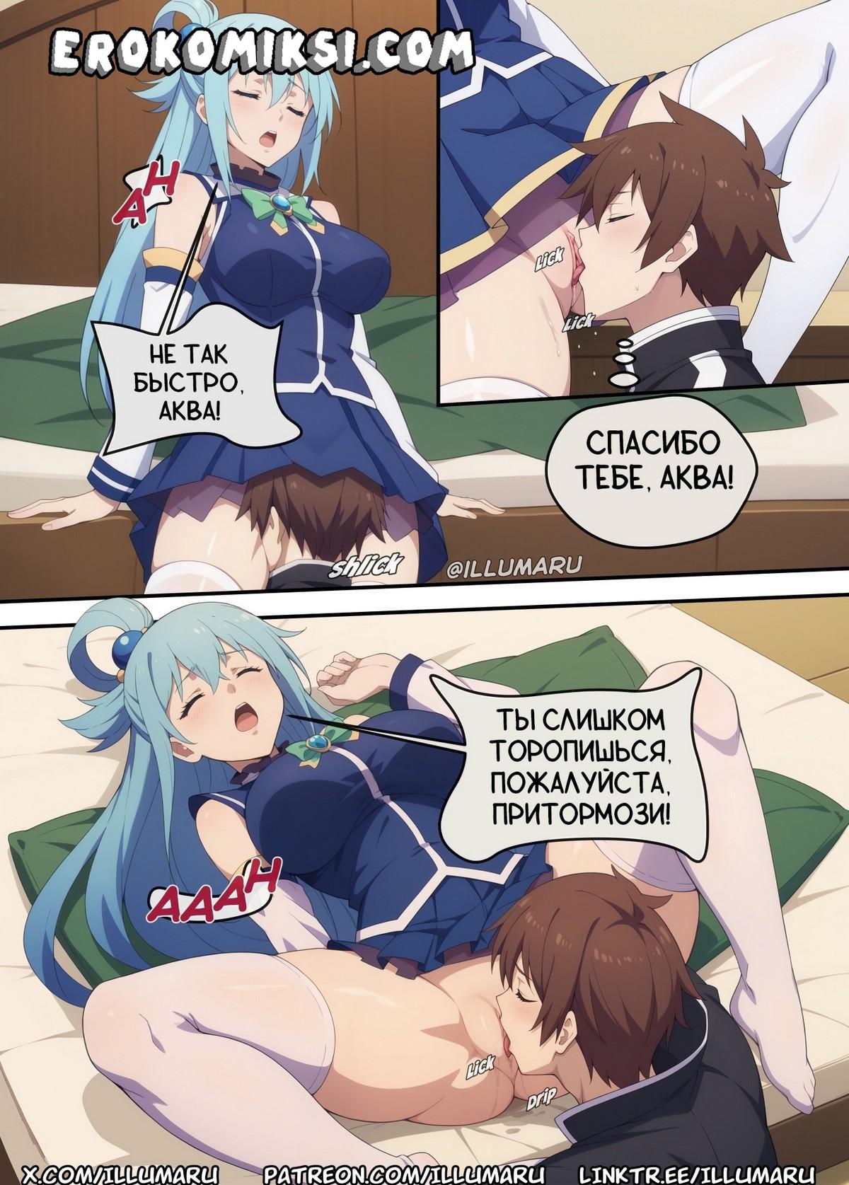 Порно комикс Лечение Кадзумы. Часть 2. В продолжение комикса Кадзуки всё-таки добирается до горячей киски Аквы и заставляет кончать её от удовольствия, пока за всем этим подсматривает Даркнес…