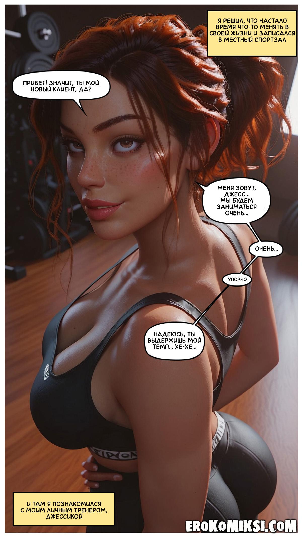 Порно комикс Личный тренер. Джейк записывается в тренажёрный зал, где его личным тренером становится красотка Джессика. Во время тренировок парень не может оторвать глаз от огромных сисек Джесс, и она это замечает, и решает немного повеселиться, она достаёт огромный член парнишки и начинает дрочить ему своими сиськами, пока тот не кончит…
