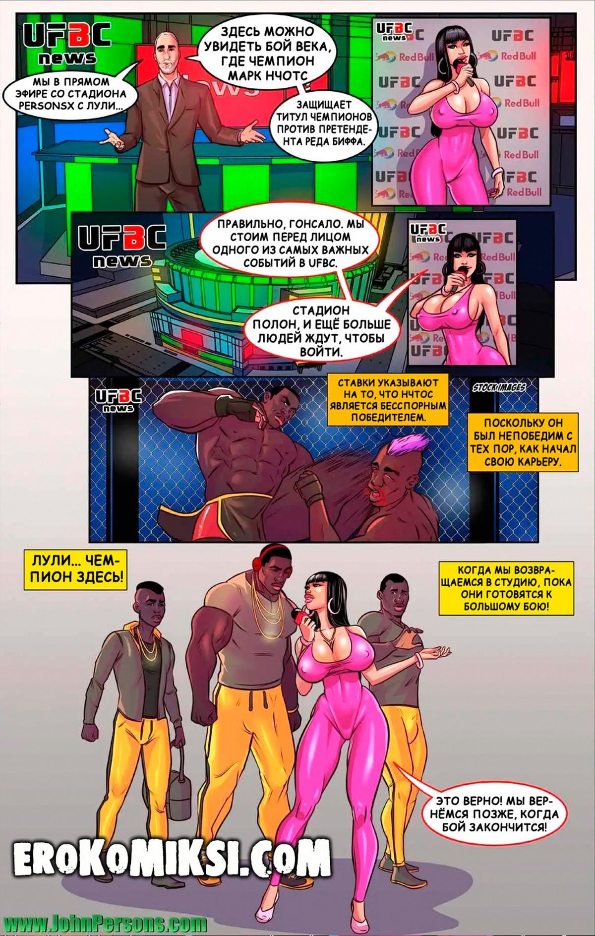 Порно комикс Лучана Феллини UFBC. Горячий репортёр Лучана очень хотела взять интервью с действующим чемпионом UFBC, но прежде чем она отдаст своё тело в распоряжению этого монстра, она должна потрахаться с его охранниками…